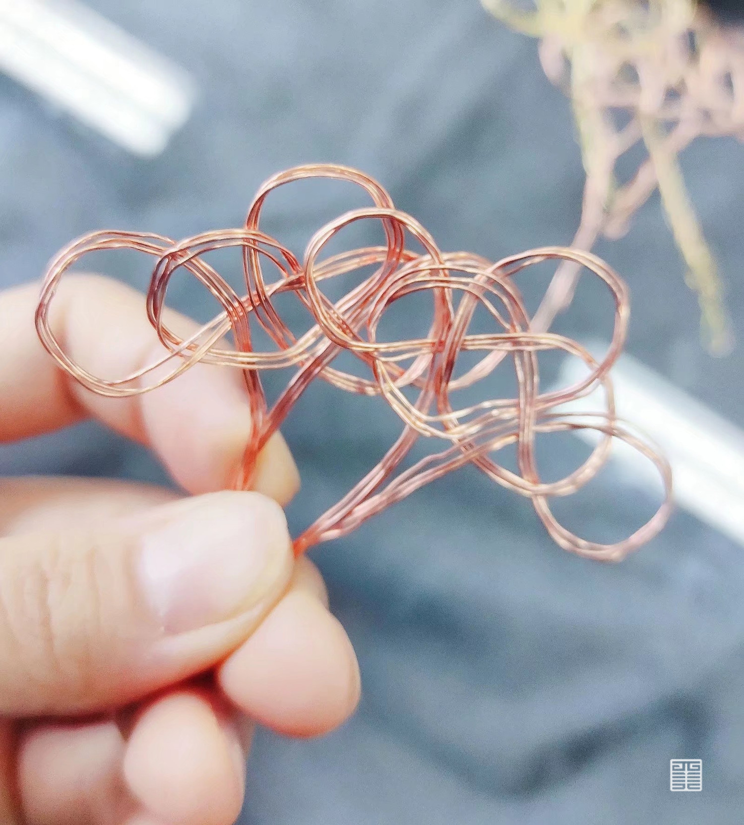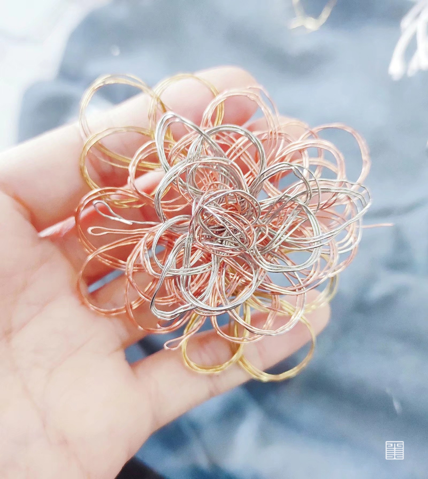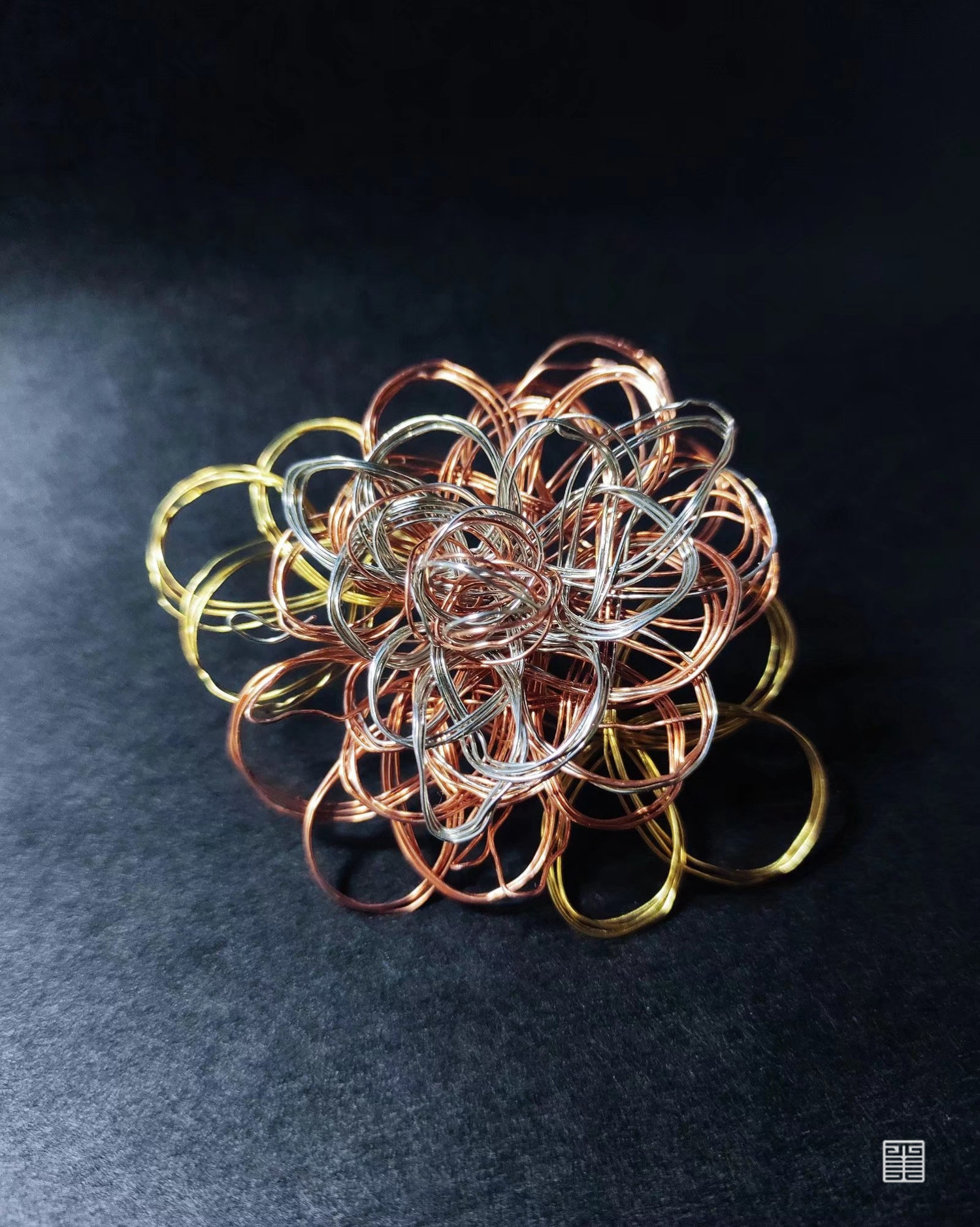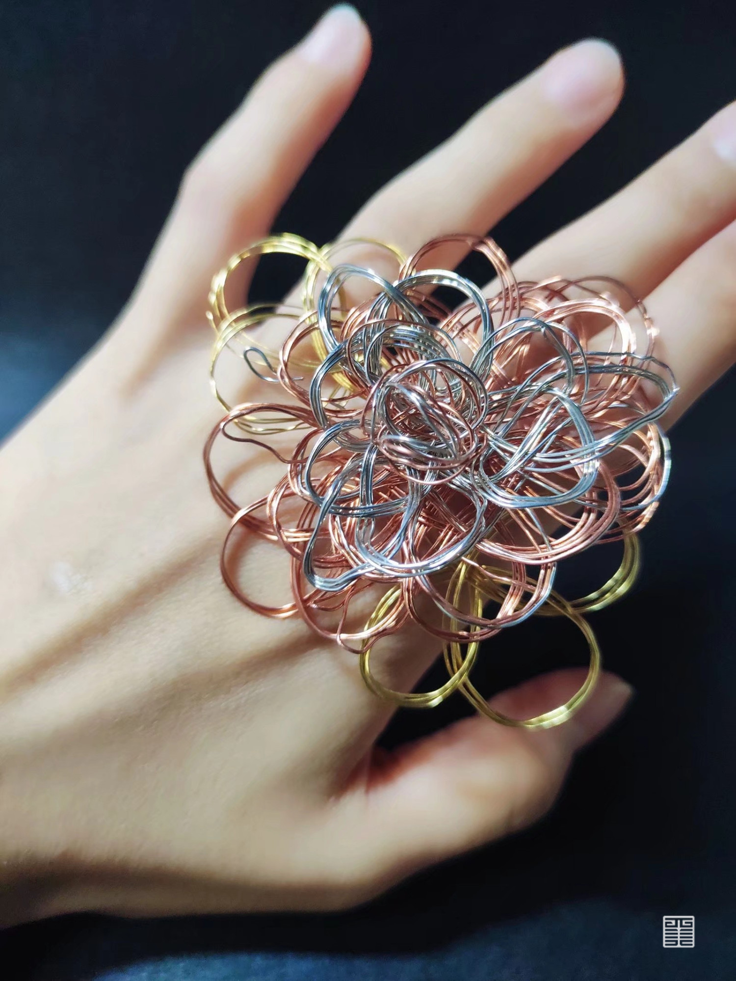 灵感来源于水引藤编的花样绕丝方法,做成团花造型,寓意吉祥,造型前卫。
