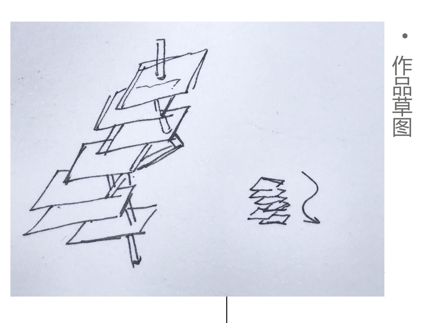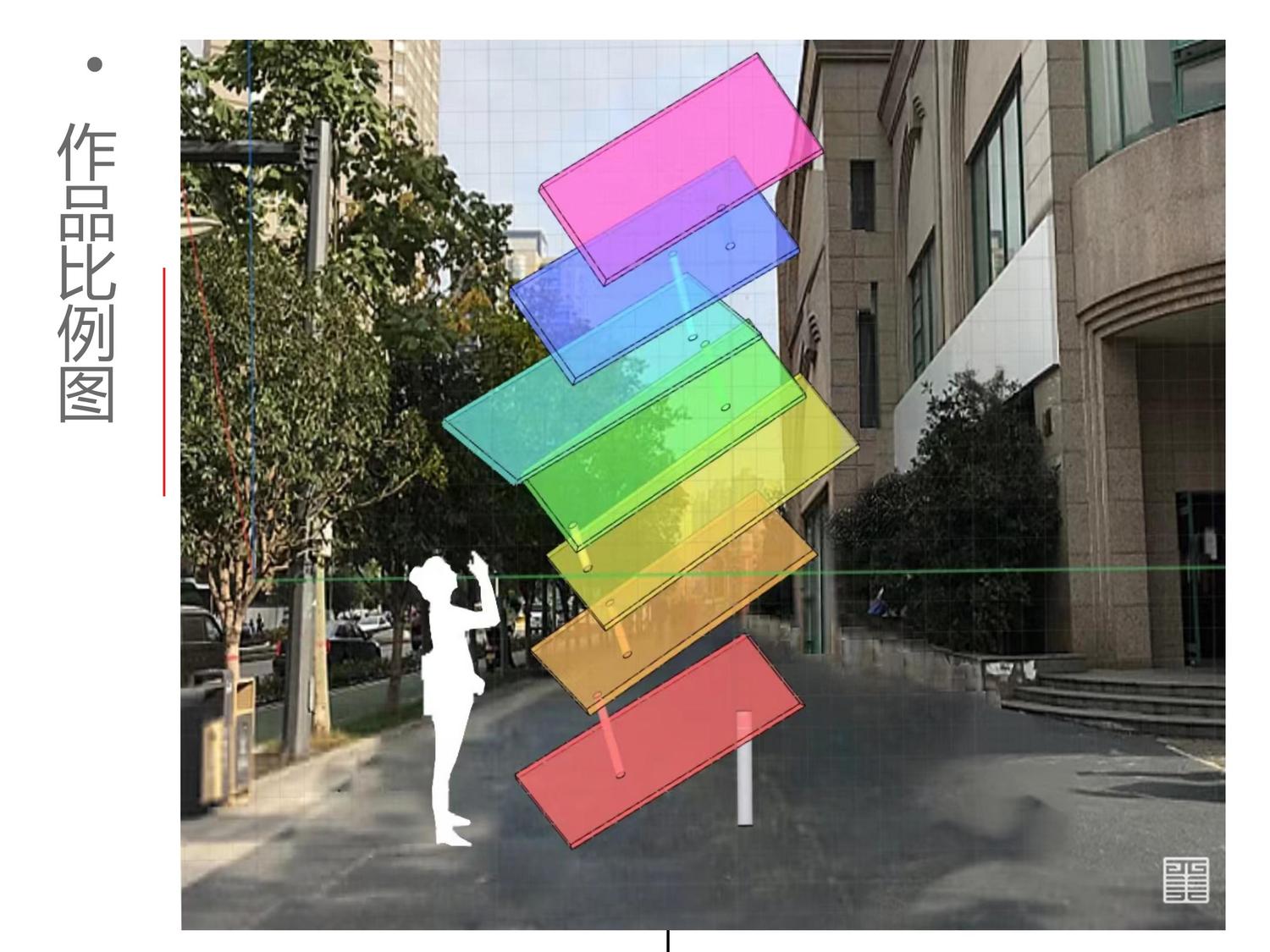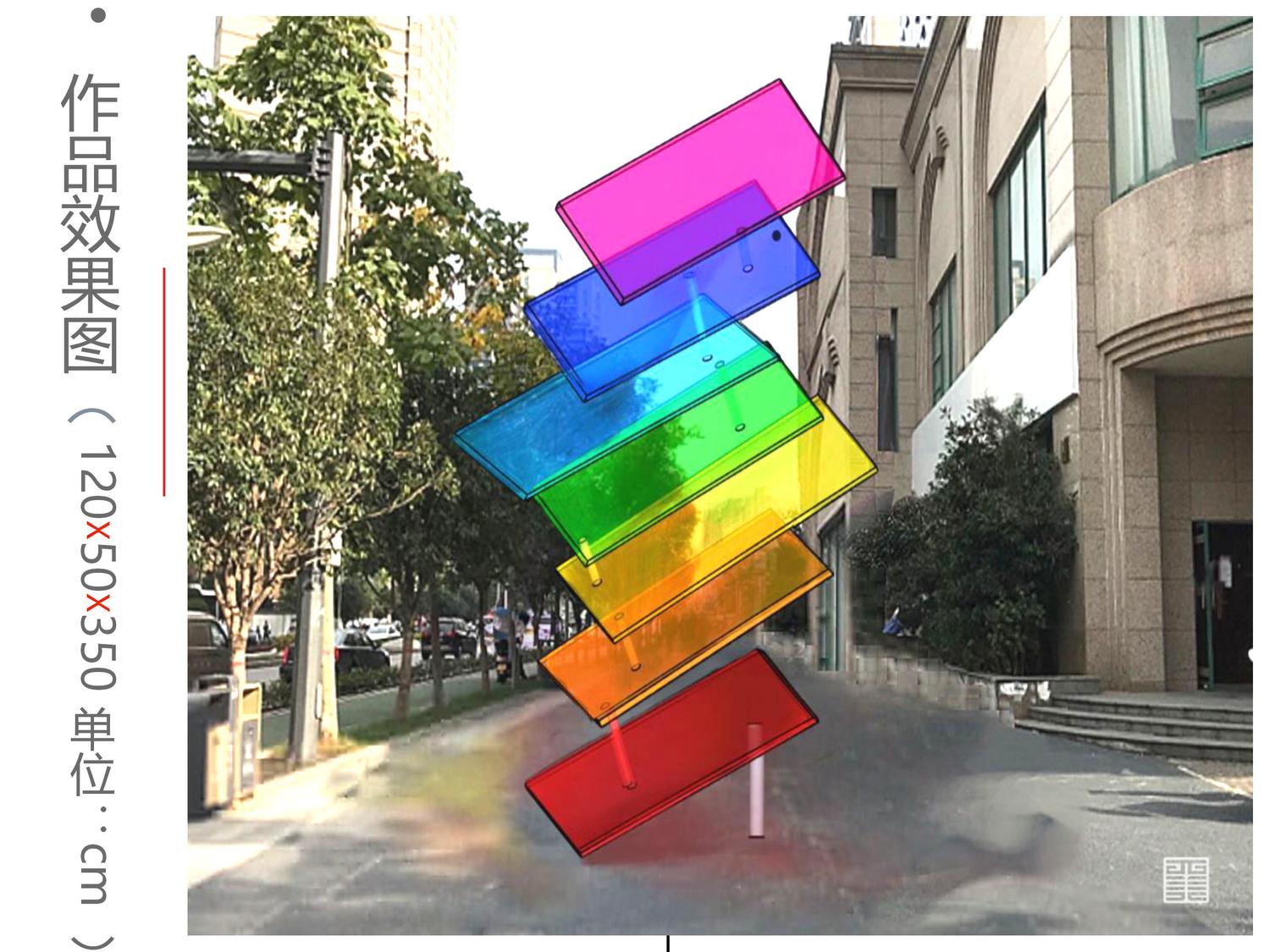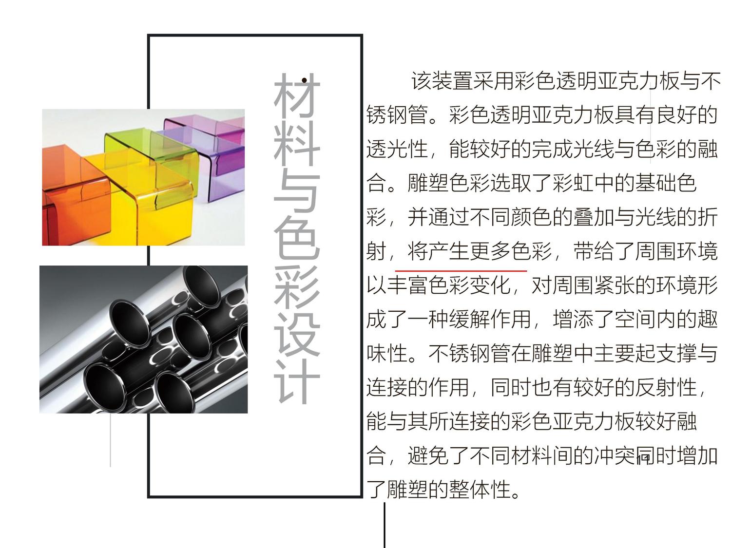 该作品由多片不同颜色的透明亚克力板以不同的朝向,用不锈钢管进行支撑连接。彩色透明亚克力板具有良好的透光性,能较好的完成光线与色彩的融合。作品色彩选取了彩虹中的基础色彩,并通过不同颜色的叠加与光线的折射,产生了大量的光影变化,带给了周围环境以丰富色彩变化。地面上斑驳的色彩光影与周围环境人群产生了一定的互动性,对周围紧张的环境形成了一种缓解作用,增添了空间内的趣味性与新鲜感。不锈钢管在作品中主要起支撑与连接的作用,同时也有较好的反射性,能与其所连接的彩色亚克力板较好融合,避免了不同材料间的冲突,同时增加了该装置的整体性。作品成本较为适中,同时作品加工方式也较为简易,方案整体可实施性较高。