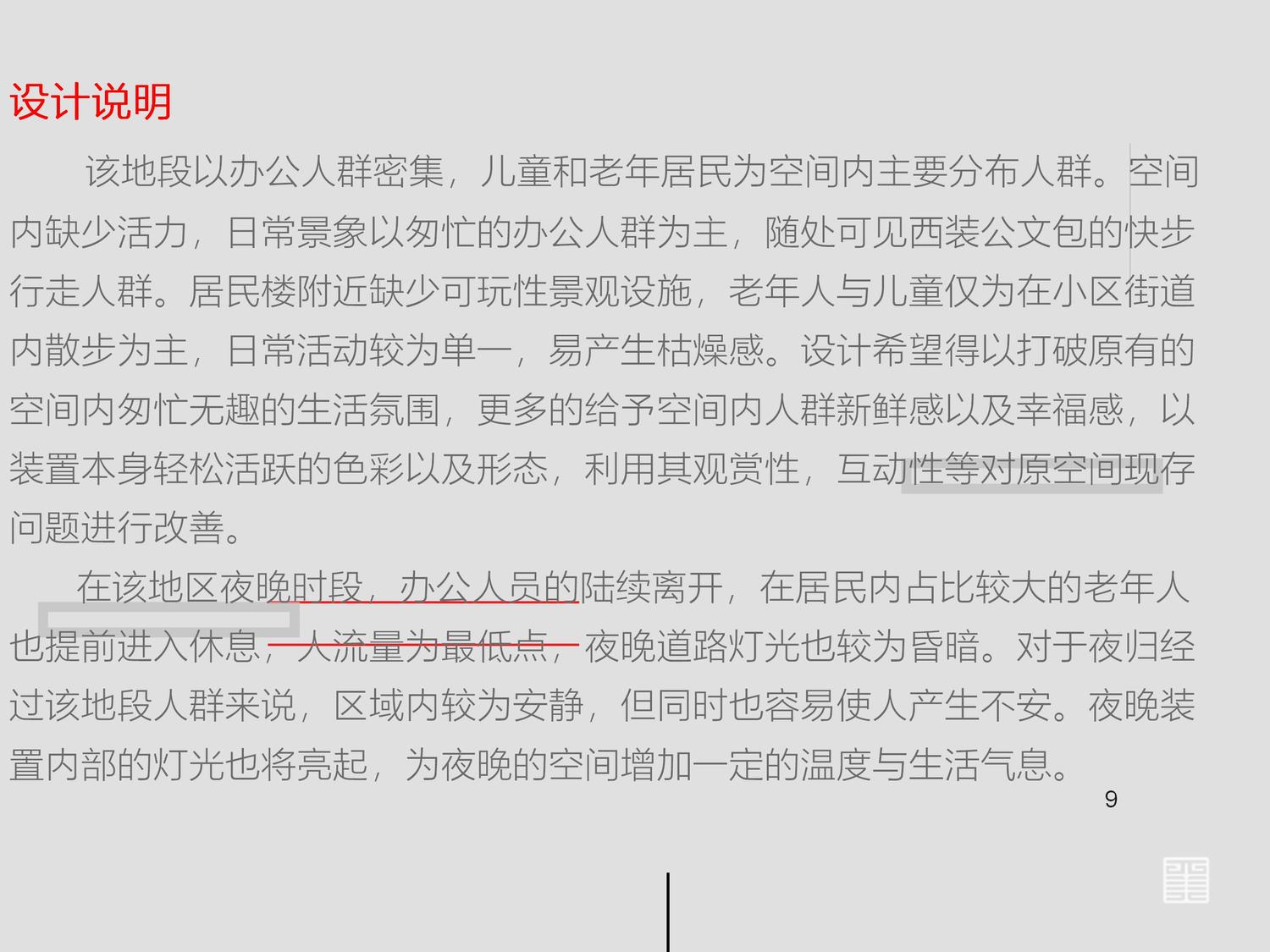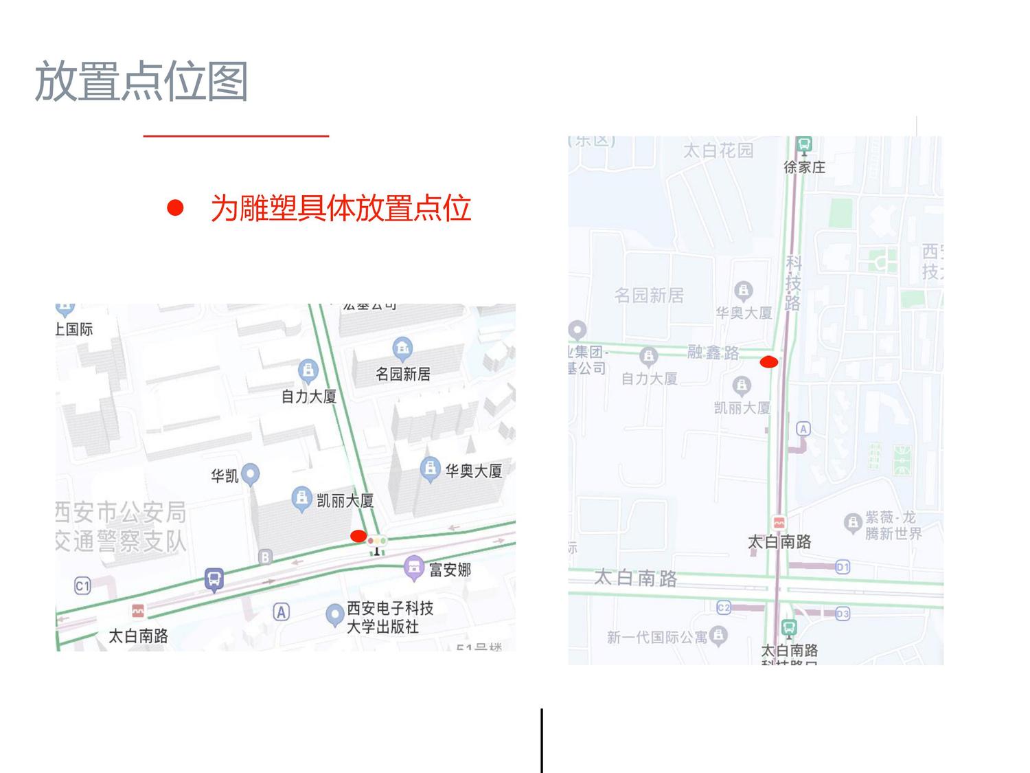 作品放置于西安市高新区科技路与融鑫路交汇处,该地段以办公人群密集,老年及幼儿居民占比较多为空间内主要特点。空间内缺少活力,日常景象以匆忙的办公人群为主,随处可见西装公文包和快步行走的人群。居民楼附近缺少可玩性景观设施,老年人与儿童仅为在小区街道内散步为主,日常活动较为单一,易产生枯燥感。设计希望得以打破原有的空间内匆忙无趣的生活氛围,更多的给予空间内人群新鲜感以及幸福感,以装置本身轻松活跃的色彩以及形态,利用其观赏性,互动性等对原空间现存问题进行改善。