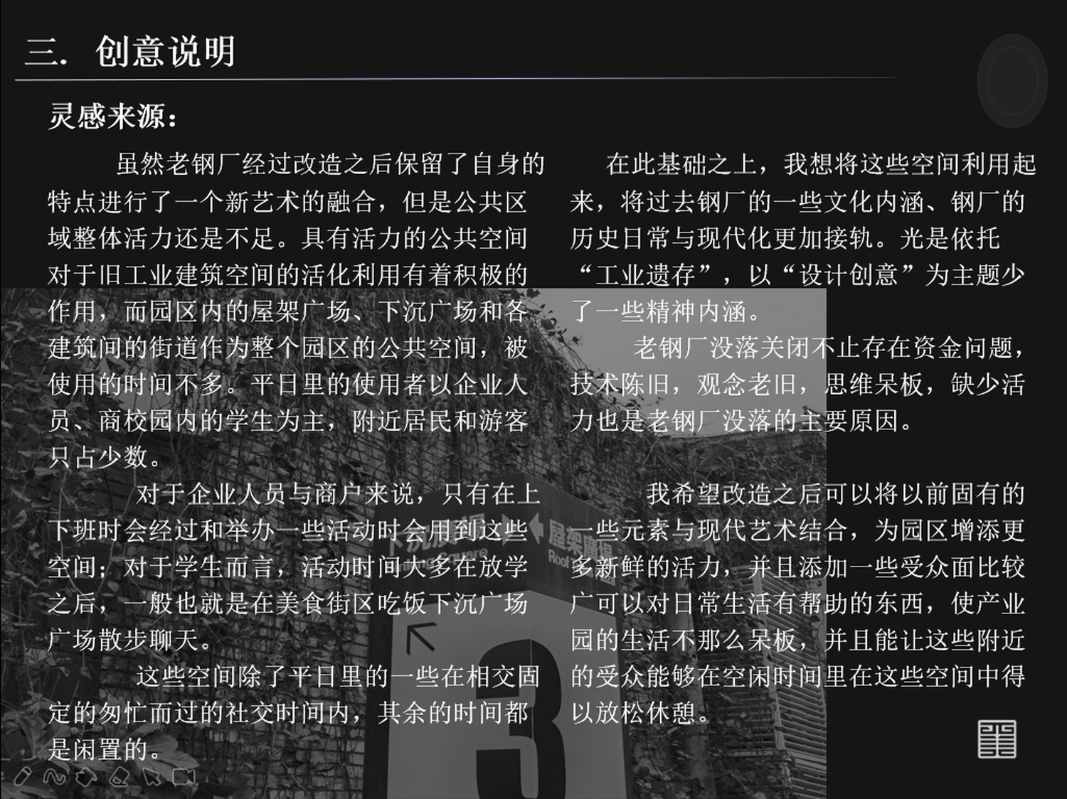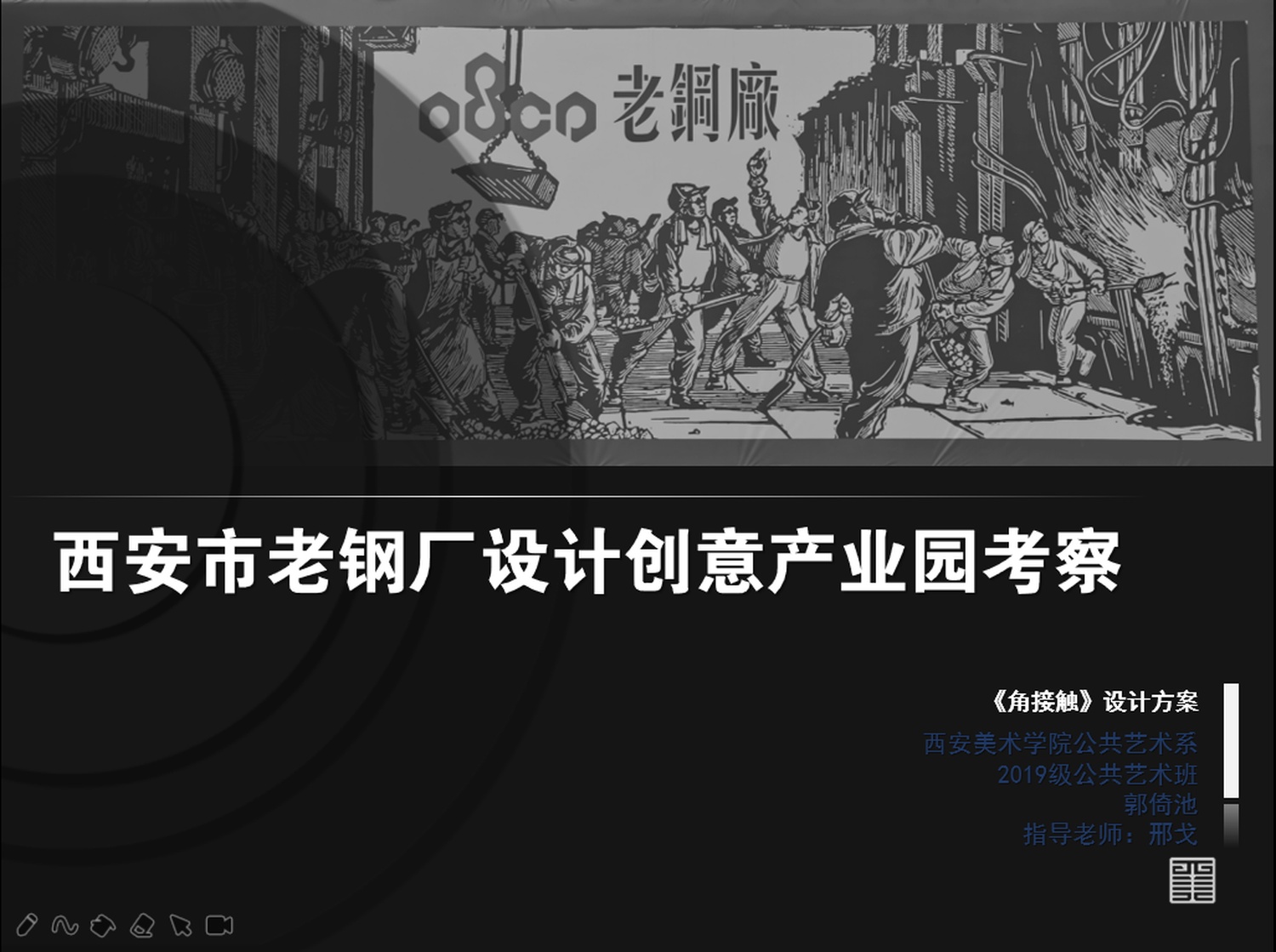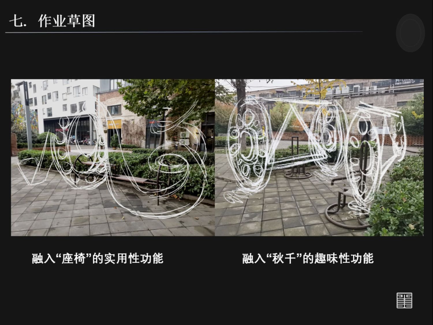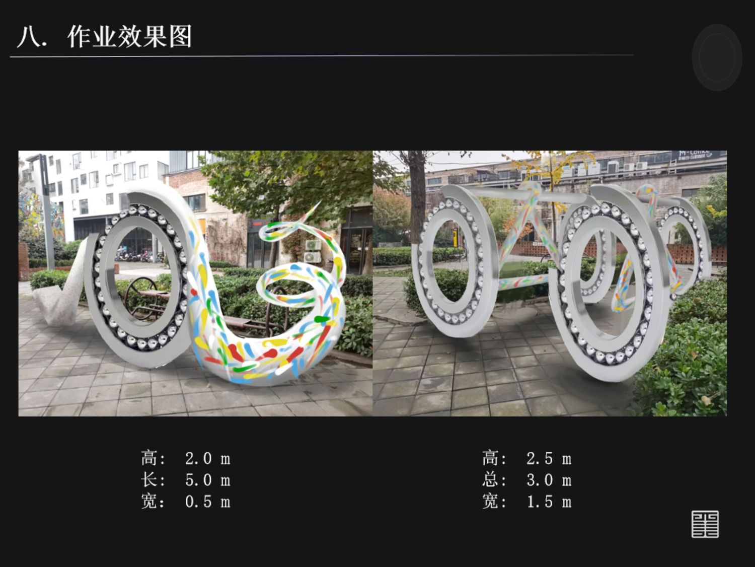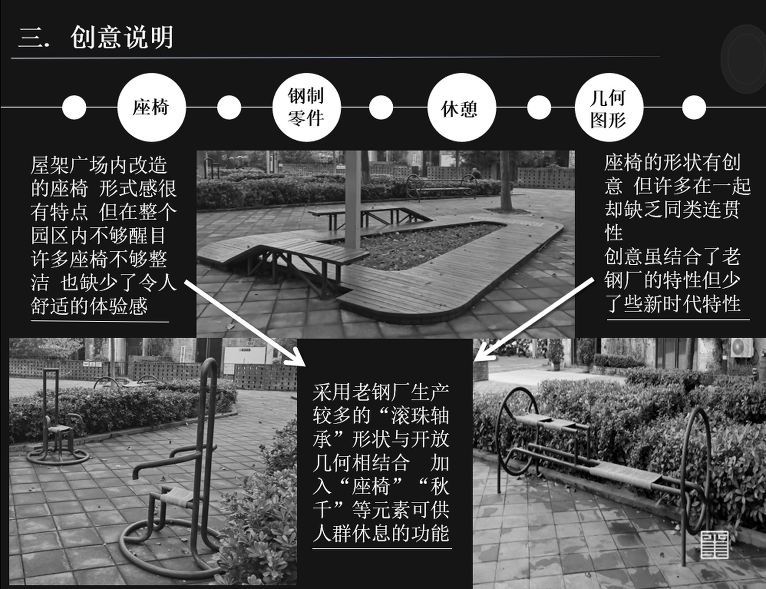 作品的选材采用老钢厂生产较多的“滚珠轴承”形状与开放几何相结合 加入“座椅”“秋千”等元素可供人群休息的功能