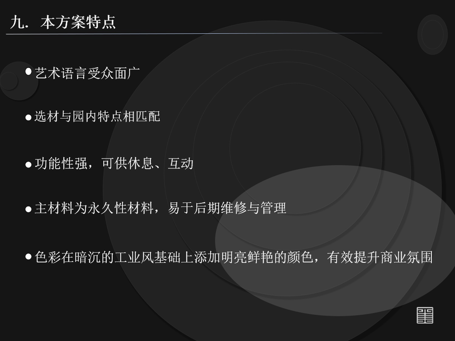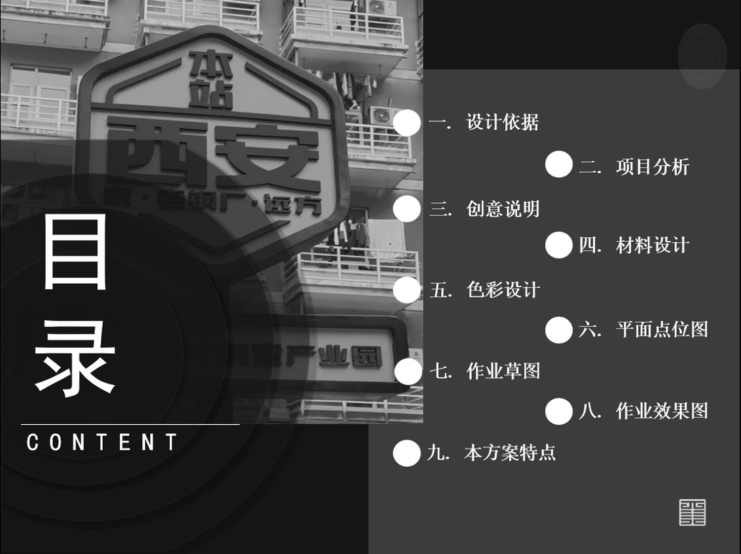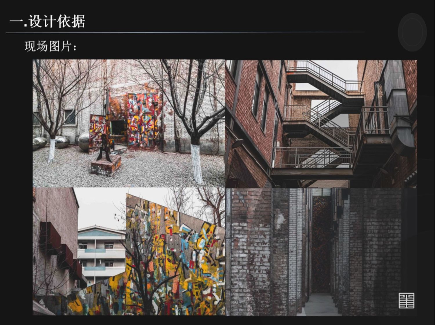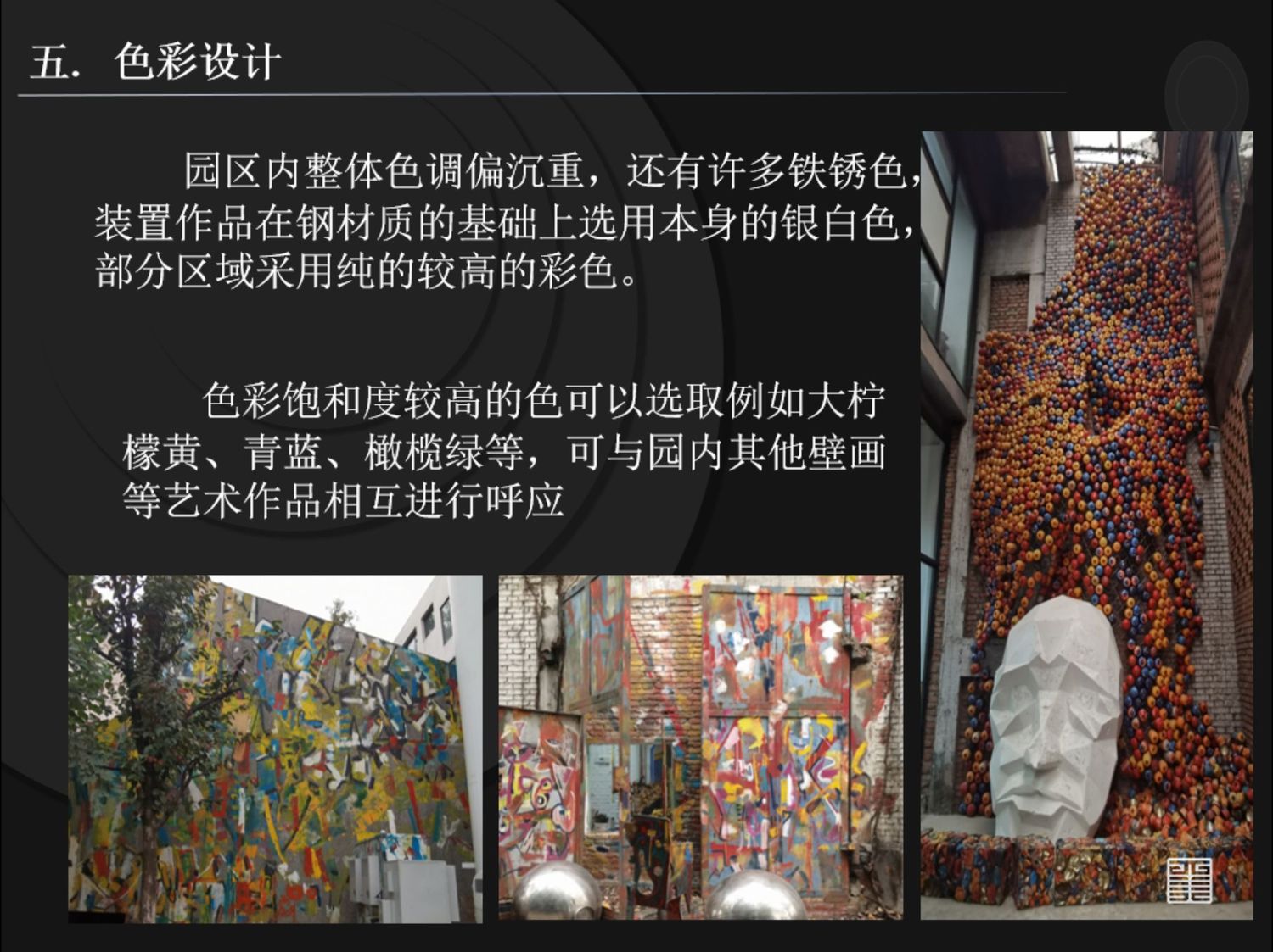 装置作品在钢材质的基础上选用本身的银白色,部分区域采用纯的较高的彩色。色彩饱和度较高的色可以选取例如大柠檬黄、青蓝、橄榄绿等,可与园内其他壁画等艺术作品相互进行呼应。
