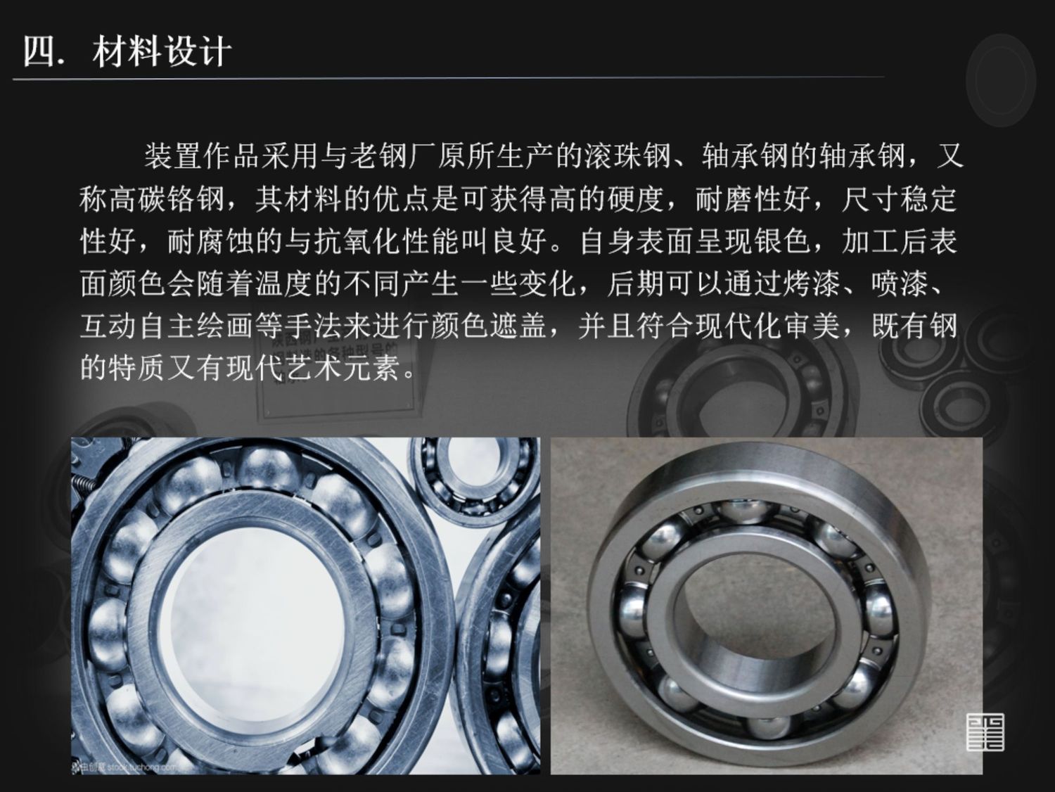 装置作品采用与老钢厂原所生产的滚珠钢、轴承钢的轴承钢,又称高碳铬钢,其材料的优点是可获得高的硬度,耐磨性好,尺寸稳定性好,耐腐蚀的与抗氧化性能叫良好。自身表面呈现银色,加工后表面颜色会随着温度的不同产生一些变化,后期可以通过烤漆、喷漆、互动自主绘画等手法来进行颜色遮盖,并且符合现代化审美,既有钢的特质又有现代艺术元素。