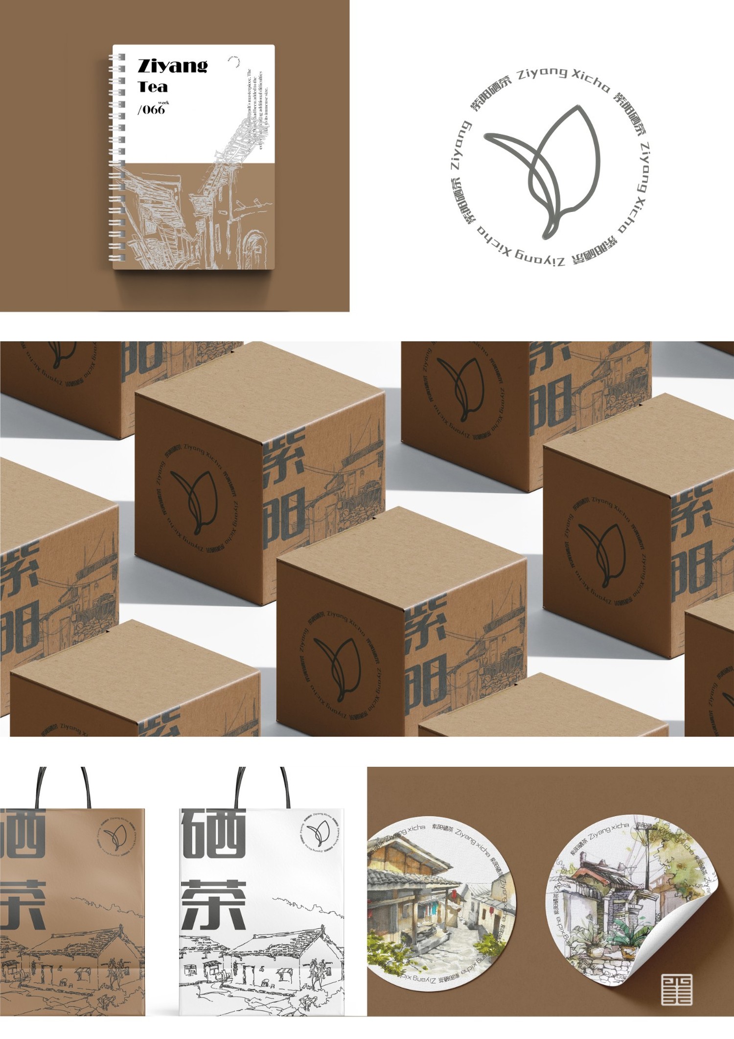 通过运用写生时所做作品以及对写生过程中的感受,制作了相应的文创作品。以紫阳硒茶及茶叶品牌为主,衍生纸袋、标签等文创产品。