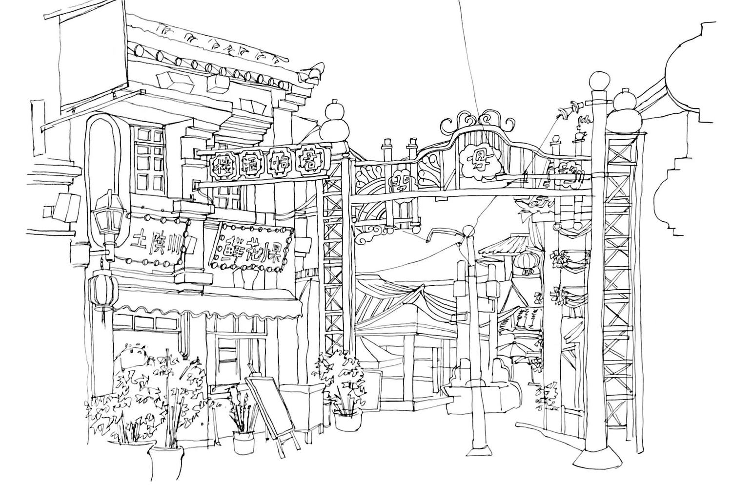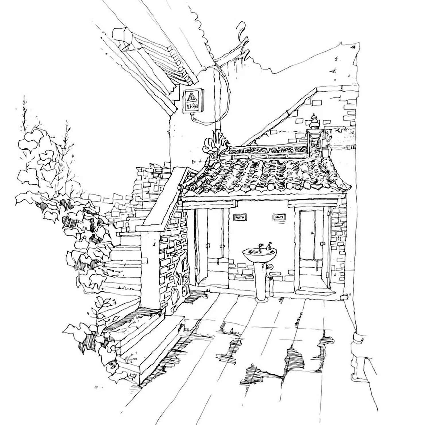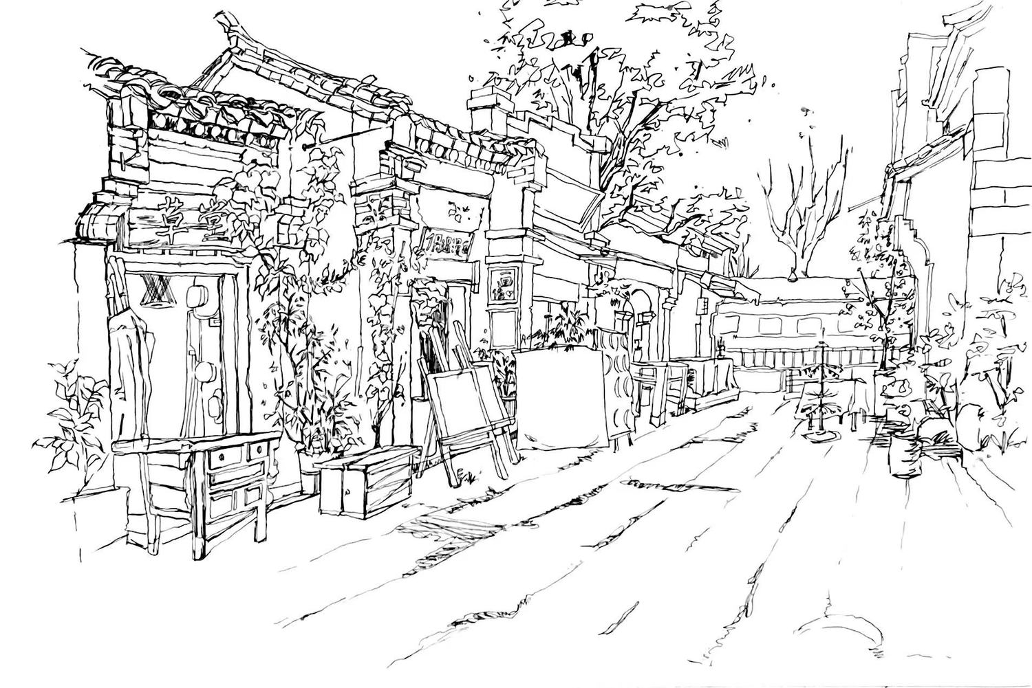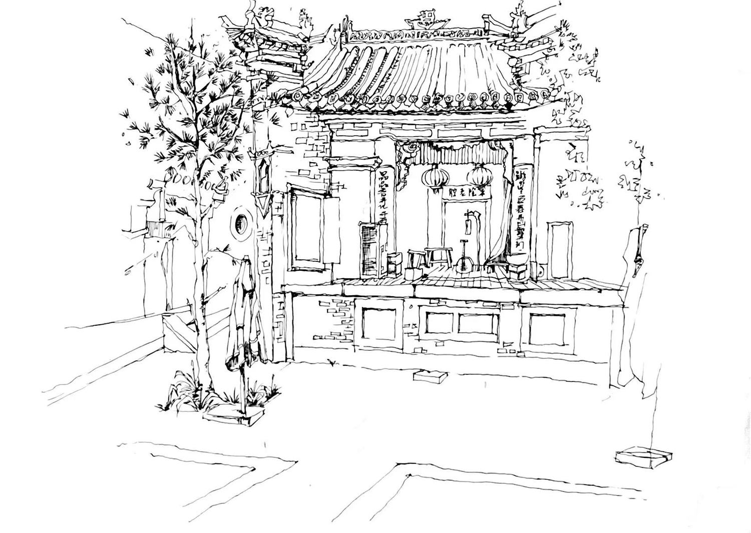 其中一幅在关中民俗博物馆画的令我印象深刻,当时下着淅淅沥沥的小雨,我坐在屋檐下正在想画什么好,突然一阵悦耳的音乐声传入我的耳朵,是大舞台上的老爷爷在拉二胡,于是我便拿起笔画下了这一幕。
