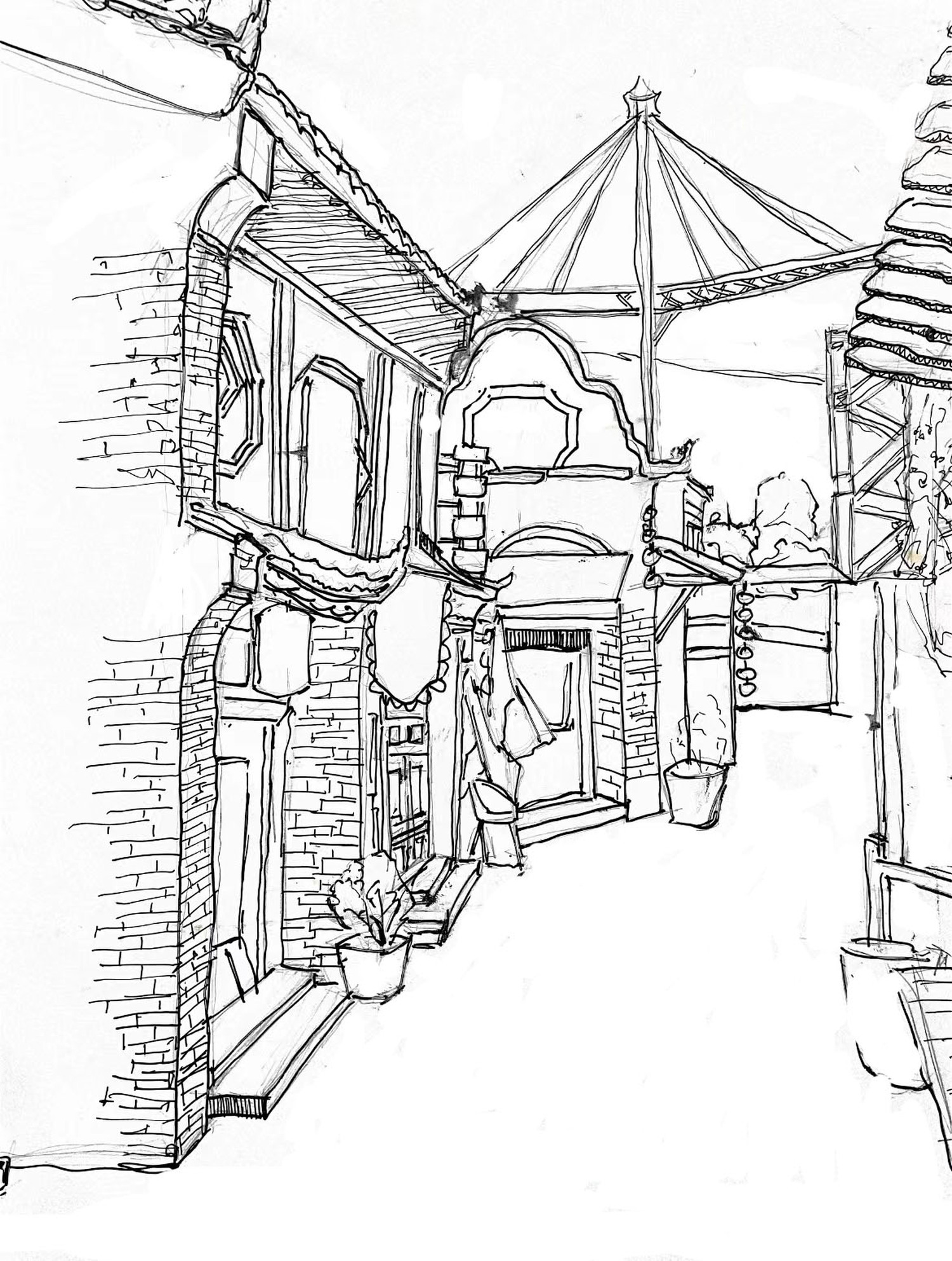 第三张也是在白鹿仓绘制的,地点是茶楼后的街区。利用一点透视来进行表示,前面刻画一些墙砖后面放松,在后面加入了一个高塔让背景不会全空白。