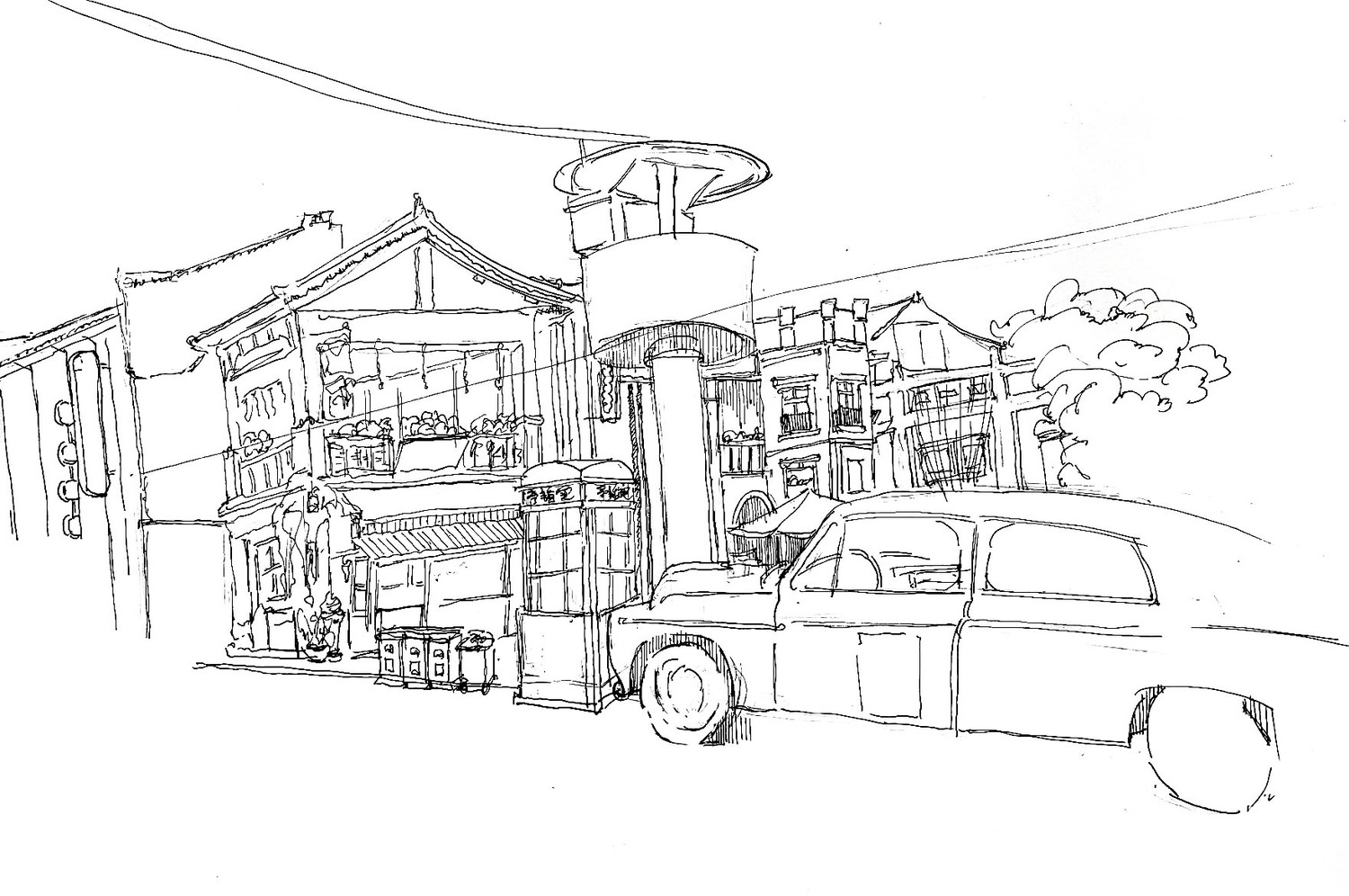 第二张是在白鹿仓民国街里绘制的,中间进行细节刻画两边放松,树木用概括的方法表现出层次感,这个车也是我喜欢这个景的原因,后边进行虚化的处理,车用大部分留白和后面的细节景进行对比,让画面能有节奏感。