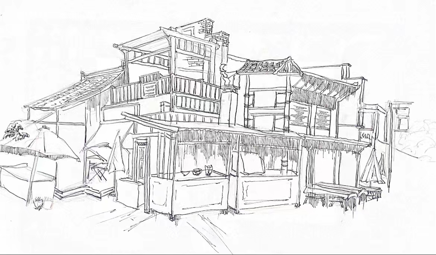 第一张是在白鹿仓的小吃街附近写生的,由这些房子一层层叠起来,画起来会更有层次感,也是我选择取这个景的原因,看起来会很紧凑,有细节的房檐也有概括的部分。