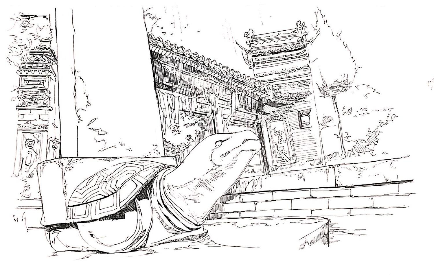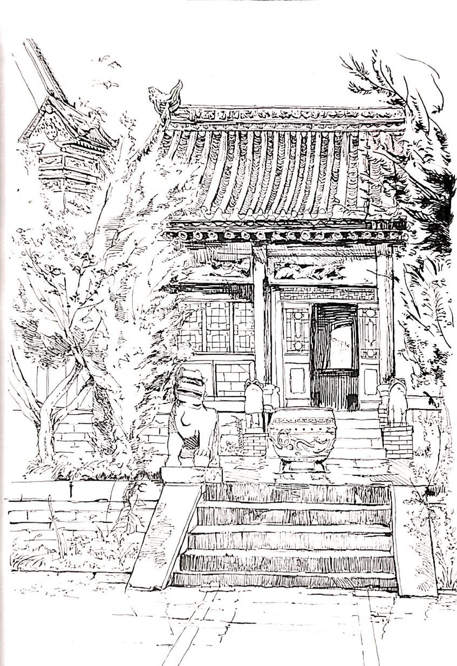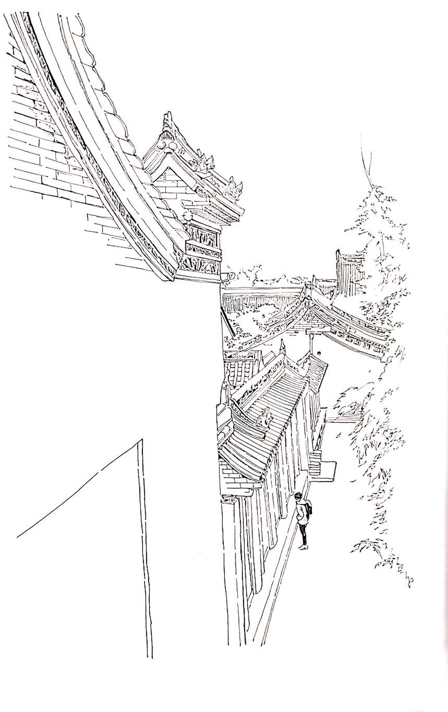 第一幅作品在关中婚嫁收藏馆,主要兴趣点在于高耸的马头墙和远处的屋檐形成的空间叠压关系;第二幅作品在本地的香火庙旁边,以赑屃作为主要的观察对象;第三幅作品在构件收藏馆面前的院子前取景,展现了院子的一小块意趣。