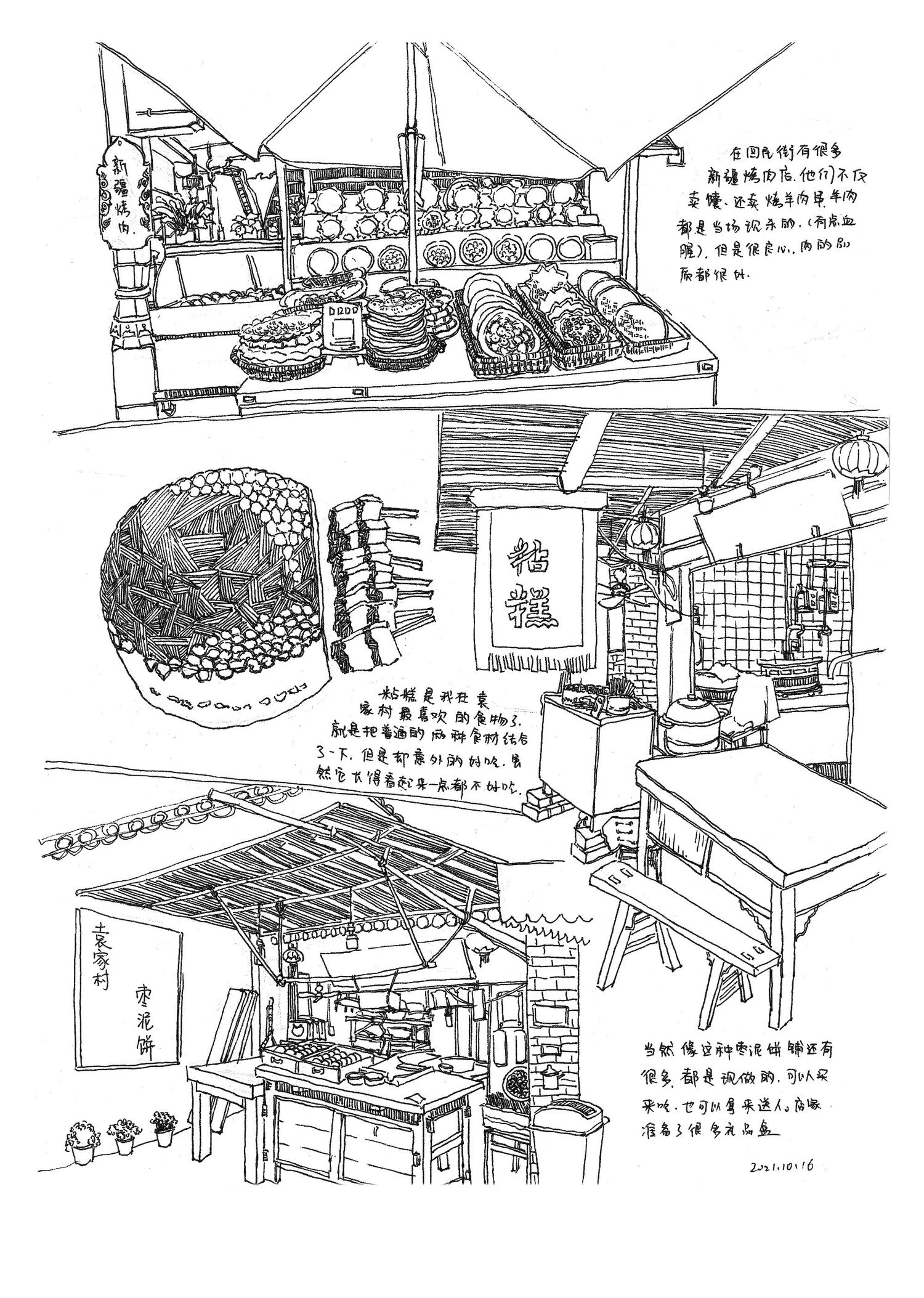 第二幅画中的甑糕是我的最爱,每天都要买一份,还有烤羊肉串,隔着好远都能闻到它的味道。