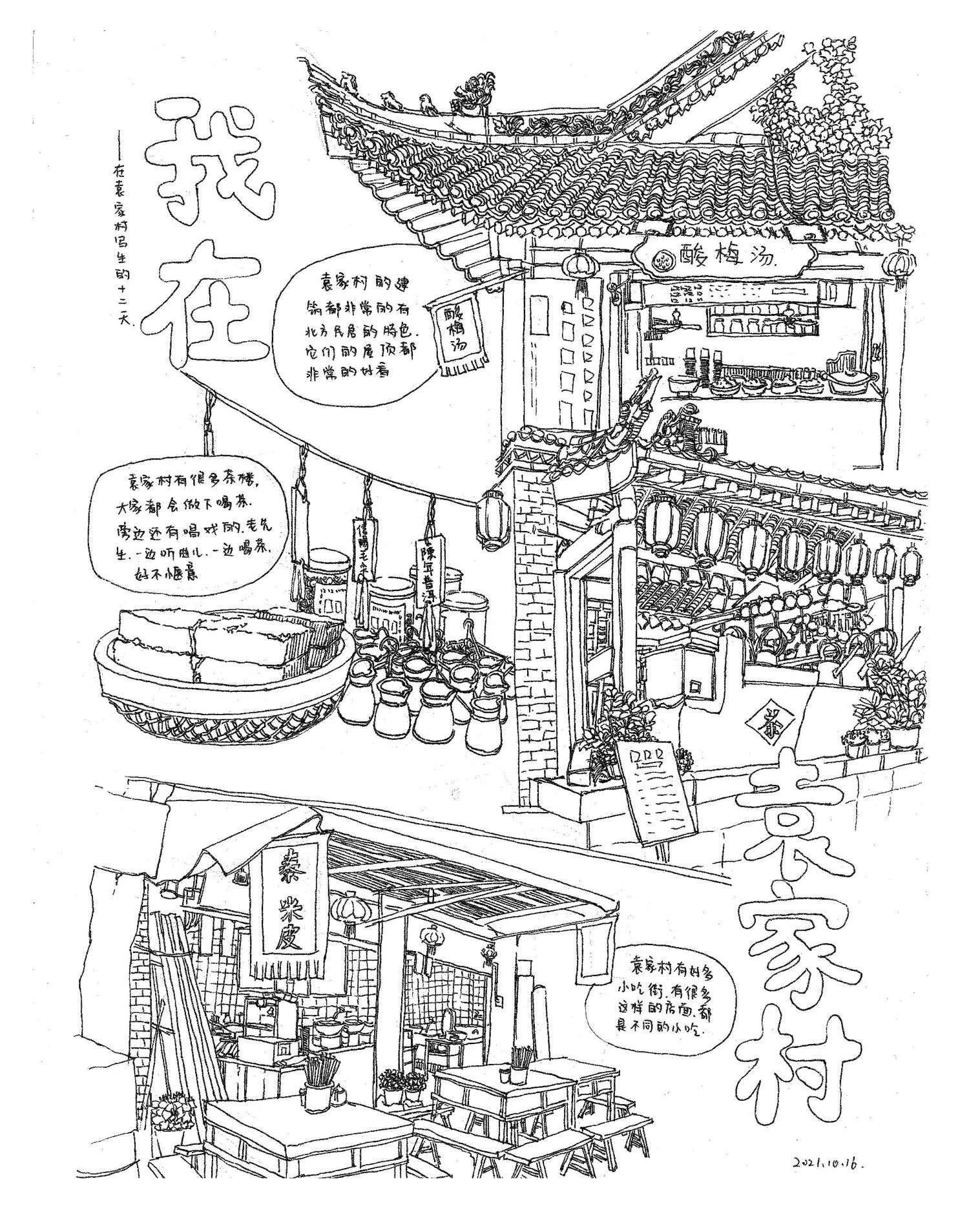 第一幅画中的茶楼是我们在袁家村的“最爱”,每次经过都能碰到好多同学,不仅是因为它看起来非常美观还可能是茶楼提供了很多桌椅的原因吧。我们也经常在早晨 去这样的店铺吃一些热腾腾的早,这些店铺虽然很小但都被收拾的 很干净,阿姨们也很热情。