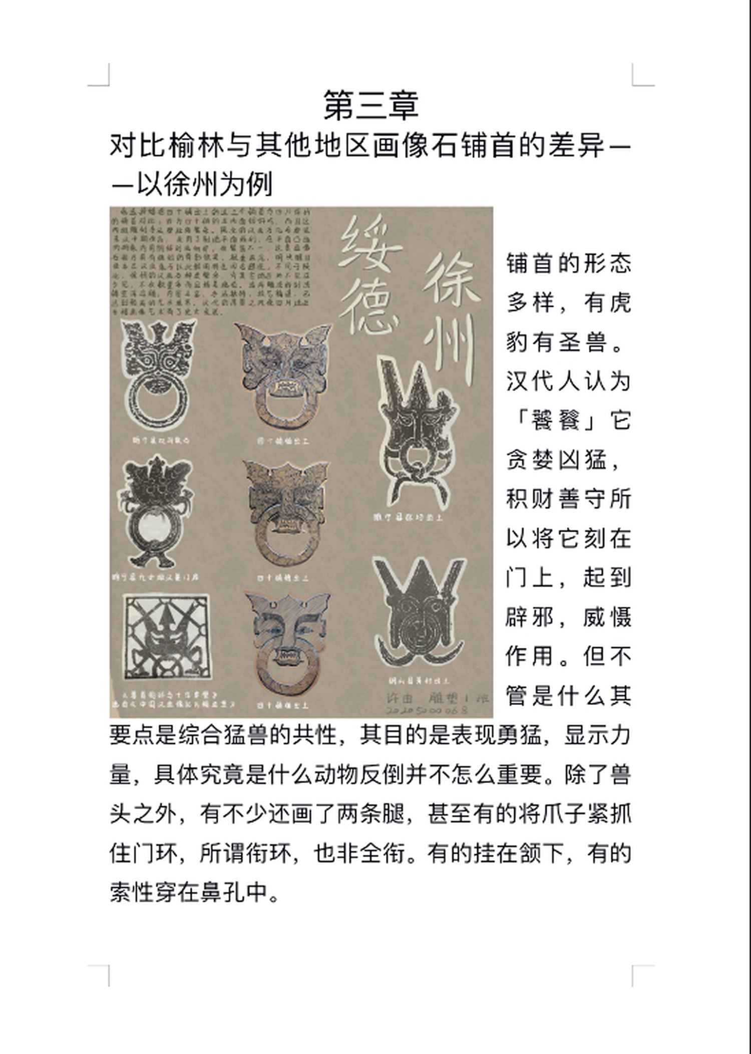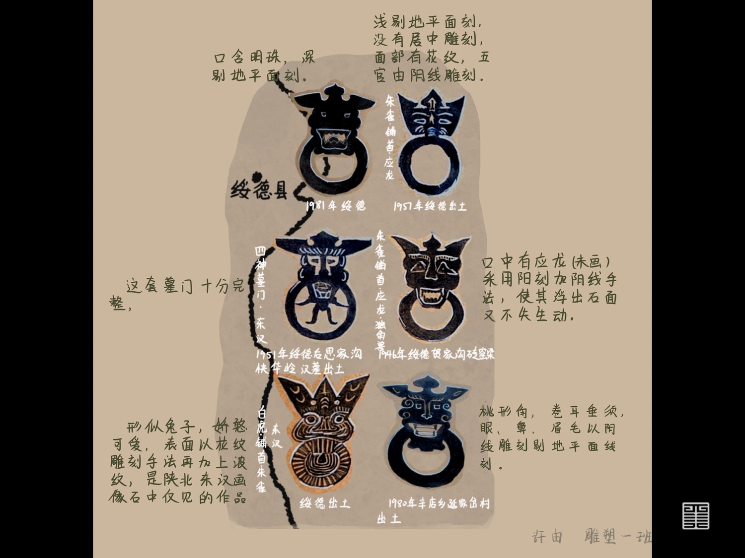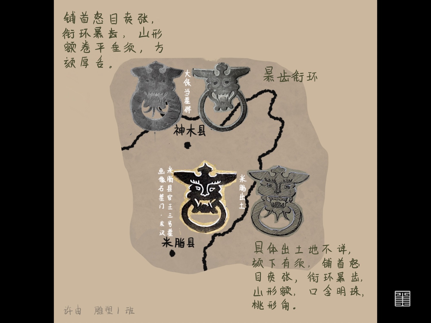汉画像石是一种祭祀性丧葬艺术,从西汉晚期到东汉末,伴随着疯狂涌动的厚葬风潮,汉画像石在社会上流行了近三个世纪之久。不仅是汉以前中国古典艺术展的巅峰,而且对汉以后的艺术也产生了巨大而深远的影响,在中国美术史上占有承前启后的重要地位。汉代墓葬凡有画像石者,不论多少几乎必有“铺首衔环”,因为他们是门的标志,同时也有守护之意。本文将以铺首展开浅析汉代艺术。