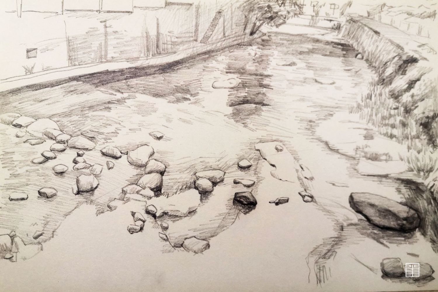 到了青木川古镇看到了一条小溪,养活了一个镇子的人,觉得小溪甚是伟大,随手就画了下来。