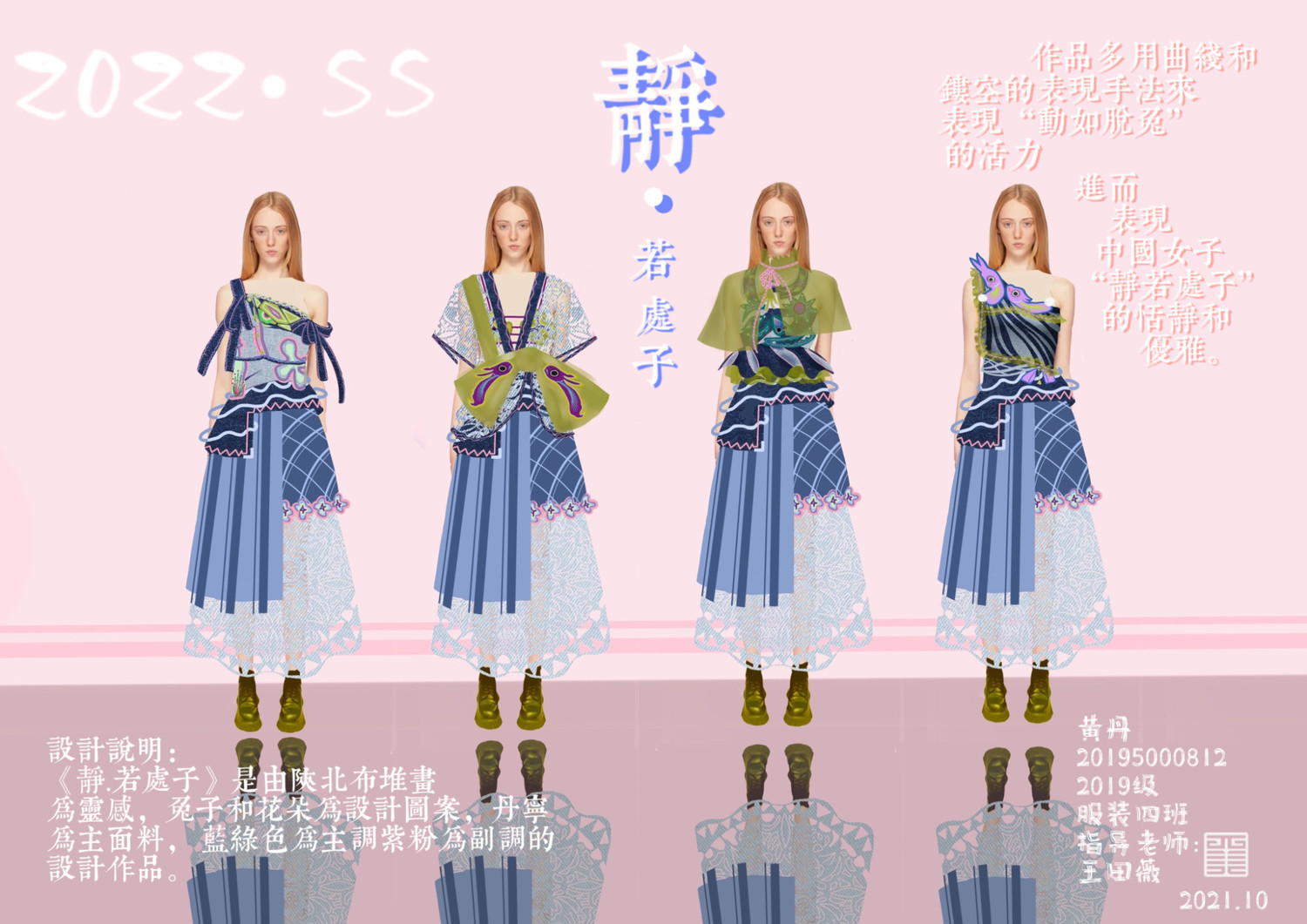 以布堆画元素为设计灵感,设计以吊带为基本款式的成衣,以绿紫调为主,以丹宁为主要设计面料。因为设计图案中以兔子为主,故而想表达“动如脱兔静若处子”的美感,作品因此得名。
