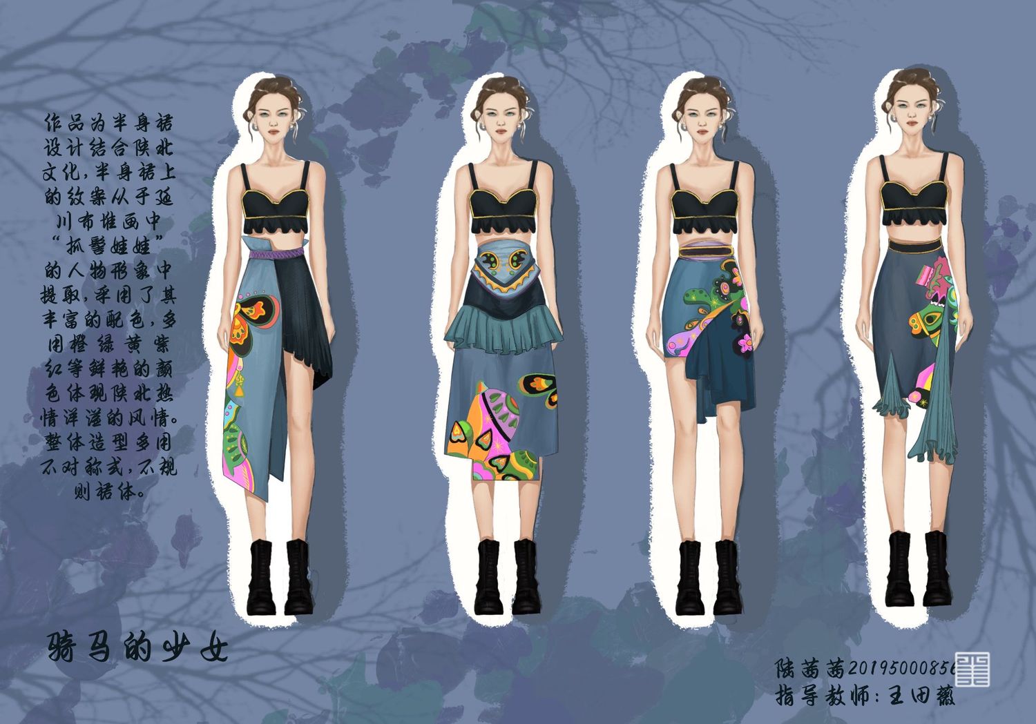 灵感来源于陕北布堆画中“抓髻娃娃”这一形象,将图形拆开分解,换种方式重组,运用在半身裙中。