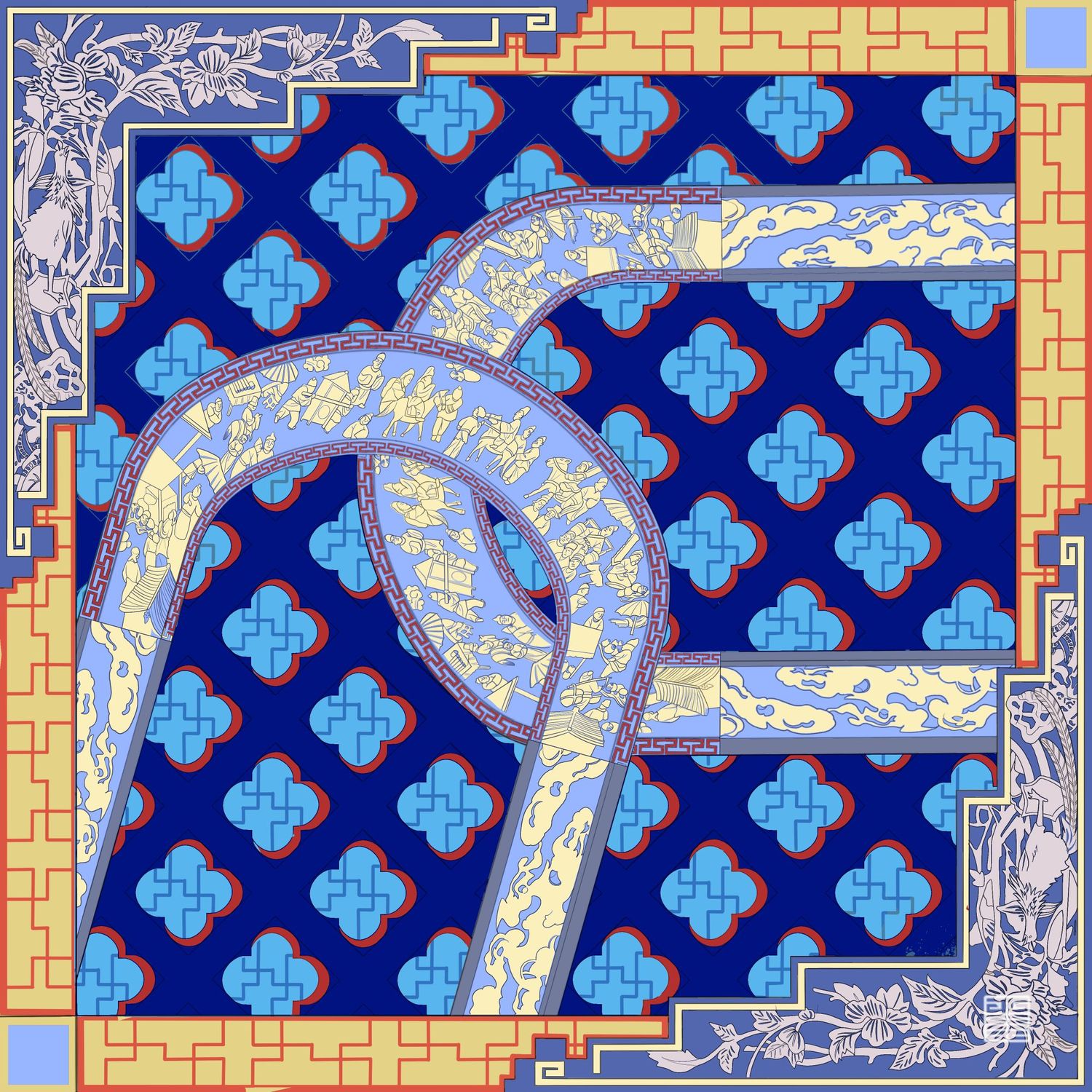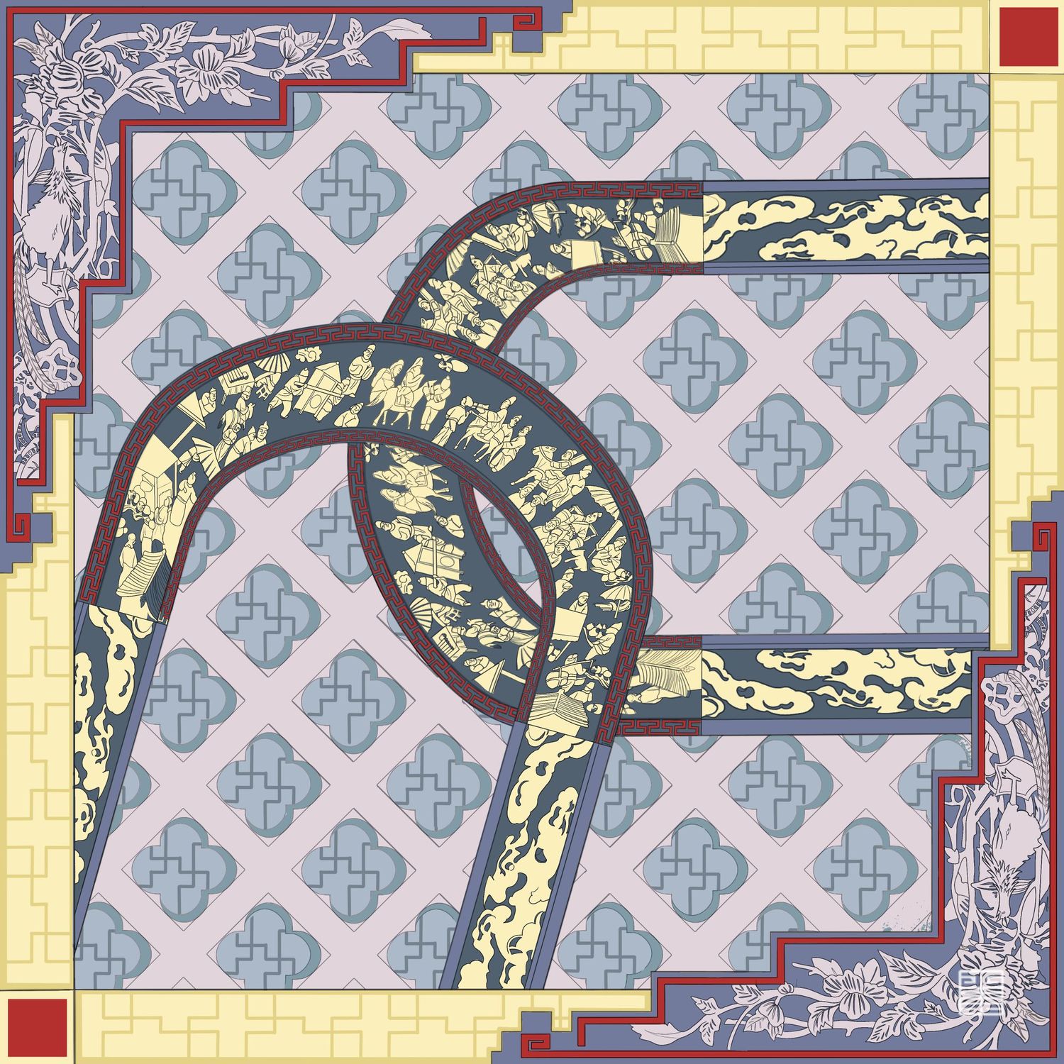 以关中民俗博物院中周、秦、汉、唐以来的历代石雕、木雕、砖雕、关中古民居和群众生产、生活、习俗、风情等各类元素作为素材,以砖雕拱门作为视觉中心,边角用木雕门框加以装饰,体现了关中人民在长期的生产、生活中智慧和创新的结晶。设计时通过多次试色,最终选用以蓝色及紫色为主色调的方案,意在体现石雕及木雕的造型与色彩,并通过黄色与紫色的强烈对比表现传统文化与时尚结合的魅力。