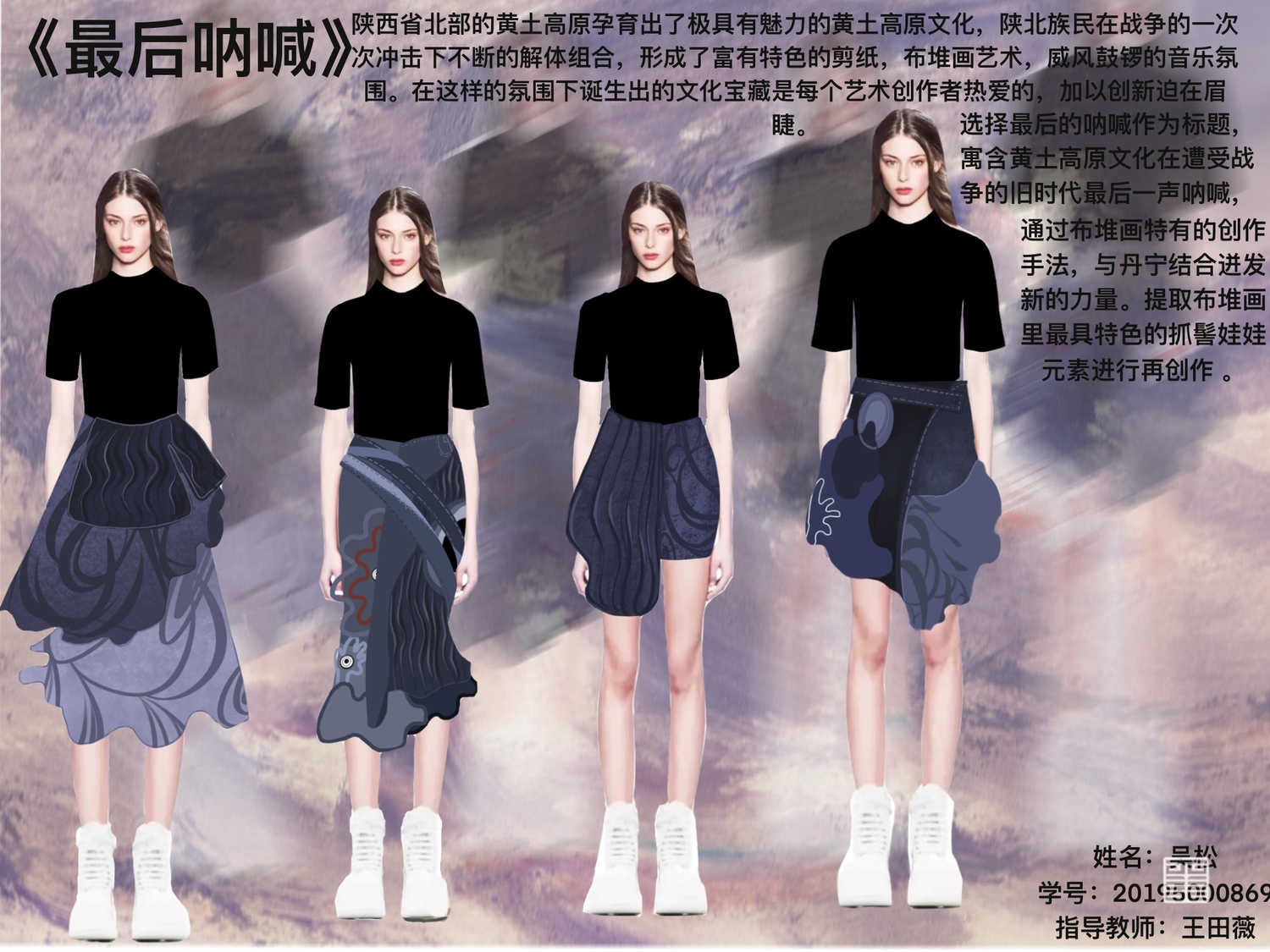 选择布贴画和丹宁的结合,进行再创作。和陕北民族花纹结合,设计出一款现代风味的时装。