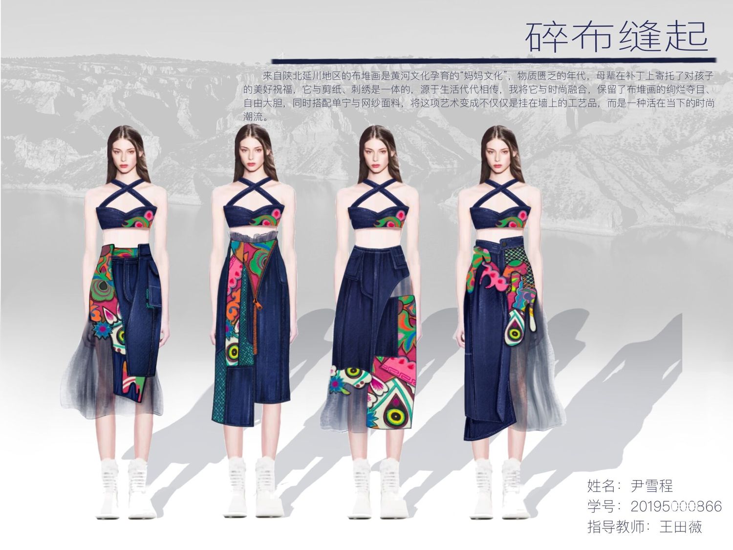 在陕北物资匮乏的时代,母辈在衣服上的补丁寄托了对孩子的美好祝福,与剪纸、刺绣同为一体。在保留布堆画的绚烂夺目、自由大胆,同时与丹宁网纱面料搭配。