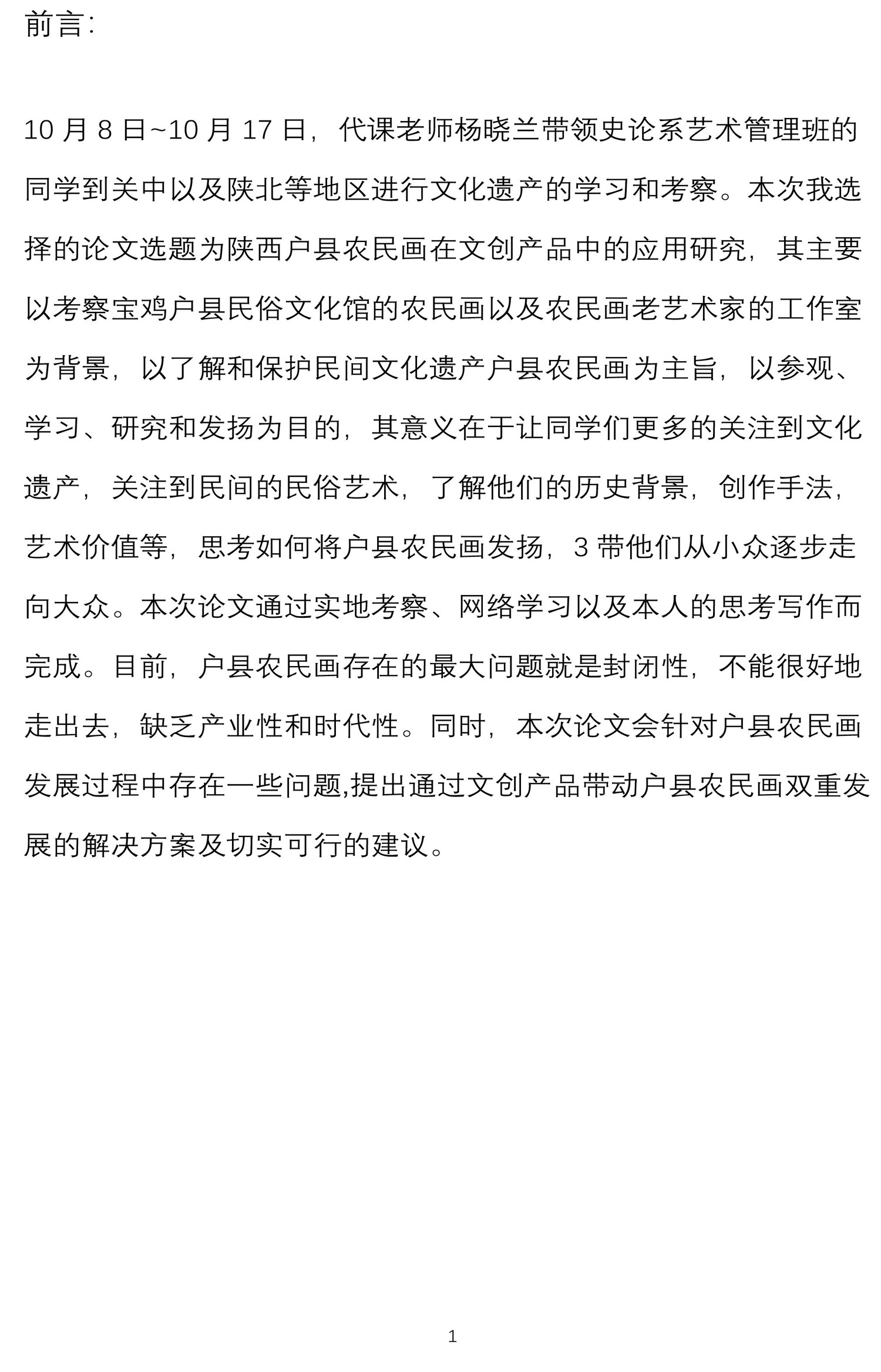 10月8日~10月17日,代课老师杨晓兰带领史论系艺术管理班的同学到关中以及陕北等地区进行文化遗产的学习和考察。本次我选择的论文选题为陕西户县农民画在文创产品中的应用研究,其主要以考察宝鸡户县民俗文化馆的农民画以及农民画老艺术家的工作室为背景,以了解和保护民间文化遗产户县农民画为主旨,以参观、学习、研究和发扬为目的,其意义在于让同学们更多的关注到文化遗产,关注到民间的民俗艺术,了解他们的历史背景,创作手法,艺术价值等,思考如何将户县农民画发扬,带他们从小众逐步走向大众。