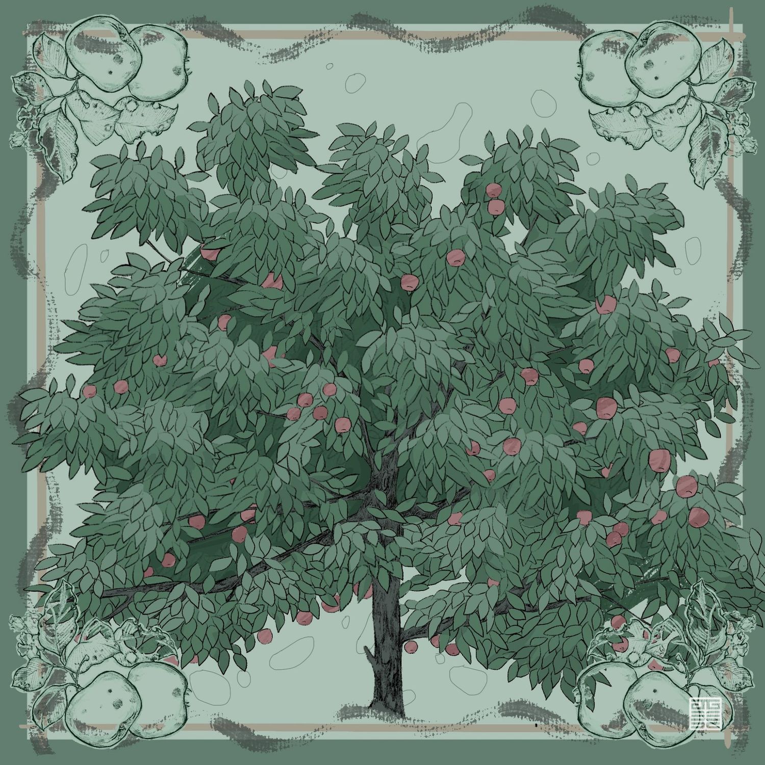 以经过洛川时看到路边的苹果园产生为灵感,将树叶与树干抽象化,只保留视觉所见的颜色搭配:灰绿色的树叶与浅粉色的苹果。无论是叶子的排列还是苹果的分布都尽量贴近记忆中的印象,以此设计出这款整体色调比较浅淡的苹果树主题丝巾。