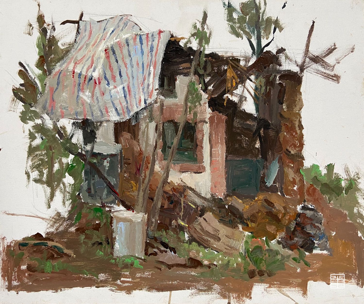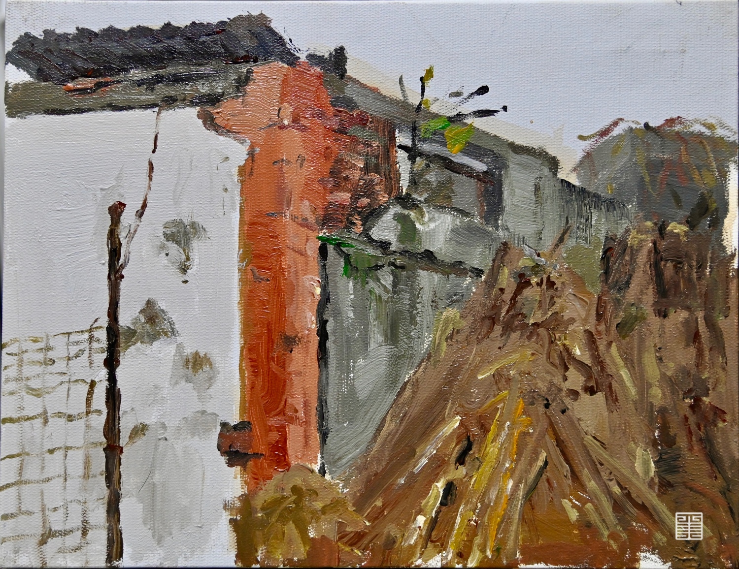使用丙烯画鲍旗寨山上的危房,房子的构造很有意思,跟现代建筑也有所碰撞。