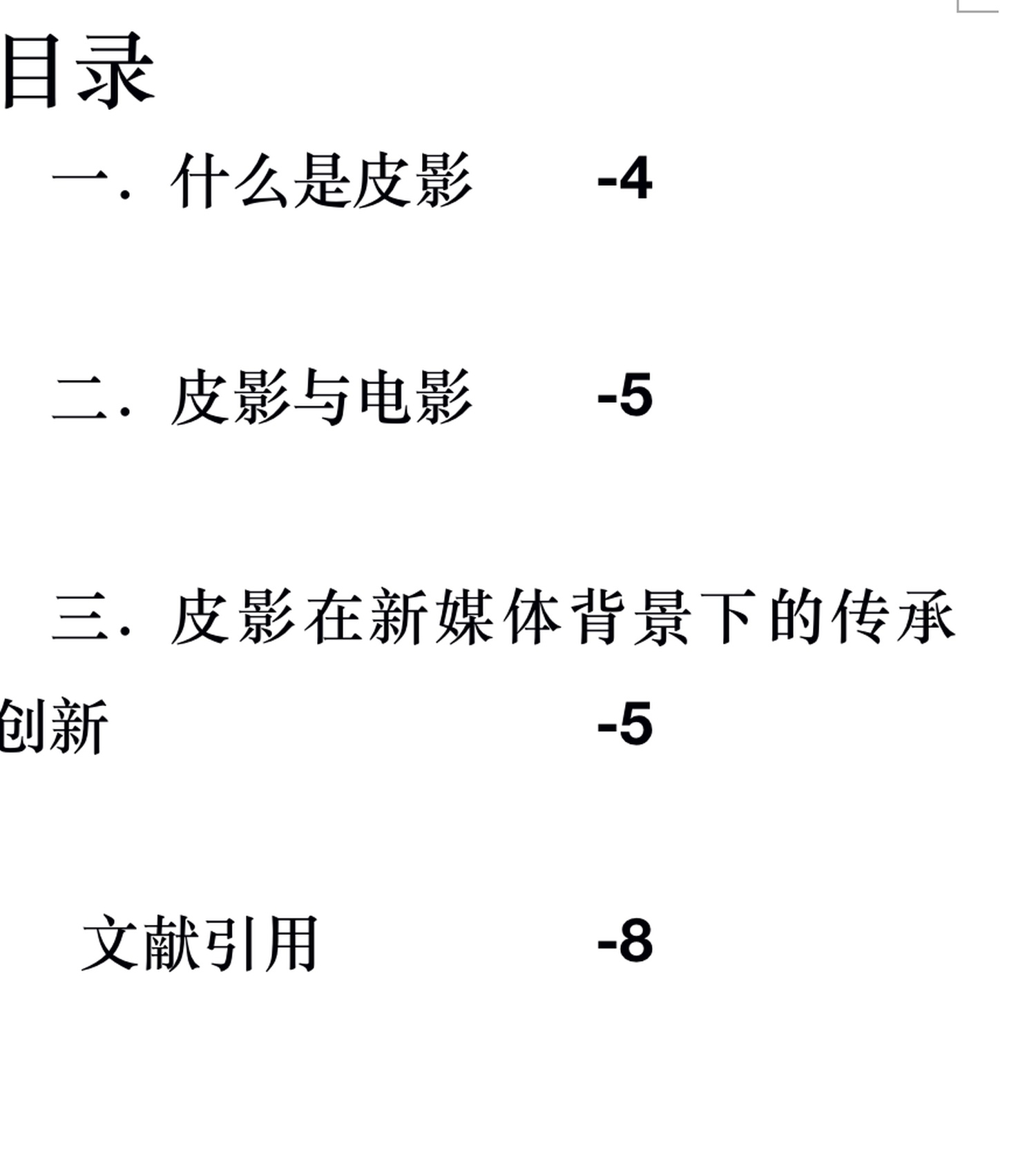 据了解所知,皮影戏在近十多年来也做了很多革新,但是我认为最有必要的是提高皮影的存在感,尝试与各电视剧合作,在大热门剧中安排剧情是去看皮影而且不是去看电影:也可以合作拍摄一部以皮影为题材的电影。皮影文化相传不息自有它的道理,它拥有这么强大的生命力,加上我们的保护,它定会相传下去,重新进入我们的视线。