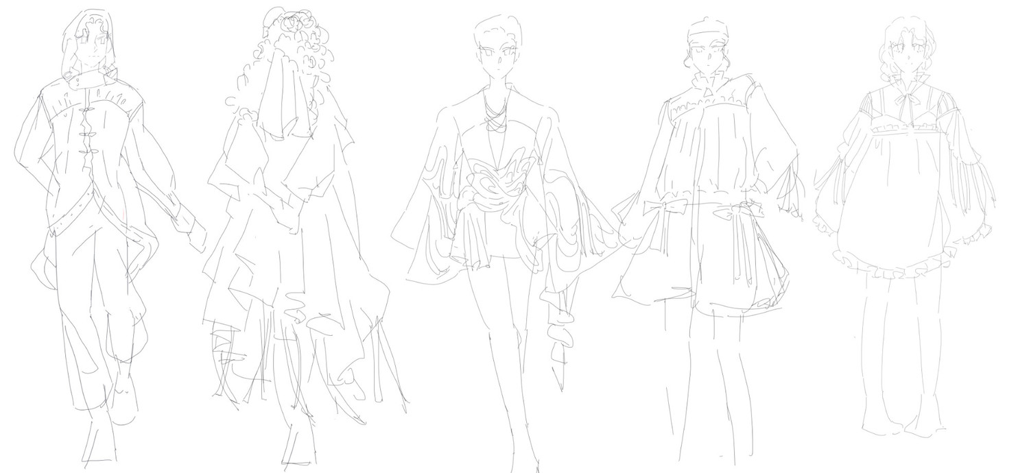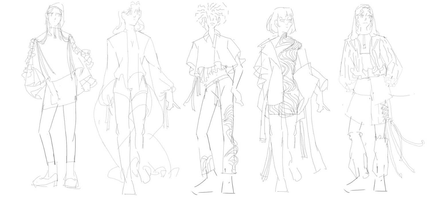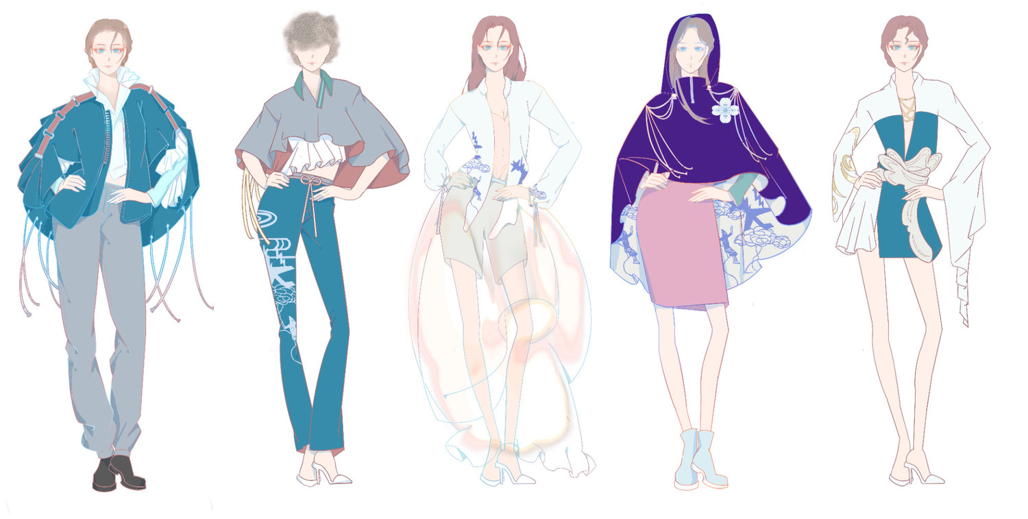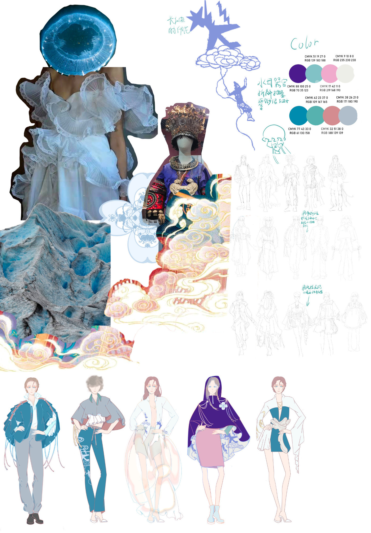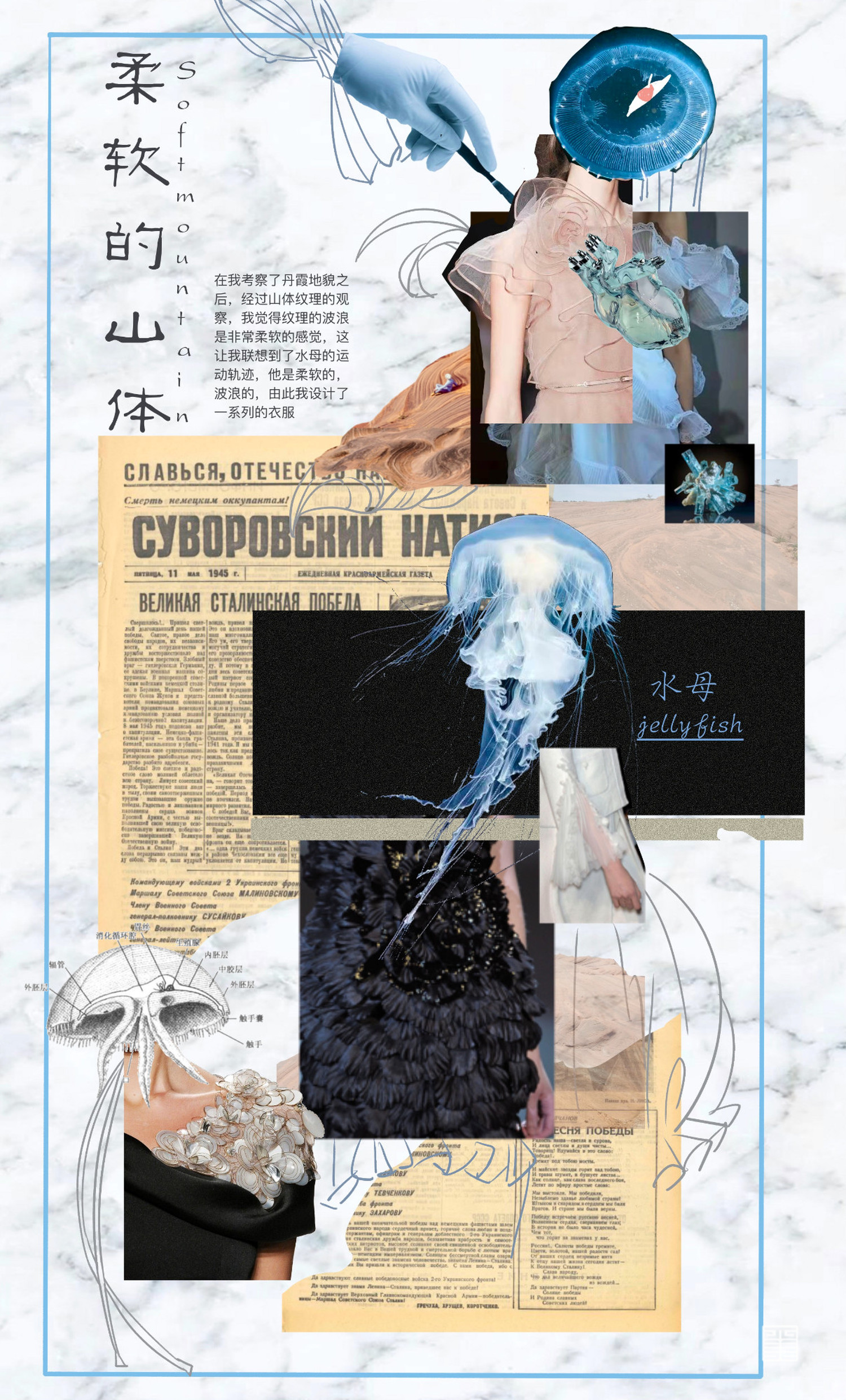 在丹霞地貌的考察中,我发现山川的波浪形纹理给我是柔软的感觉,之后我联想到了,波浪形——水母的运动轨迹,在此我将水母的器官进行分解,之后进行抽象,然后他们变成了袖子,廓形等服装形态。