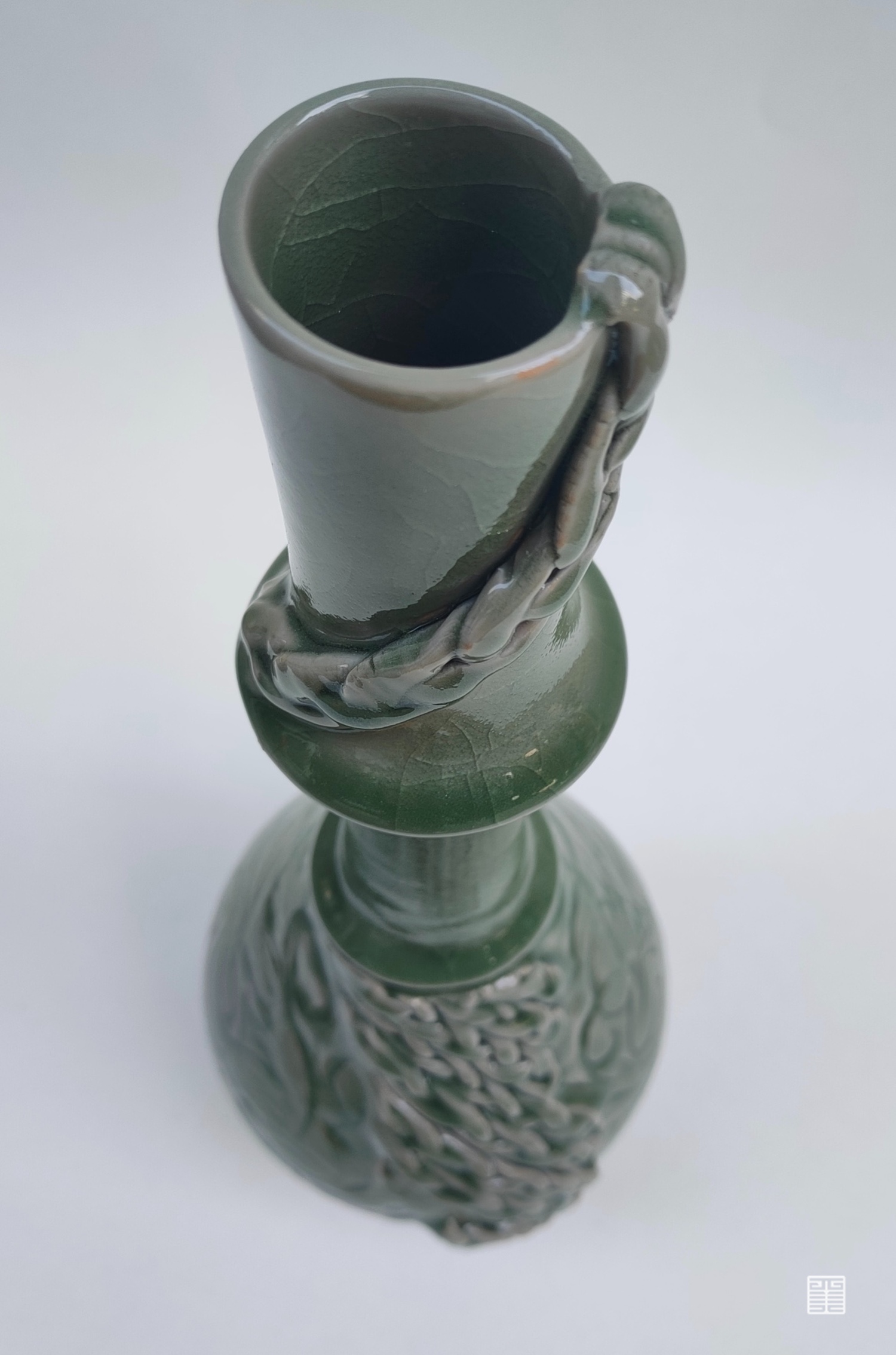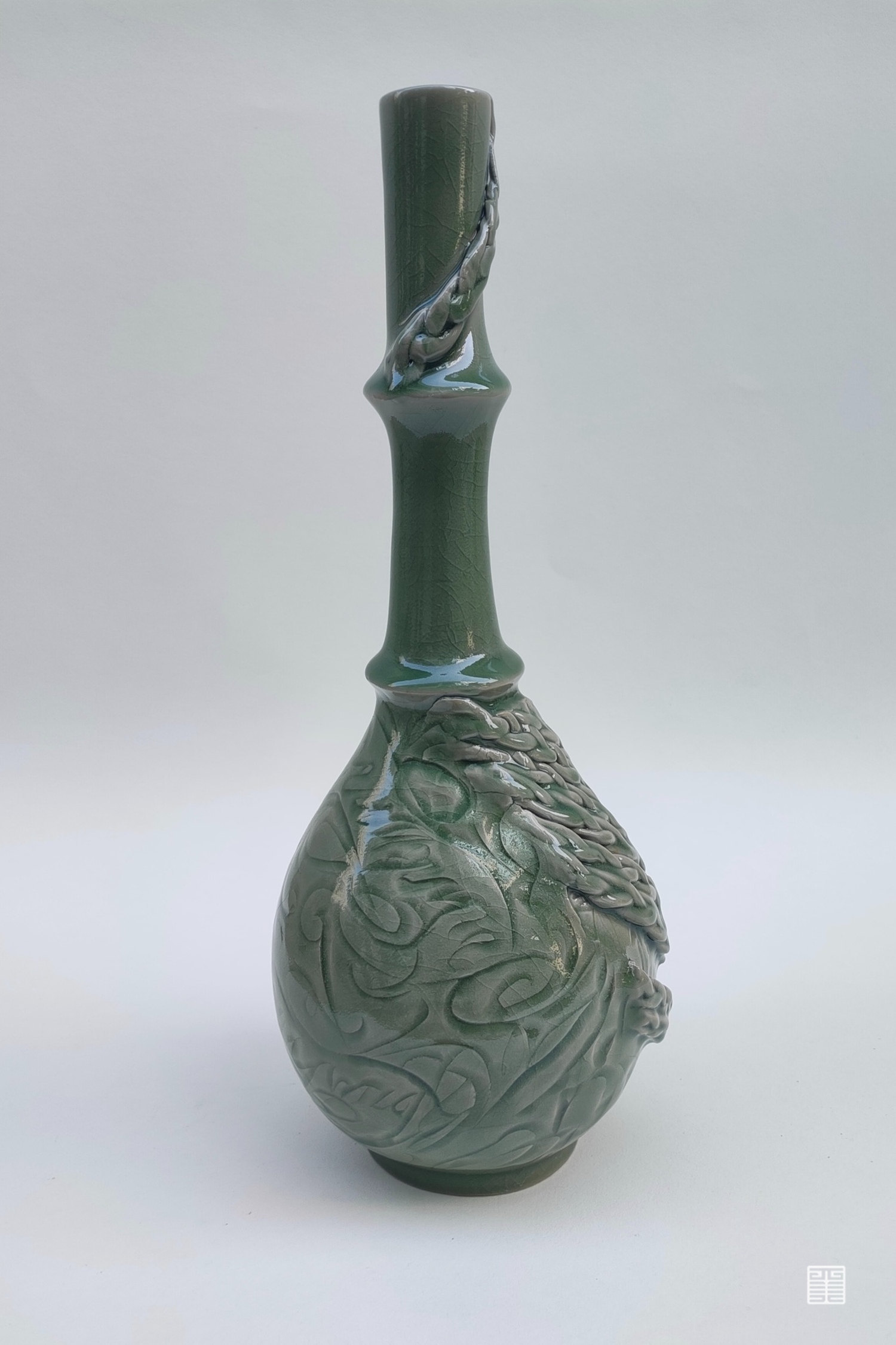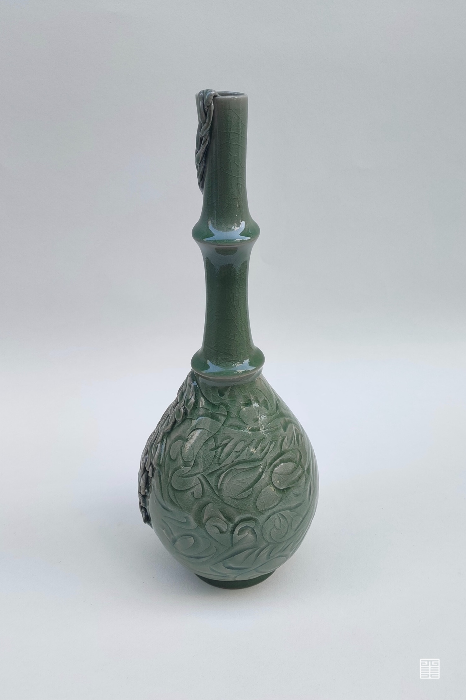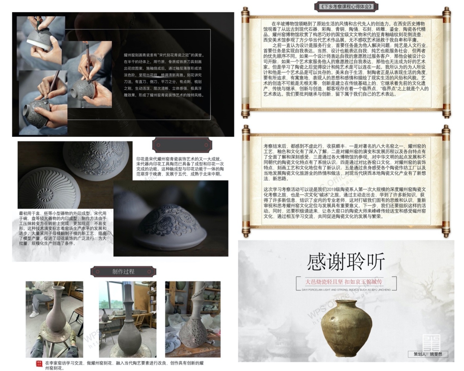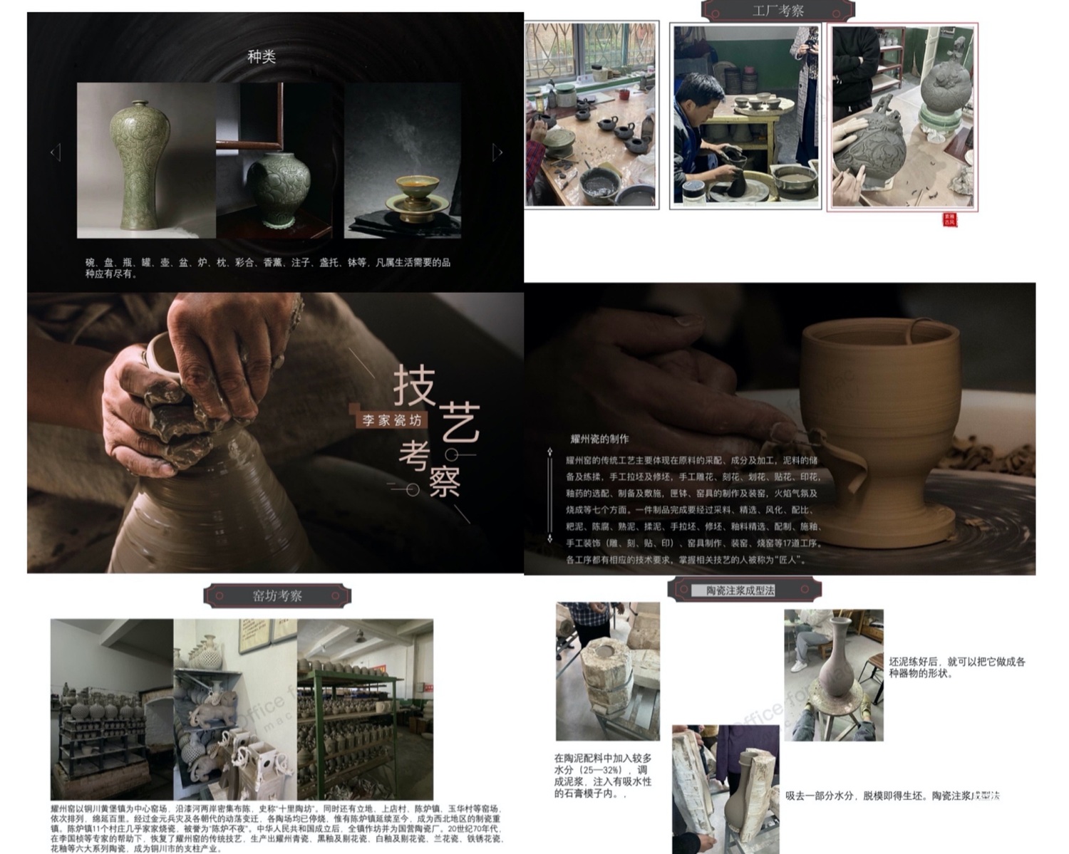 器皿给人以“闲来无事轻松散漫的意趣” 。通过结合两种皆取自于自然的元素,还原了关于泥土、树木,枝蔓的朴素美感。陶瓷与编织似乎是两种完全不会有任何交集的媒介。一个形体坚硬,一个柔软轻盈。但通过在未烧制的陶瓷上打磨粘合,便可让藤蔓轻易的穿梭其中,将二者自然的融合在一起。英国与中国的审美意识不同。在中国我们崇尚的是完美追求工艺的极致性,而在英国会认为事物原本的样子就是最美的。本次在耀州瓷窑坊进行学习,融入了当代陶艺要素进行改良,加入英式花体字创作具有创新的耀州窑刻花,我的作品正是这两种审美意识碰撞下的产物。这是一种就相互依存和保护这些脆弱形式的必要性展开对话的方式。