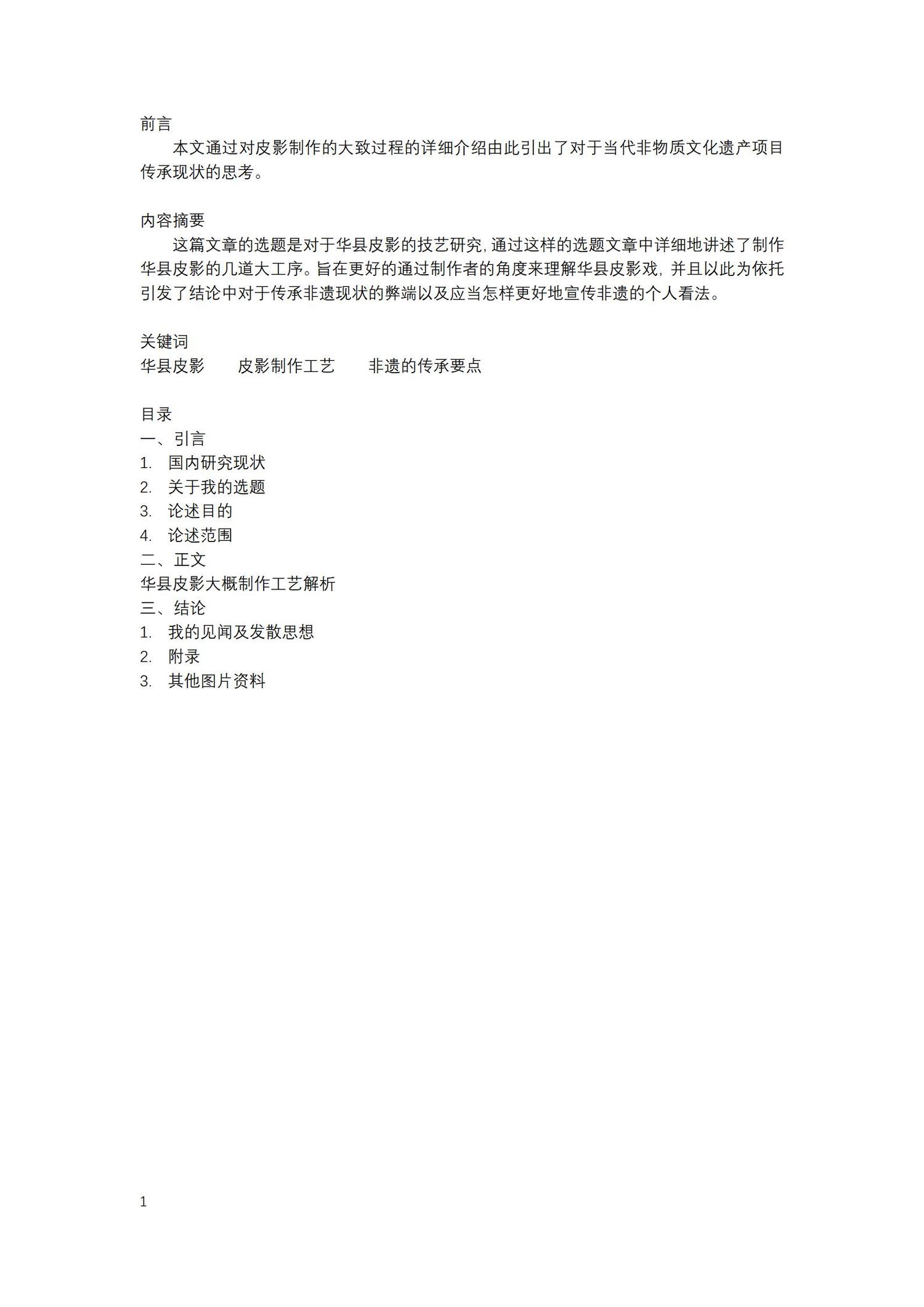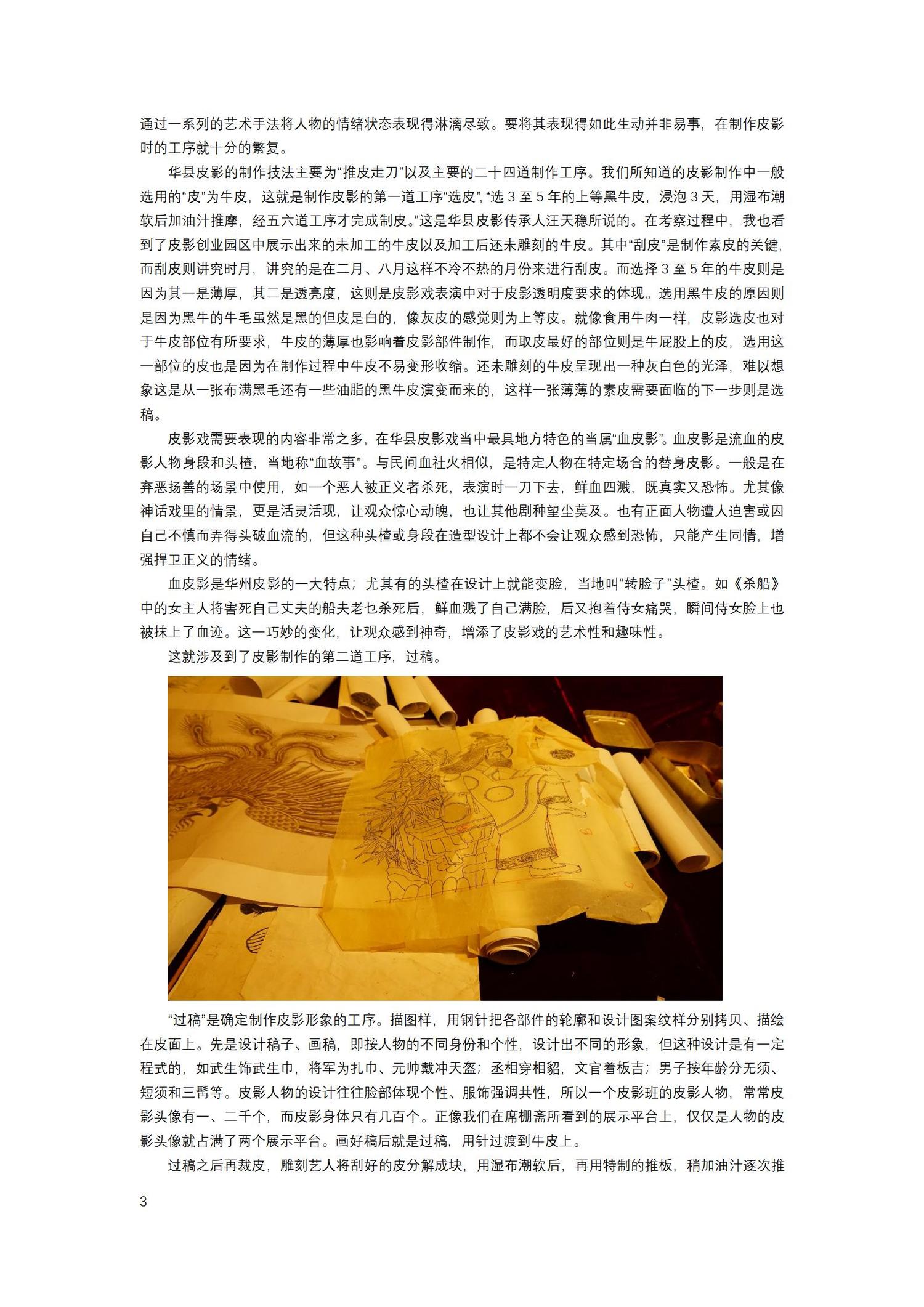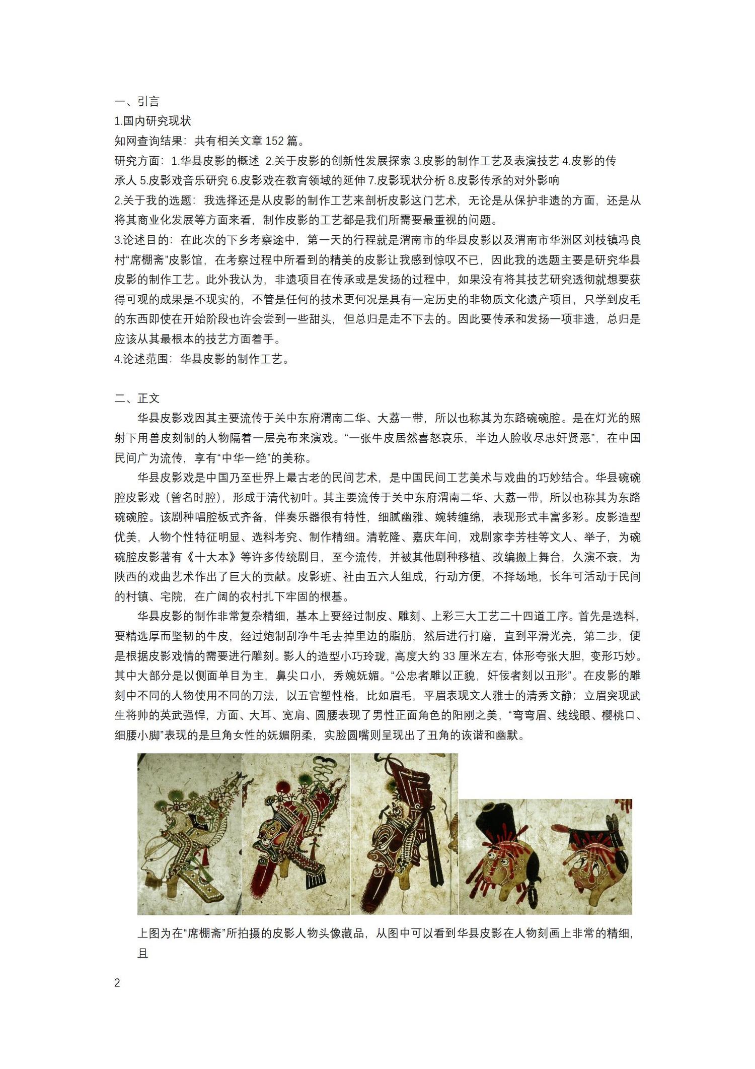 这篇文章的选题是对于华县皮影的技艺研究,通过这样的选题文章中详细地讲述了制作华县皮影的几道大工序。旨在更好的通过制作者的角度来理解华县皮影戏,并且以此为依托引发了结论中对于传承非遗现状的弊端以及应当怎样更好地宣传非遗的个人看法。