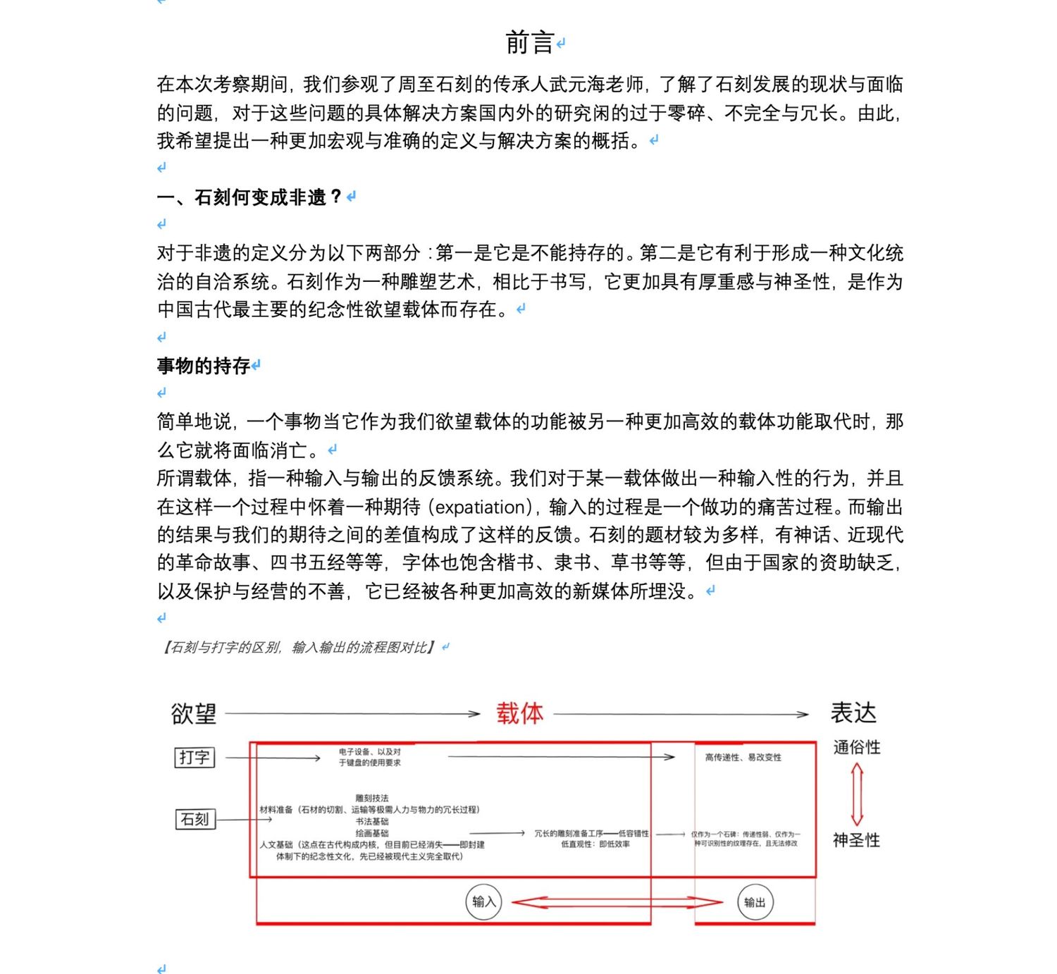 的问题,对于这些问题的具体解决方案国内外的研究闲的过于零碎、不完全与冗长。由此,我希望在本次考察期间,我们参观了周至石刻的传承人武元海老师,了解了石刻发展的现状与面临提出一种更加宏观与准确的定义与解决方案的概括。