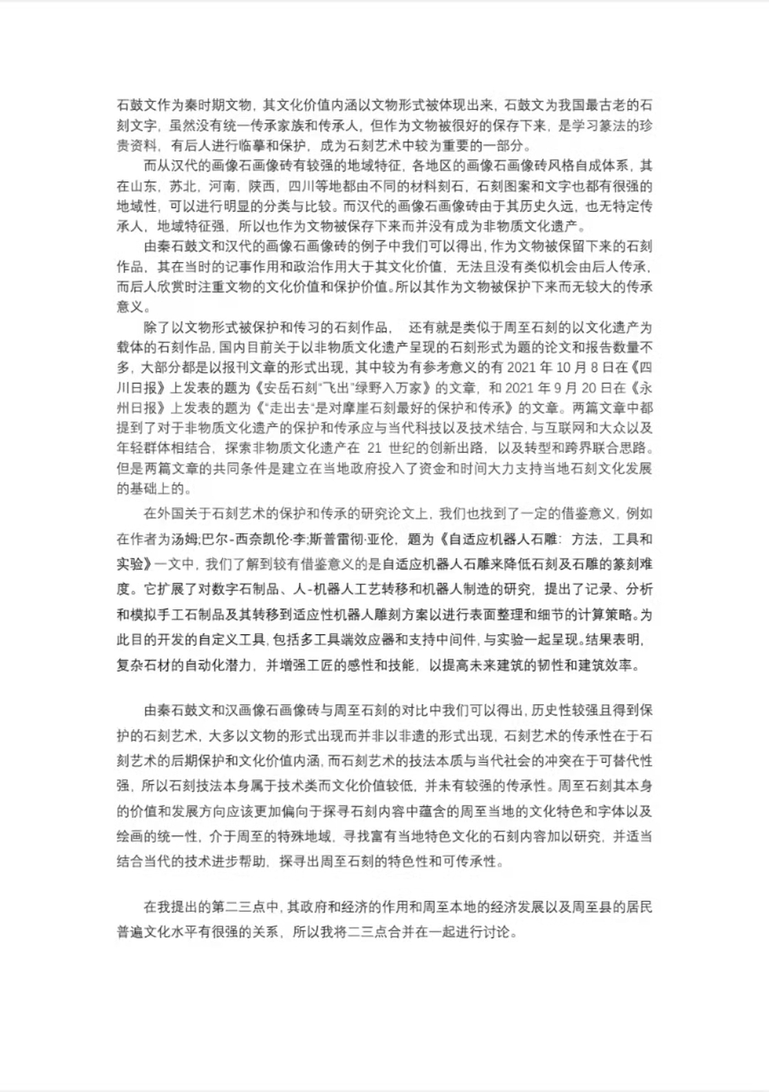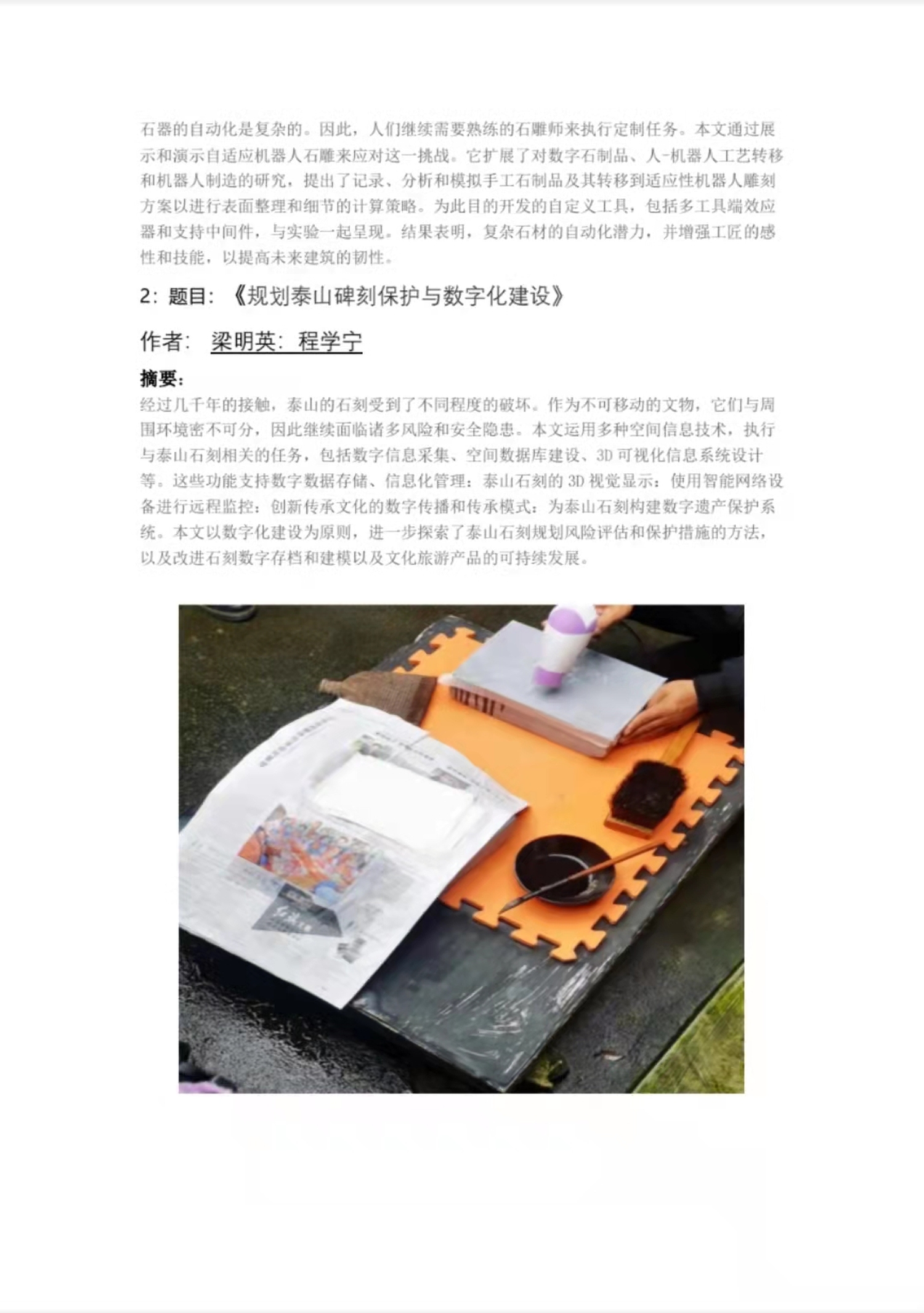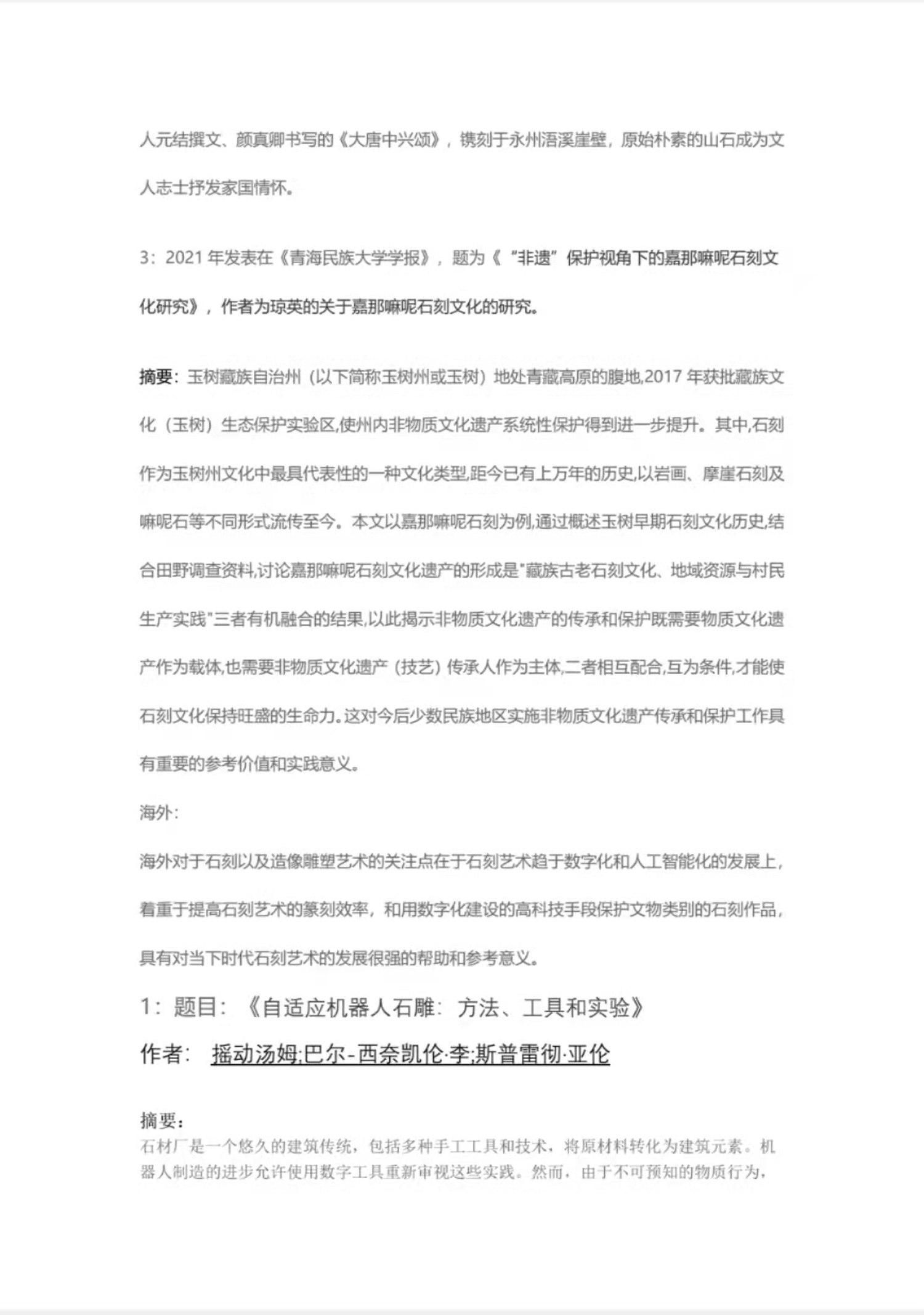 在外国关于石刻艺术的保护和传承的研究论文上,我们也找到了一定的借鉴意义,例如在作者为汤姆;巴尔-西奈凯伦·李;斯普雷彻·亚伦,题为《自适应机器人石雕:方法,工具和实验》一文中,我们了解到较有借鉴意义的是自适应机器人石雕来降低石刻及石雕的篆刻难度。它扩展了对数字石制品、人-机器人工艺转移和机器人制造的研究,提出了记录、分析和模拟手工石制品及其转移到适应性机器人雕刻方案以进行表面整理和细节的计算策略。为此目的开发的自定义工具,包括多工具端效应器和支持中间件,与实验一起呈现。结果表明,复杂石材的自动化潜力,并增强工匠的感性和技能,以提高未来建筑的韧性和建筑效率。