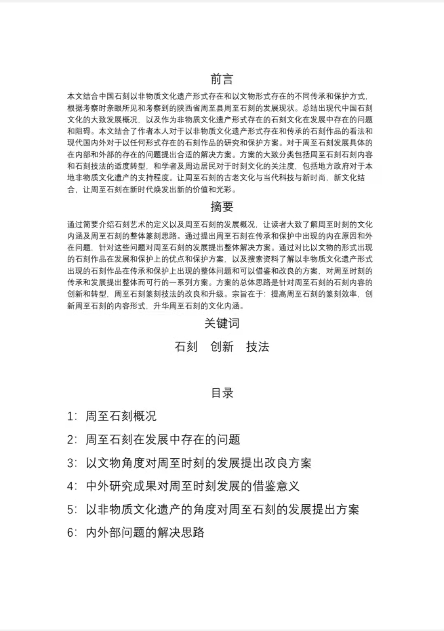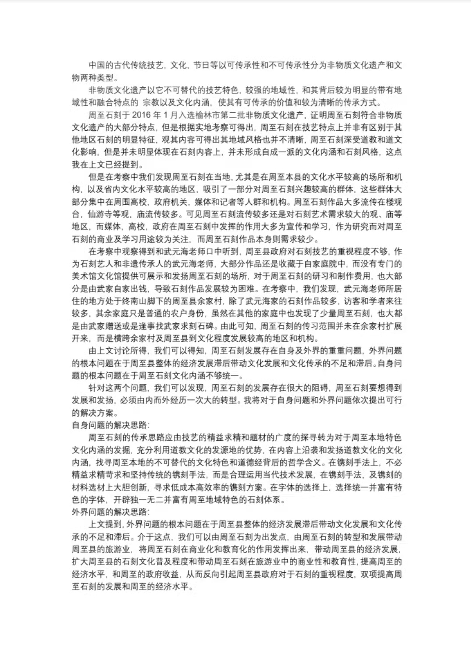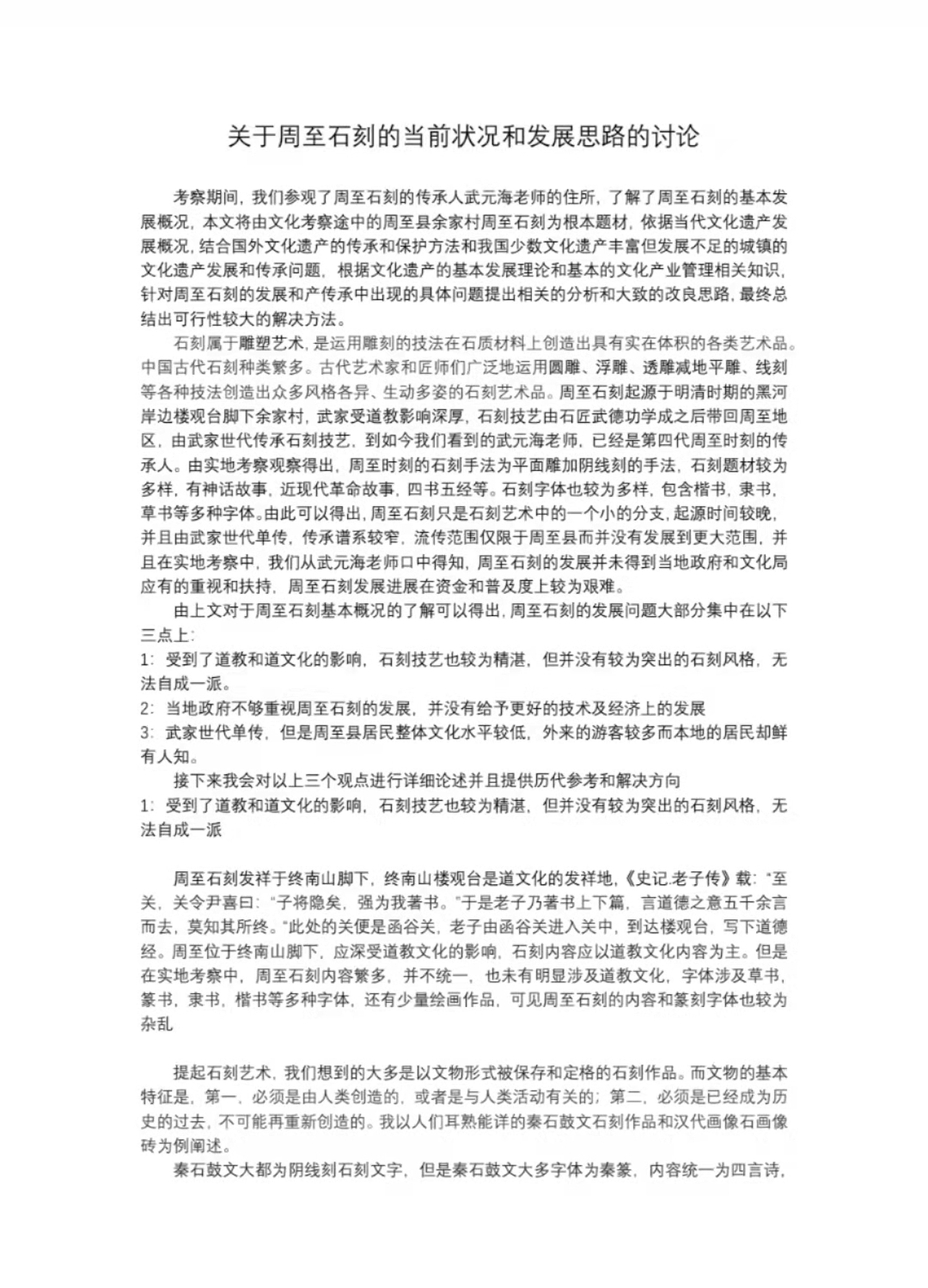 考察期间,我们参观了周至石刻的传承人武元海老师的住所,了解了周至石刻的基本发展概况,本文将由文化考察途中的周至县余家村周至石刻为根本题材,依据当代文化遗产发展概况,结合国外文化遗产的传承和保护方法和我国少数文化遗产丰富但发展不足的城镇的文化遗产发展和传承问题,根据文化遗产的基本发展理论和基本的文化产业管理相关知识,针对周至石刻的发展和产传承中出现的具体问题提出相关的分析和大致的改良思路,最终总结出可行性较大的解决方法。