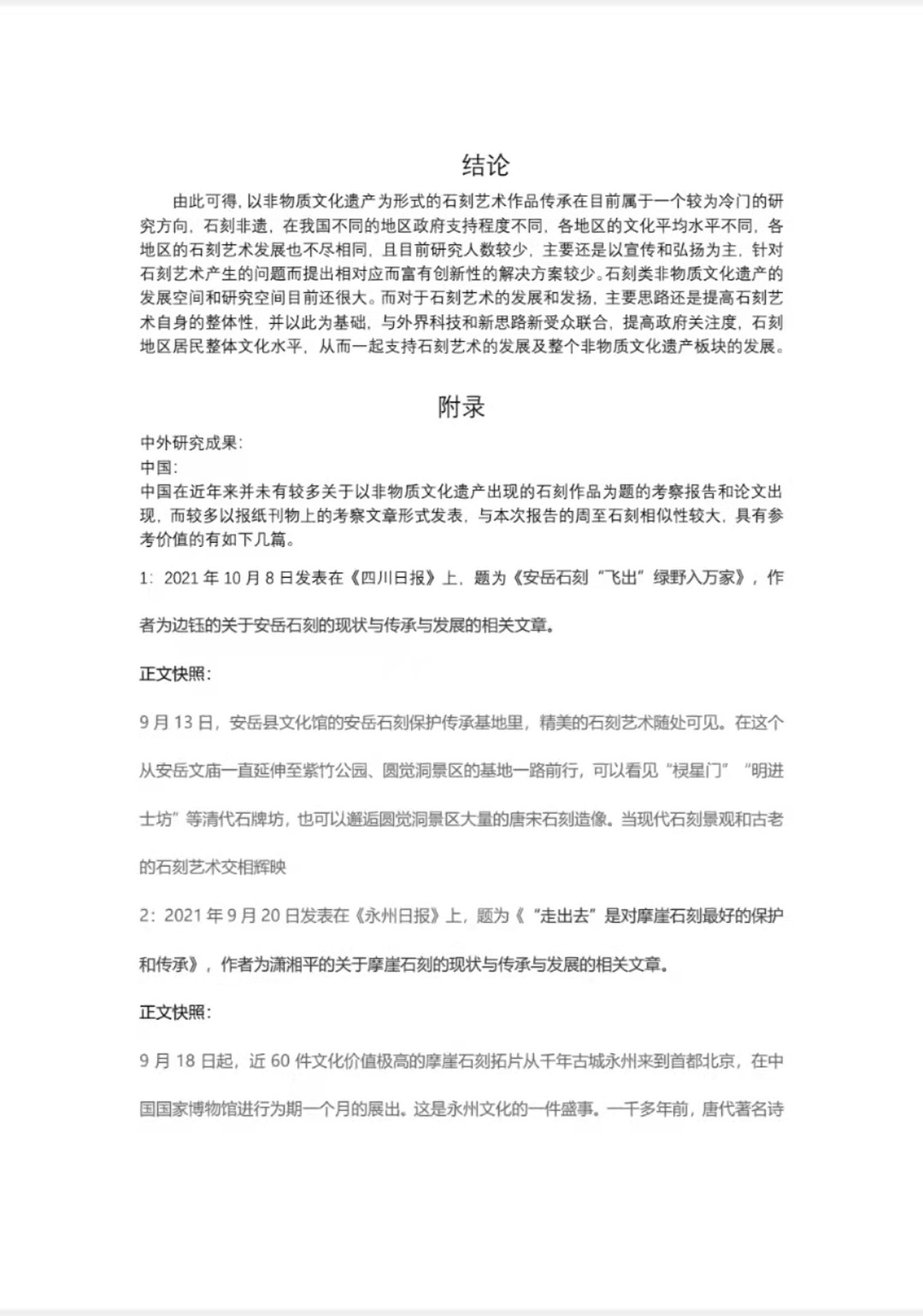 除了以文物形式被保护和传习的石刻作品, 还有就是类似于周至石刻的以文化遗产为载体的石刻作品,国内目前关于以非物质文化遗产呈现的石刻形式为题的论文和报告数量不多,大部分都是以报刊文章的形式出现,其中较为有参考意义的有2021年10月8日在《四川日报》上发表的题为《安岳石刻“飞出”绿野入万家》的文章,和2021年9月20日在《永州日报》上发表的题为《“走出去“是对摩崖石刻最好的保护和传承》的文章。两篇文章中都提到了对于非物质文化遗产的保护和传承应与当代科技以及技术结合,与互联网和大众以及年轻群体相结合,探索非物质文化遗产在21世纪的创新出路,以及转型和跨界联合思路。但是两篇文章的共同条件是建立在当地政府投入了资金和时间大力支持当地石刻文化发展的基础上的。