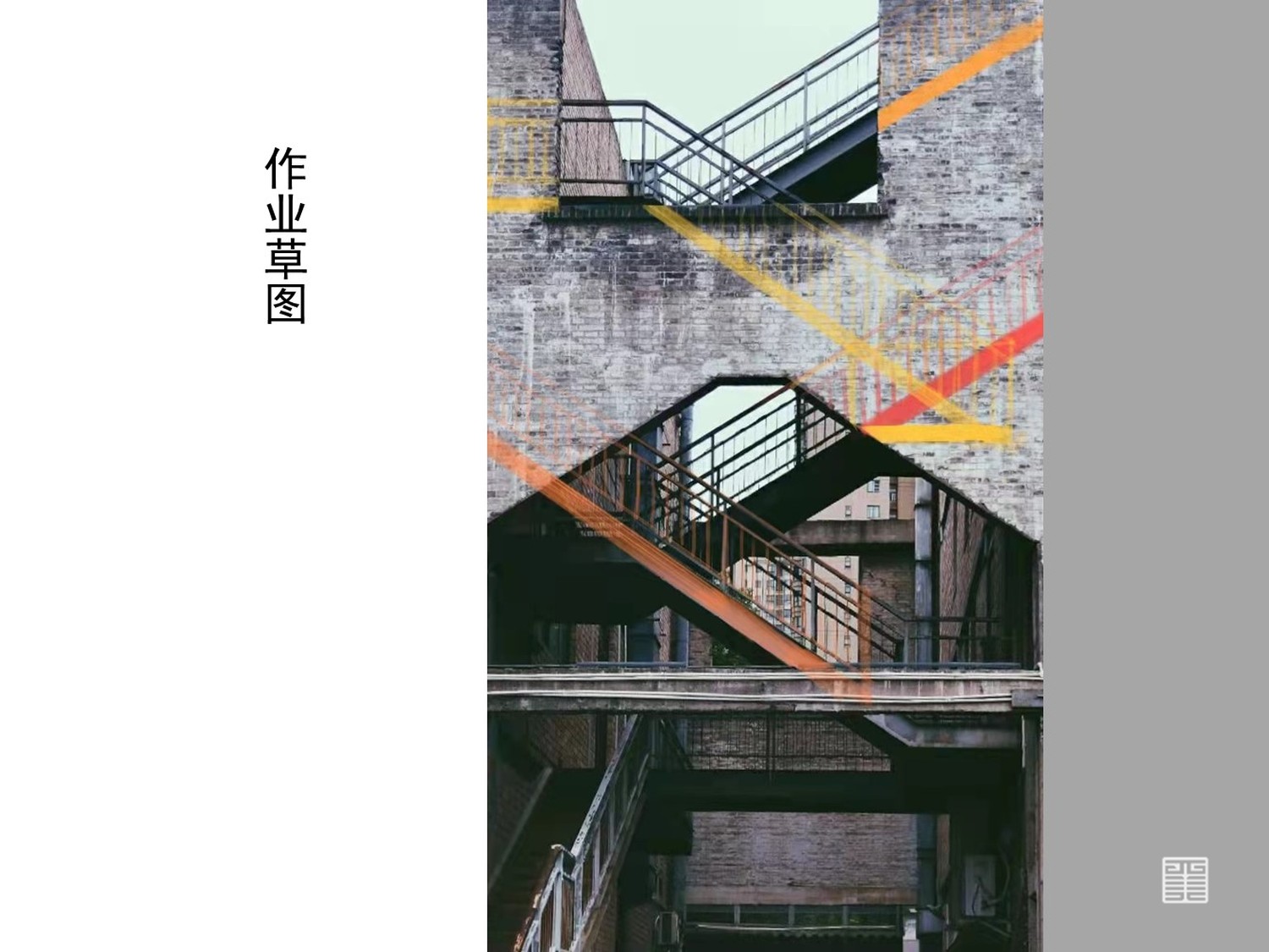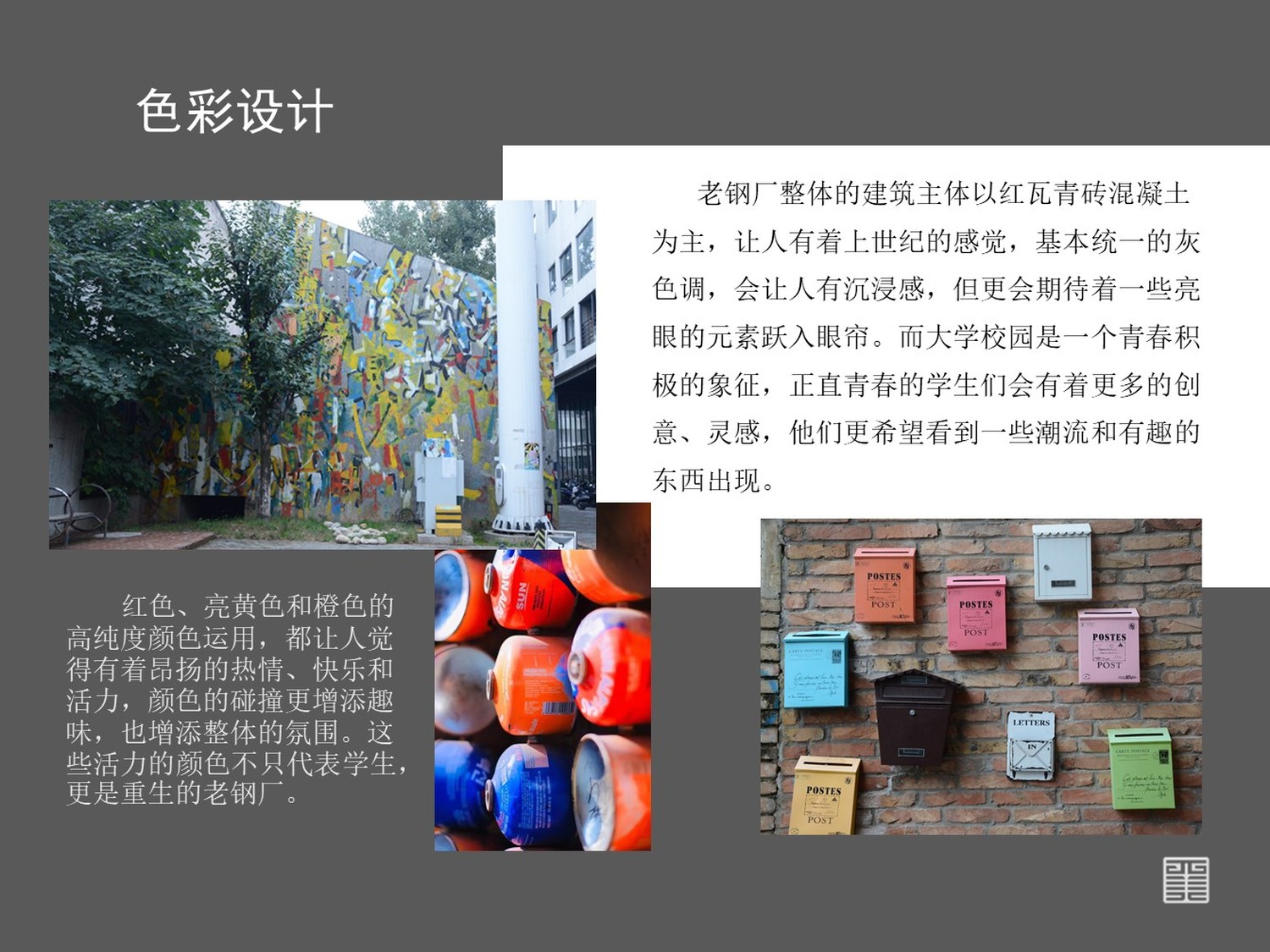 本次创意来源于老钢厂,老钢厂作为一个拥有自己独特语言的创意园区,是一个非常珍贵的存在。它保留了属于自身钢铁的印记,也增添了新的艺术元素。整个老钢厂中,有着时空感的楼梯与外面独特设计的墙面形成了交错感、未知感、层次感。因此便有了在墙面上,通过它的未知感用色彩将楼梯不断延伸的想法。