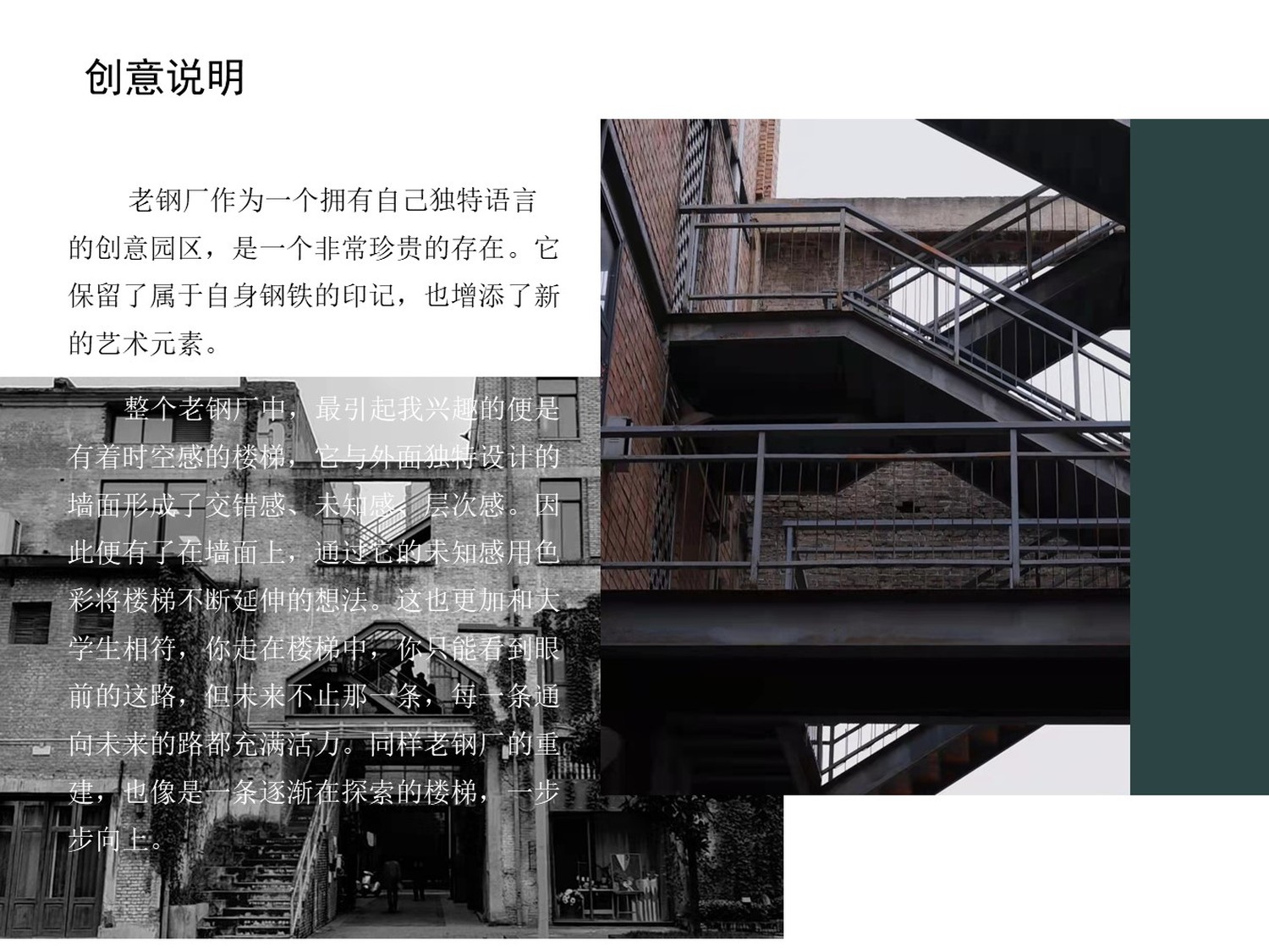 走在老钢厂的楼梯中,你只能看到眼前的这路,但未来不止那一条,每一条通向未来的路都交错着充满活力。同样老钢厂的重建,也像是一条在逐渐探索的楼梯,一步步向上。