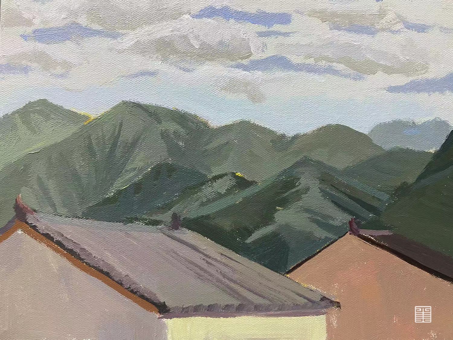 这幅画的初衷是为了展现在房顶上望过去的丛山峻岭,但在画房屋时,颇有种插画的感觉,于是将这一想法画完了全幅作品