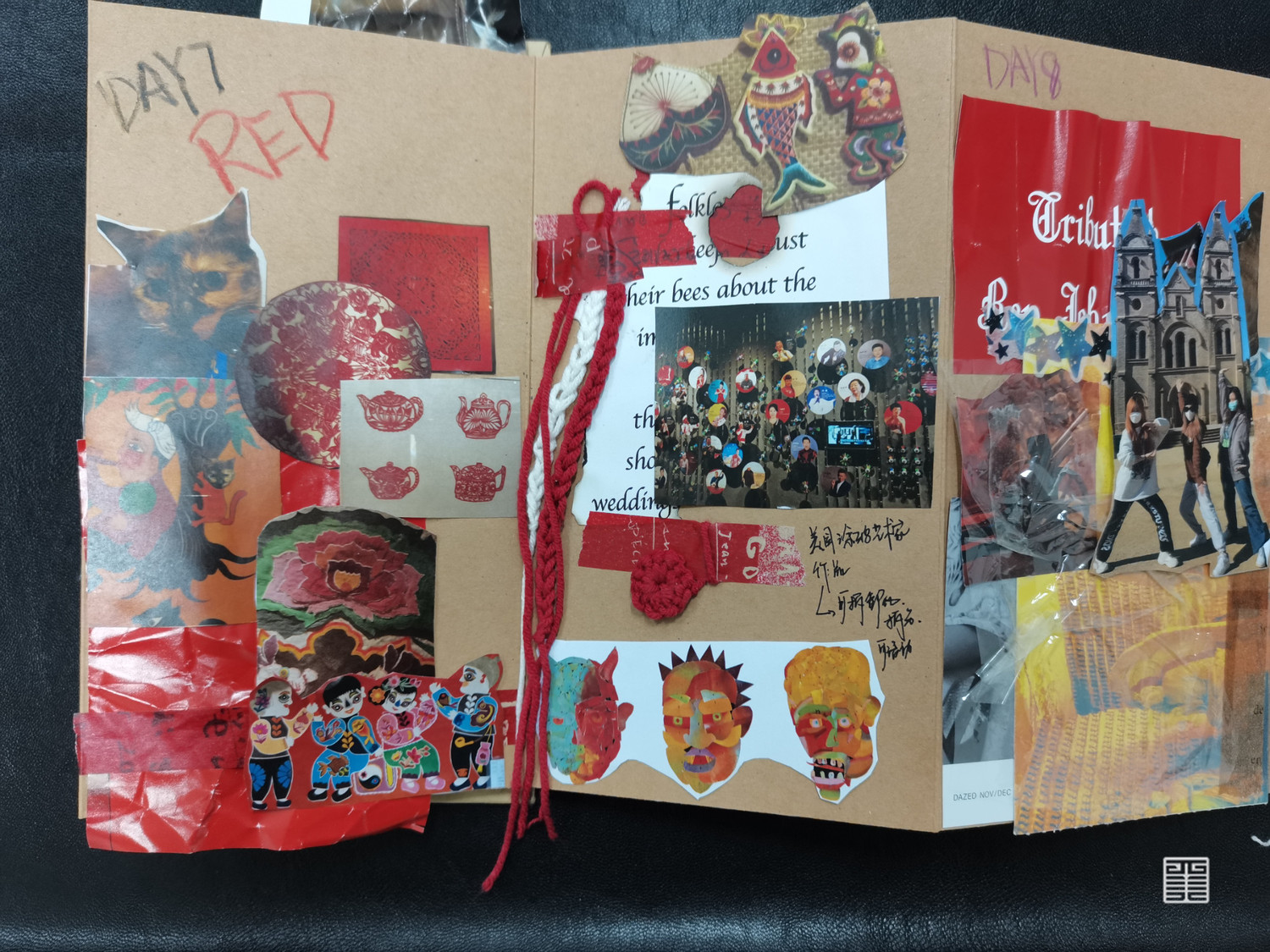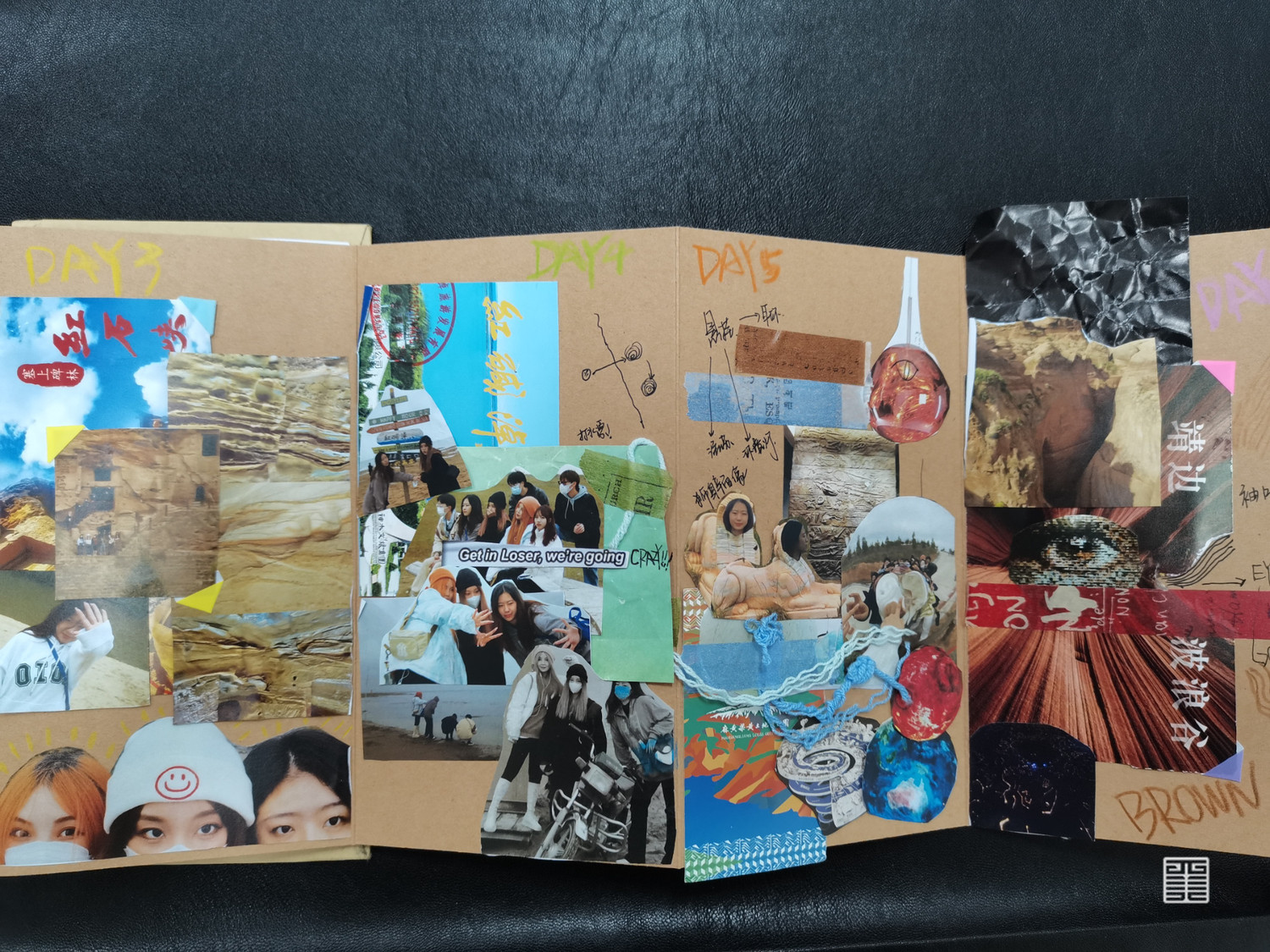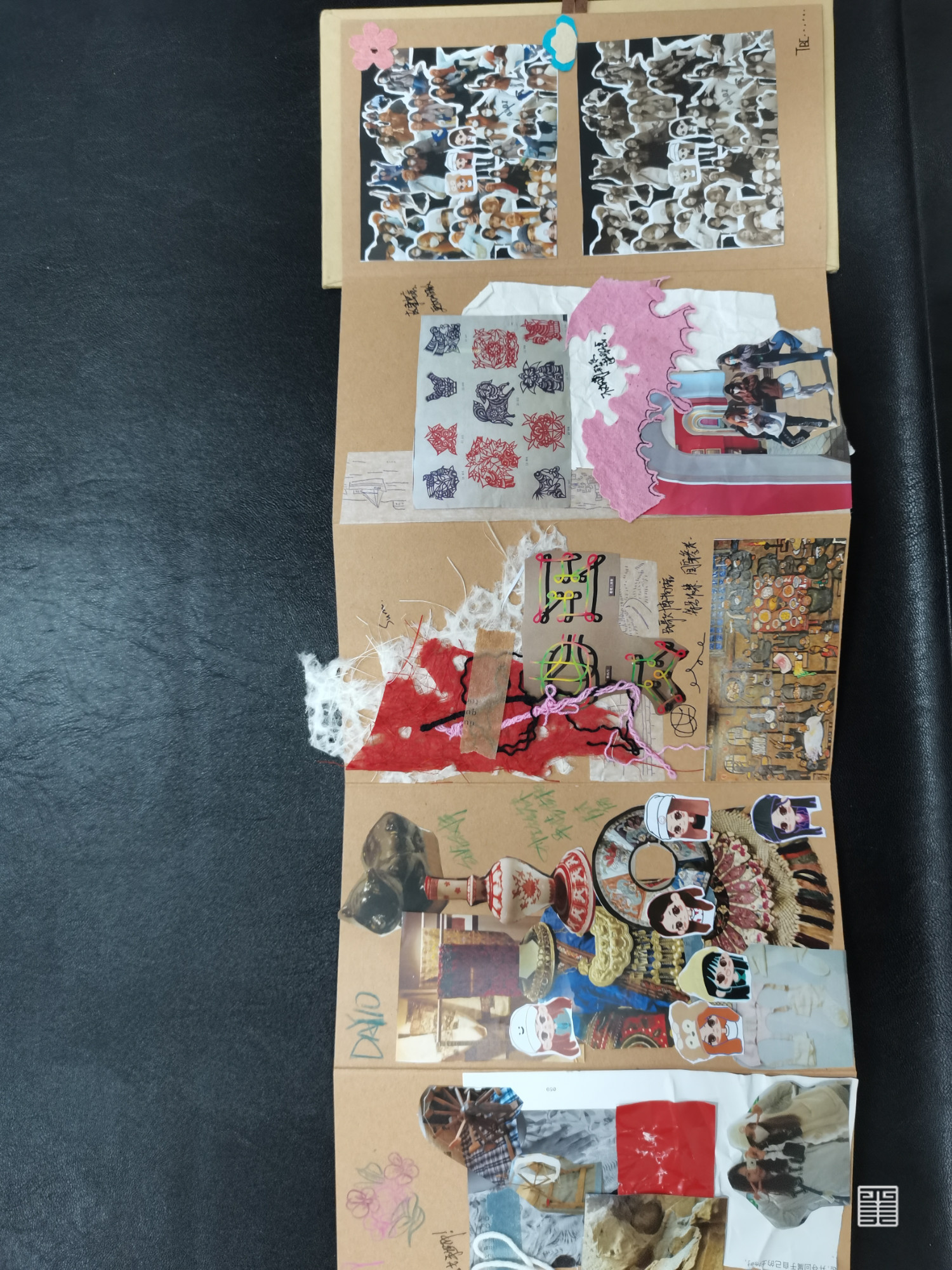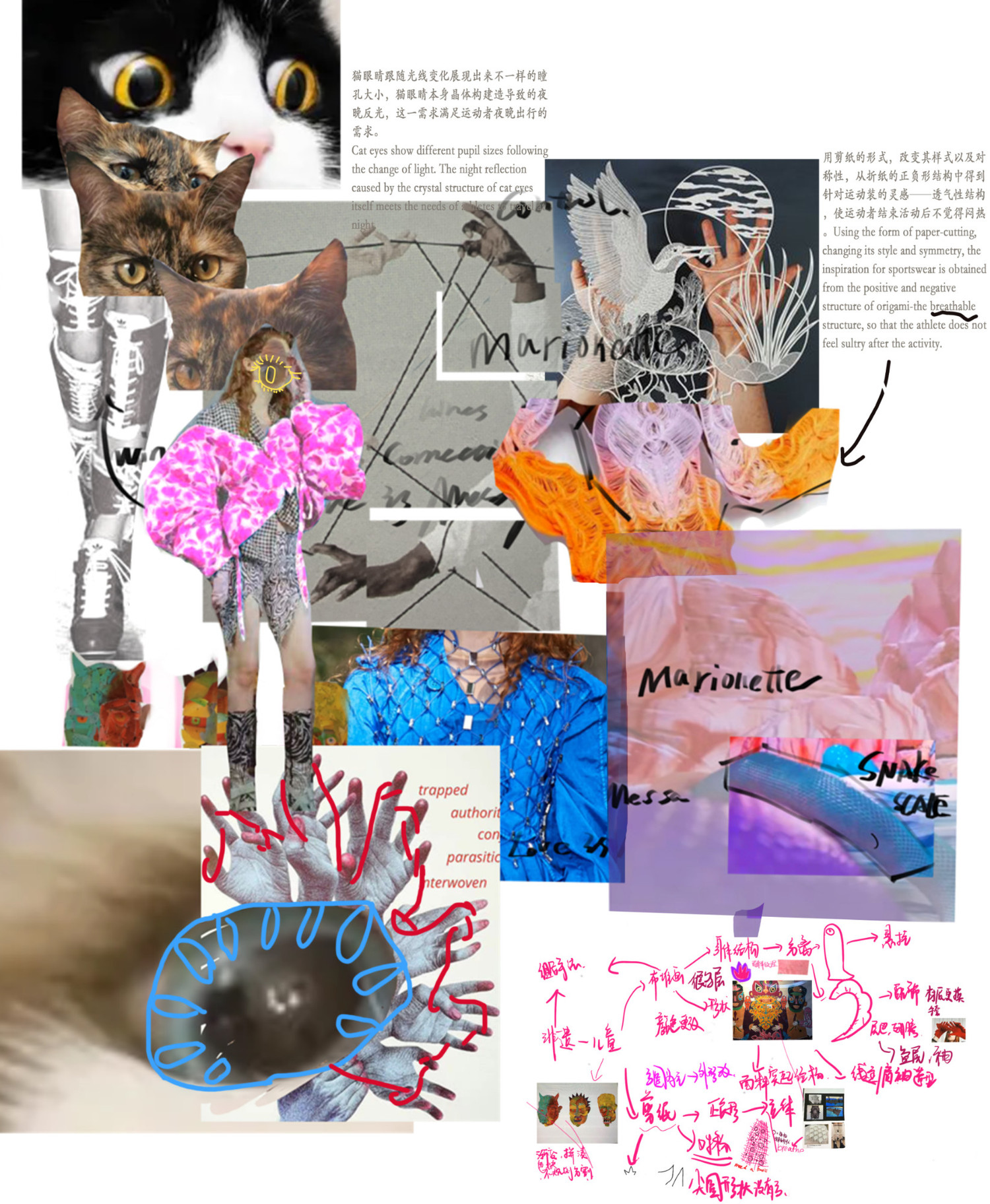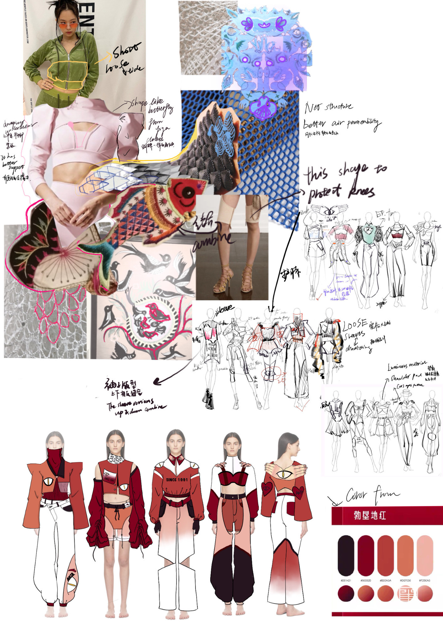 在陕北旅途中看到了很多民间艺术也对一些老艺人的技艺进行了学习,从布堆画和剪纸中得到颇多灵感:由点到线到面,再是面到线到点,结合运动装的便携性以及透气性的特点。从旅途中和家里的小猫咪眼睛随着光线而产生的变化得到了眼睛和线这两个灵感,由此进行了草图绘制再到正稿颜色确定。
