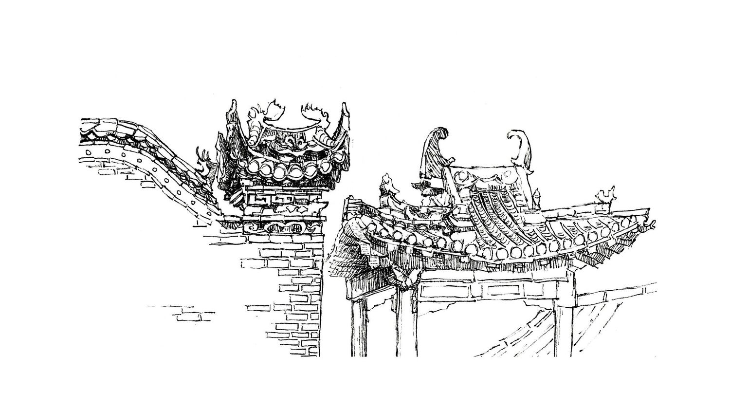 第一张的地点是在瓦房店,是一片历史悠久的会馆,商人停驻的地方。我选取了极具当地特色的屋檐为主体,完成了这一张速写。它虽然历经百年风雨,却依旧掩饰不住它曾经辉煌的历史。