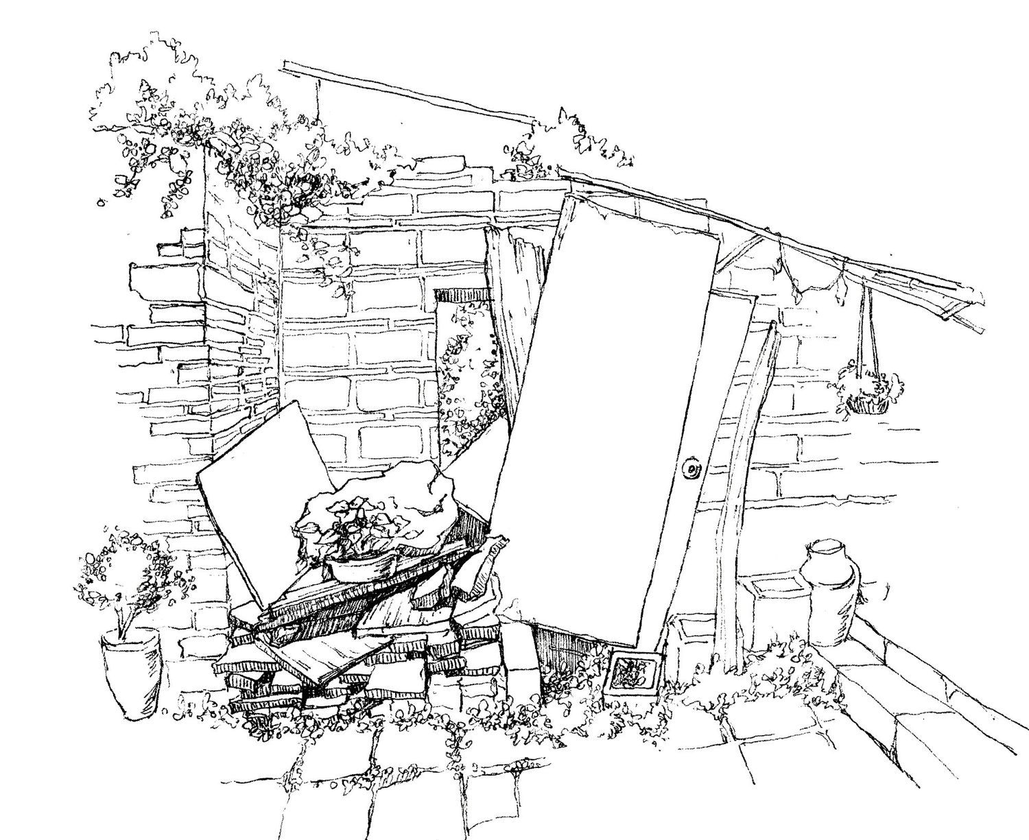 第二张画的是在向阳茶厂附近采风时,在半山的杂木丛中发现一块不完整的台阶,它破碎并且杂草丛生,但却透出一种别样的美,让人不由得联想它背后的故事,于是我完成了第二张速写。