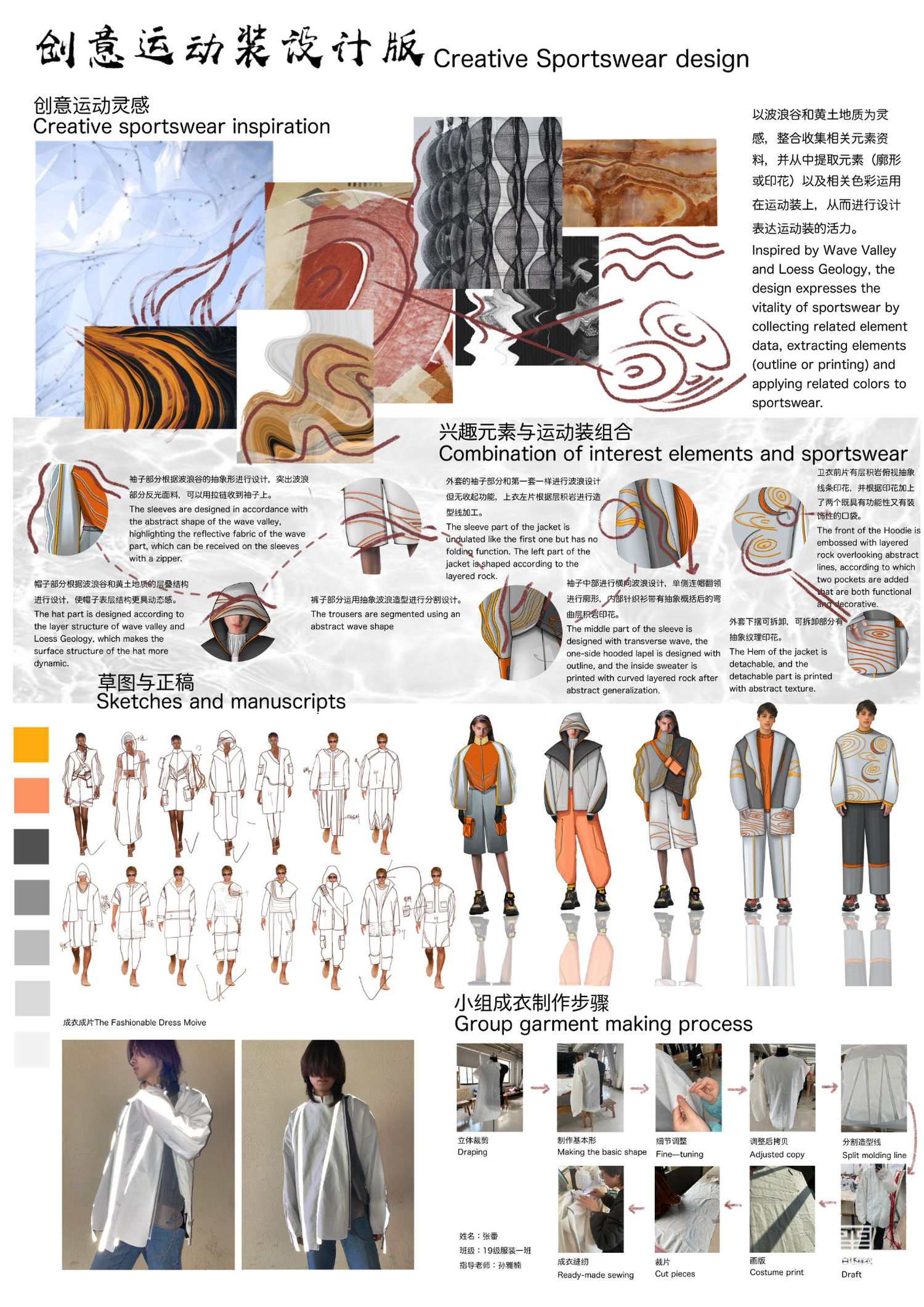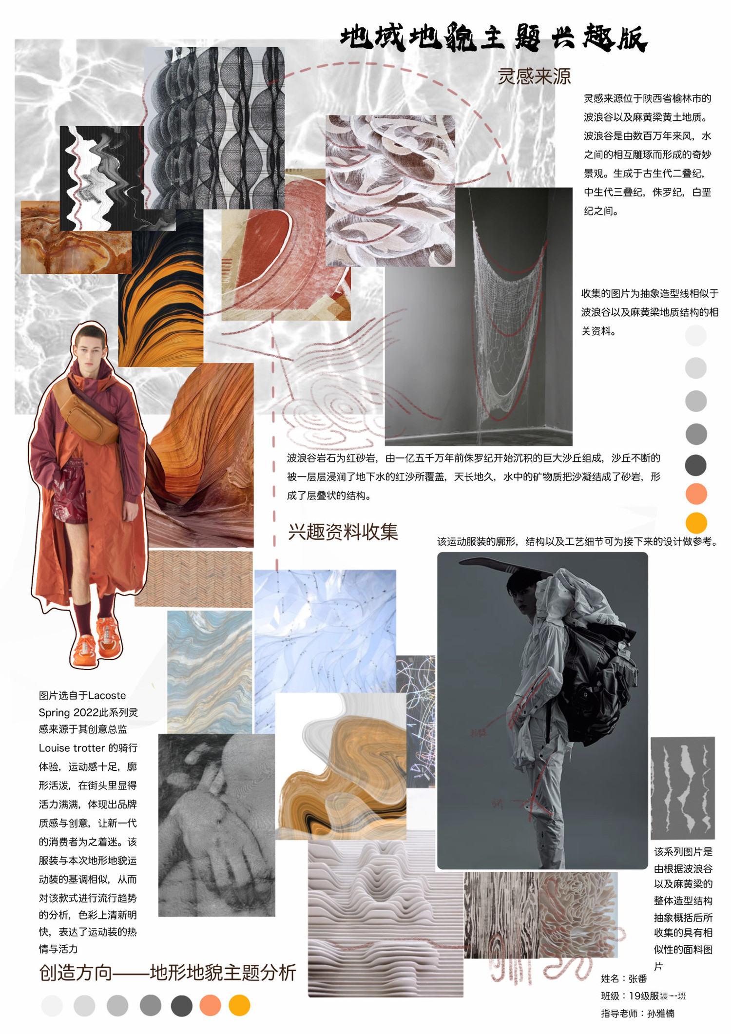 以波浪谷以及黄土地质为灵感,整合收集相关元素资料。进行提取抽象后运用到运动装的印花或廓形上。色彩上以橙、灰为主从而体现运动装的热情与活力。