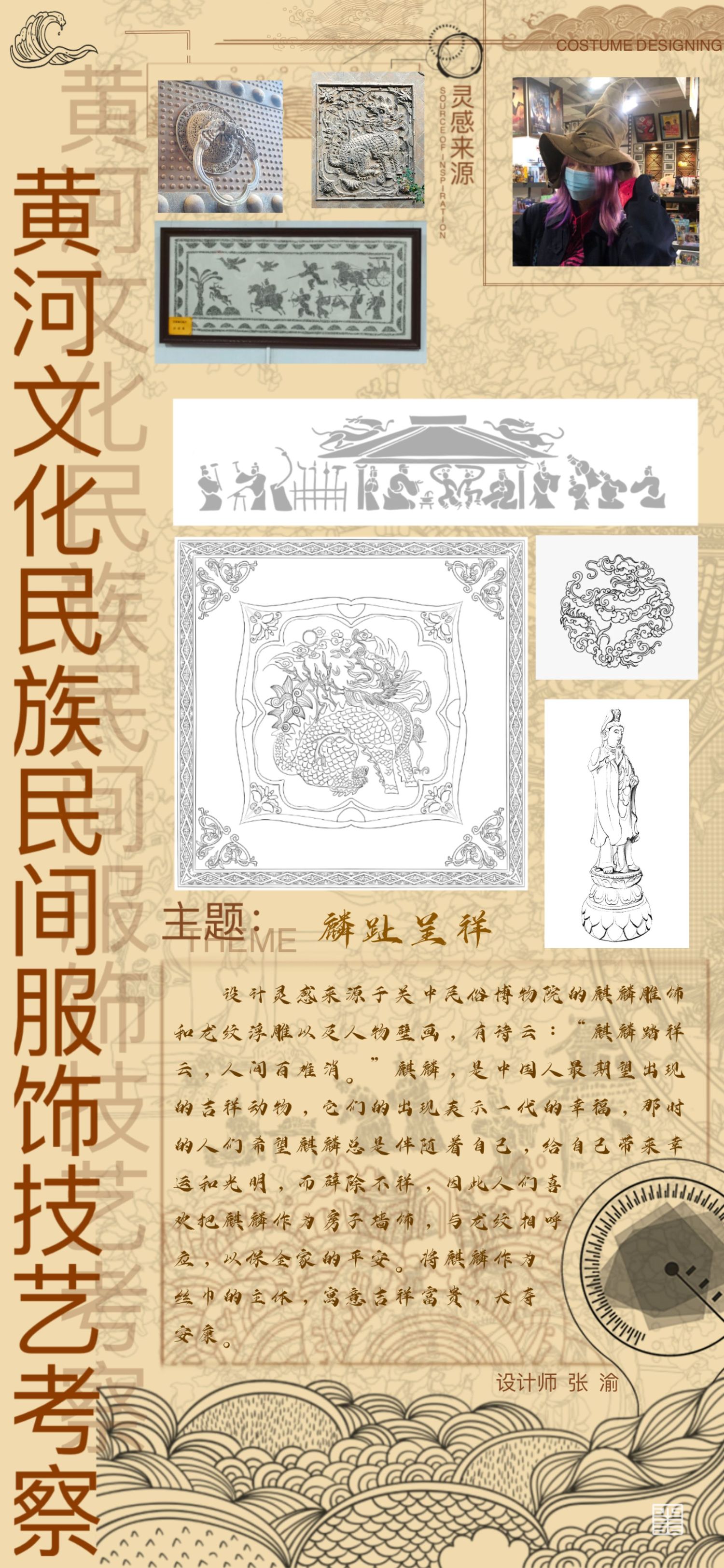 设计灵感来源于关中民俗博物院的麒麟雕饰和龙纹浮雕以及人物壁画,有诗云:“麒麟踏祥云,人间百难消。”麒麟,是中国人最期望出现的吉祥动物,它们的出现表示一代的幸福,那时的人们希望麒麟总是伴随着自己,给自己带来幸运和光明,而辟除不祥,因此人们喜欢把麒麟作为房子墙饰,与龙纹相呼应,以保全家的平安。将麒麟作为丝巾的主体,吉祥富贵,长寿安康。