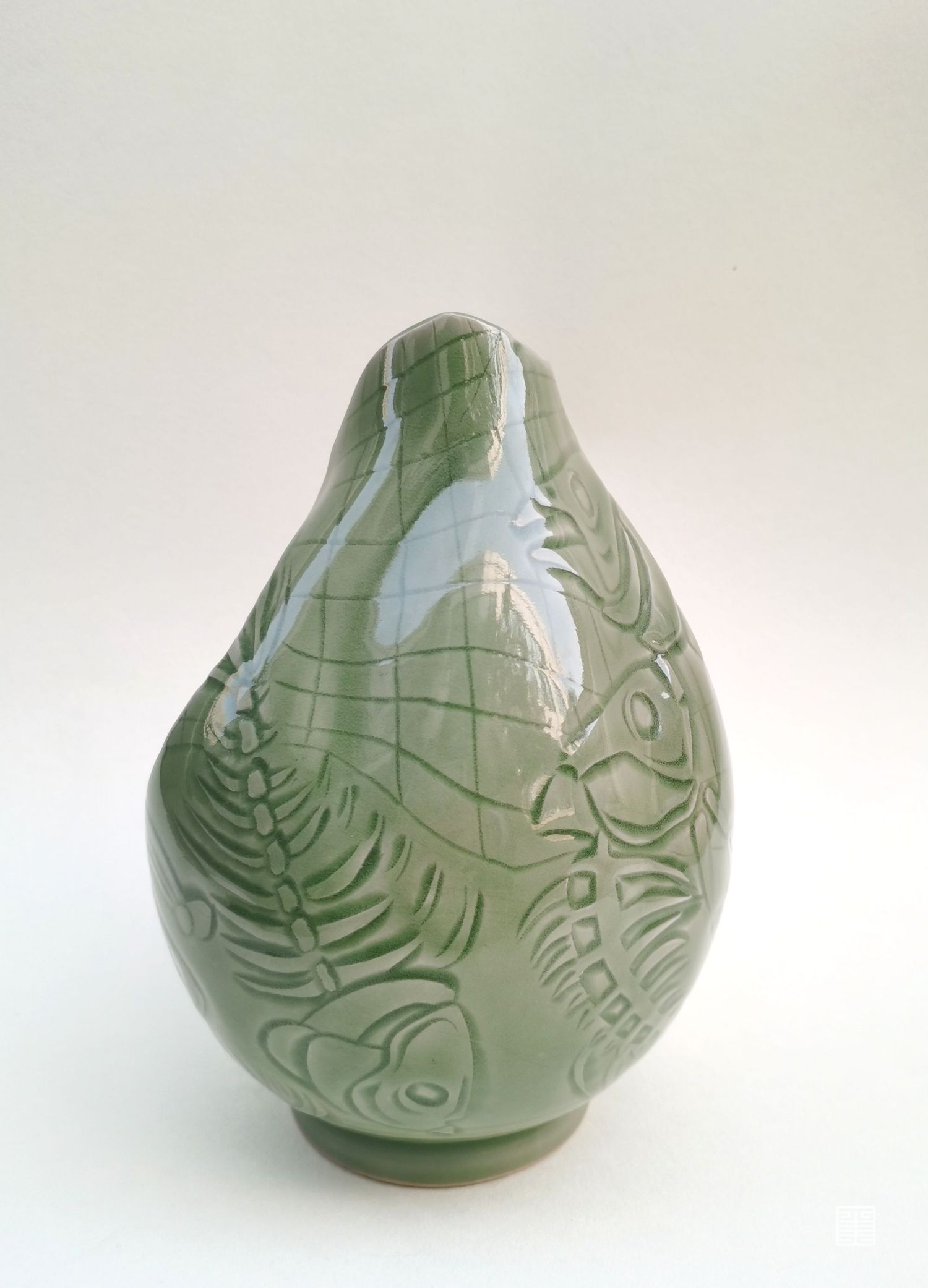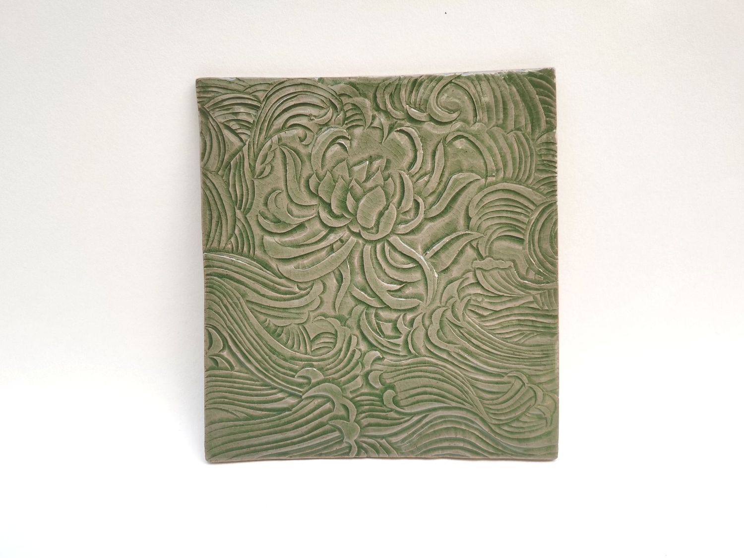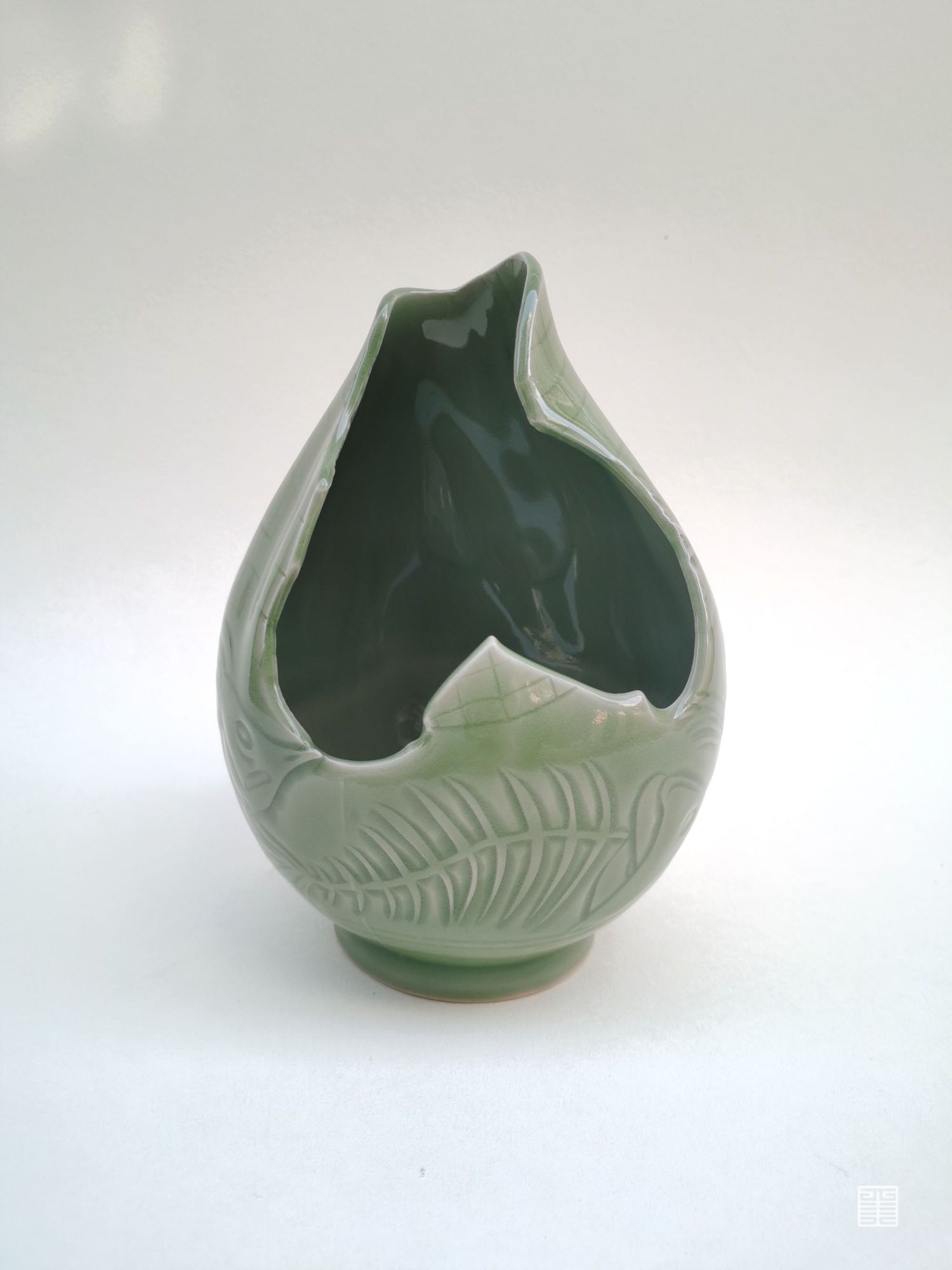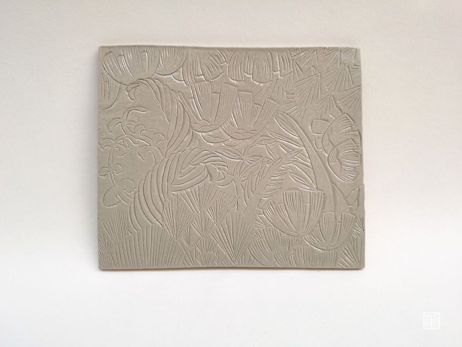 《无渔》是一件耀州窑刻花艺术与环保意识相结合的作品,此次在传统器型的基础上进行形变进行创作。《水中菊》和《林》是运用耀州窑刻花工艺的泥板作品。