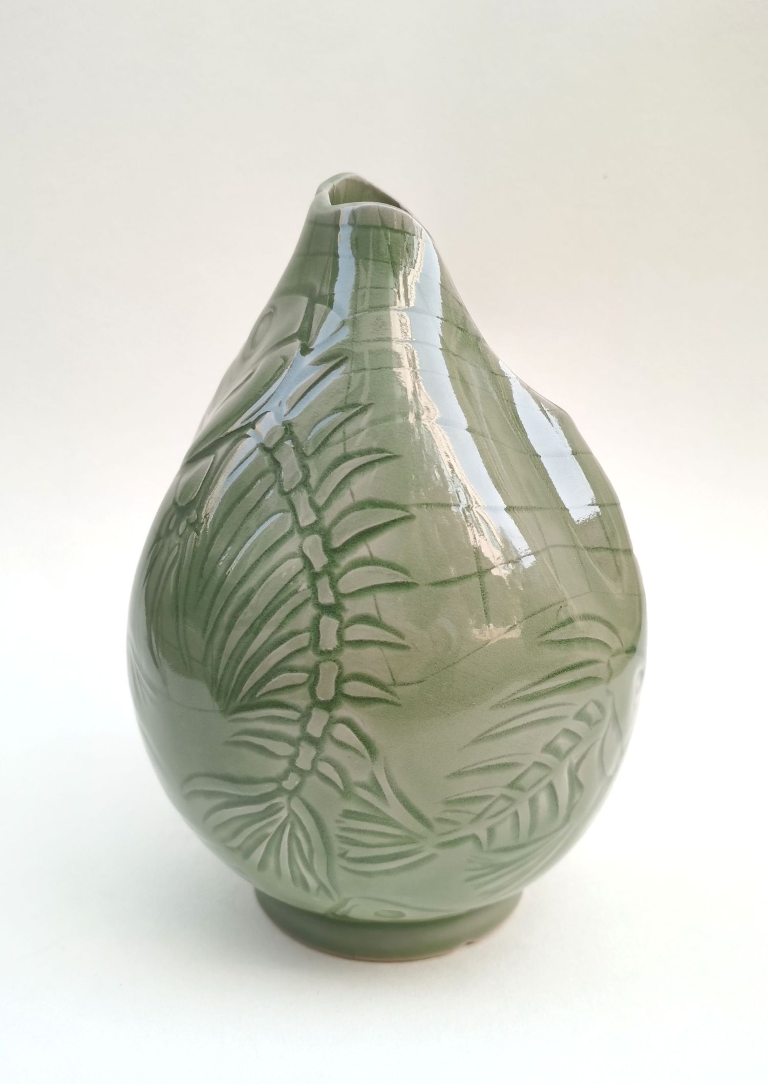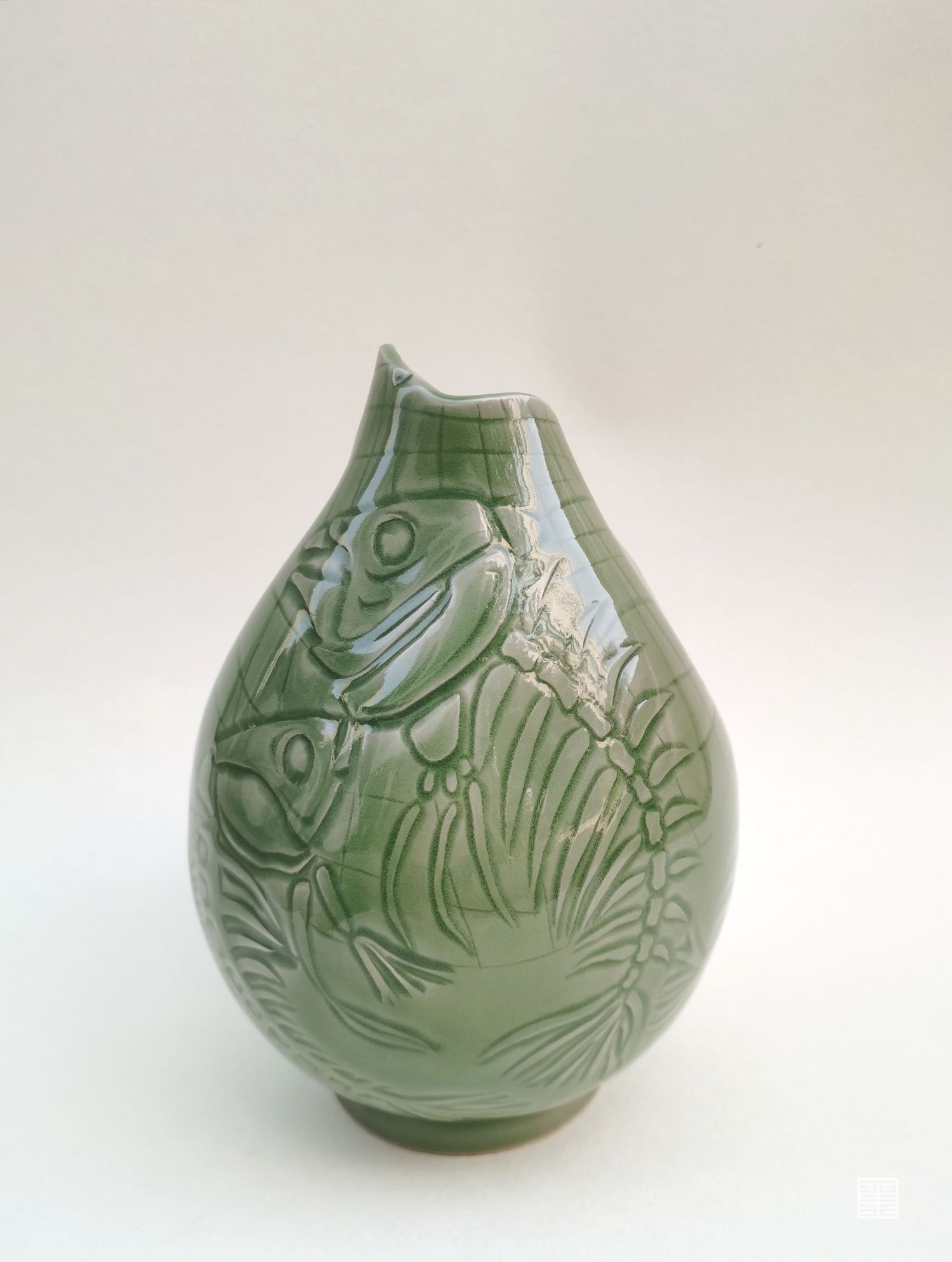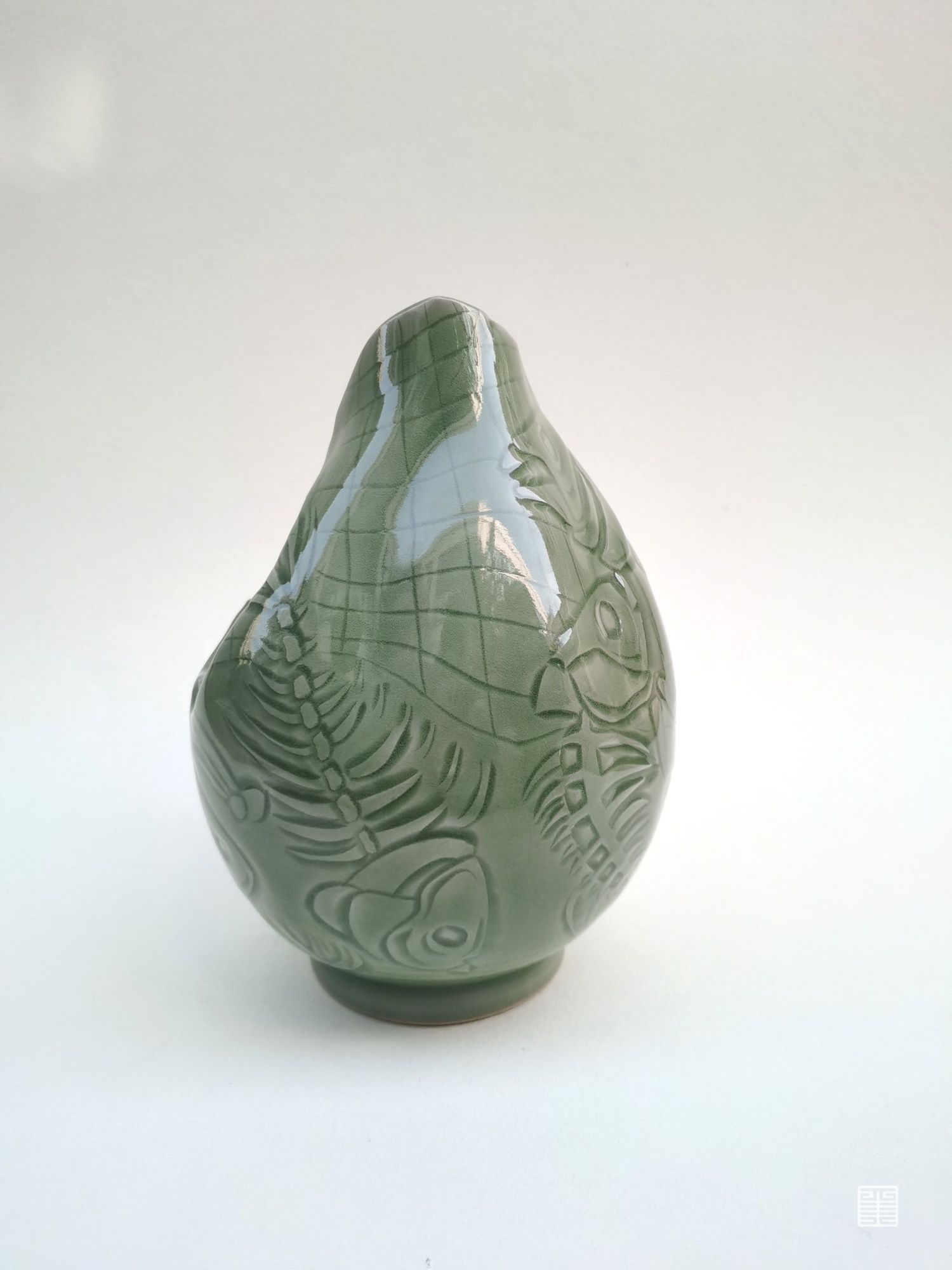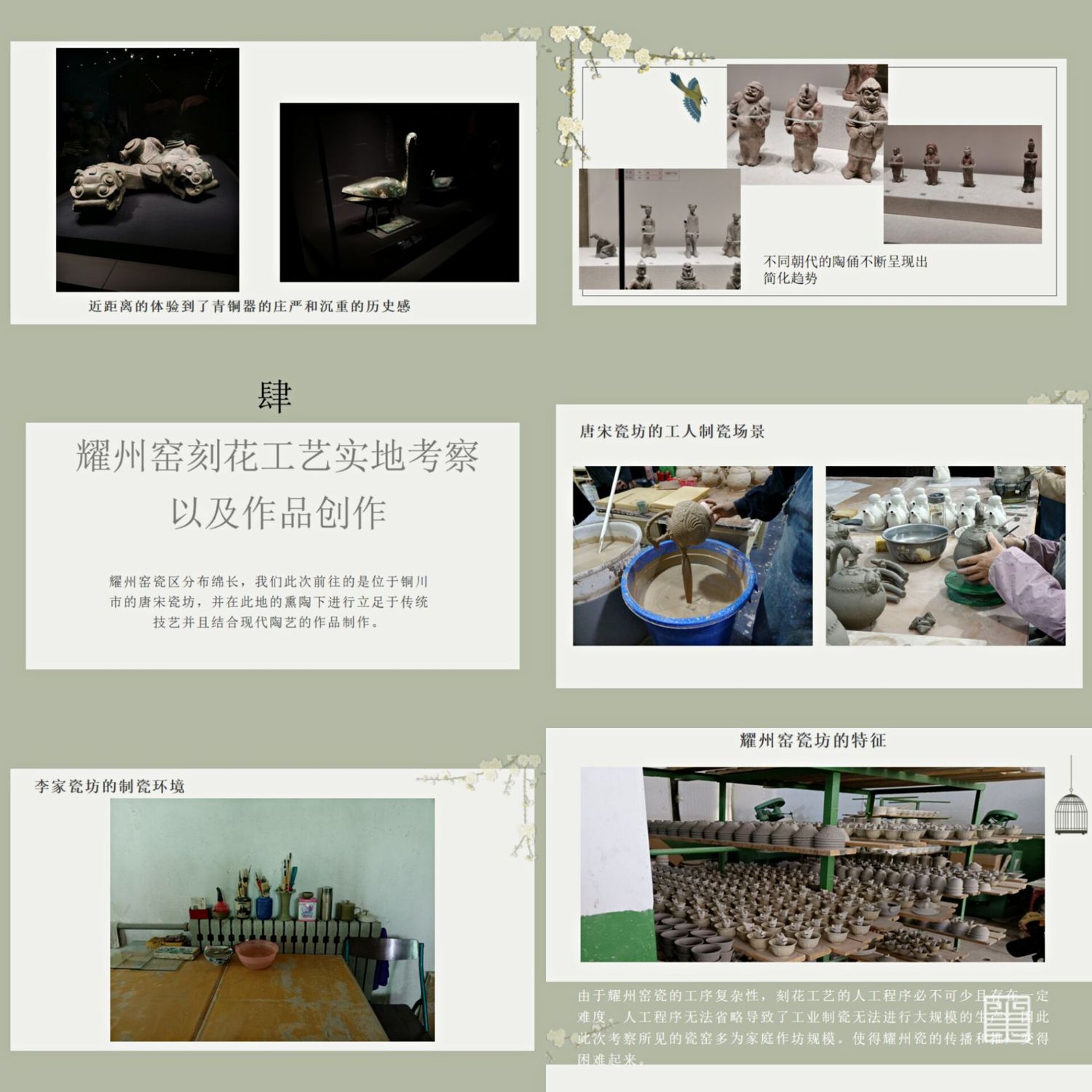《无渔》是一件耀州窑刻花艺术与环保意识相结合的作品,此次在传统器型的基础上进行形变进行创作。《水中菊》和《林》是运用耀州窑刻花工艺的泥板作品。