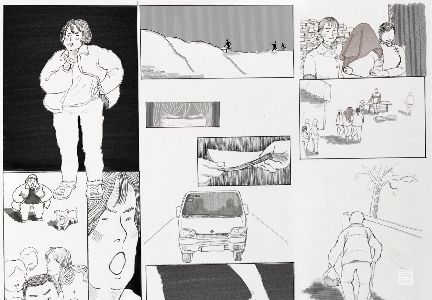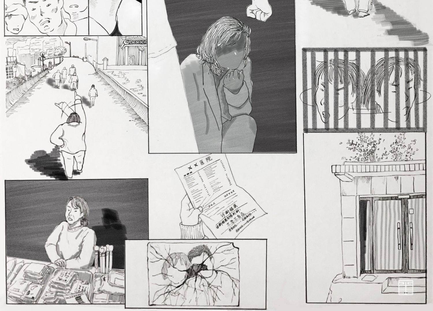 这个作品主角是一位“神经者”中年女性。当时向周围人询问关于她的情况的时候,几乎所有人都告诉我“别去找她,她是神经者,见人就骂,急了就打...”。直到我们和小卖部阿姨闲聊的时候才知道。她原本是富平人曾经有过一段很不幸的婚姻,她之所以变成现在这样疯疯癫癫和她的前夫有很大的关系。他们当初结婚后发现这个女人不能生育孩子,之后便开始对这个女人进行家暴,女人的精神受到了冲击才变成了现在这样,之后又被买到了枣前坪村,开始了第二段婚姻。起初这家人不知道这个女人是神经者,但纸是包不住火的总会被人知道。