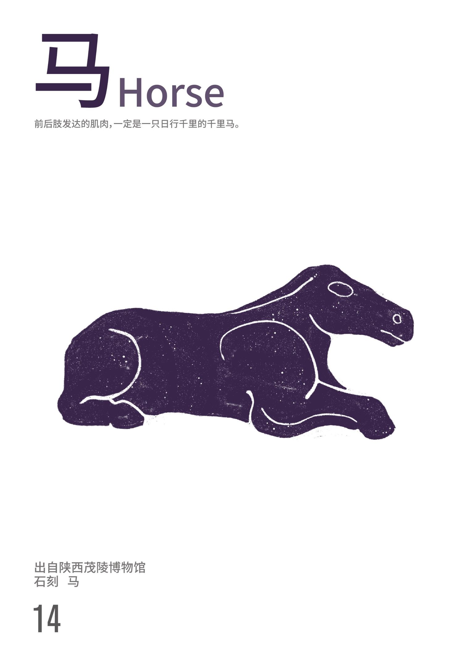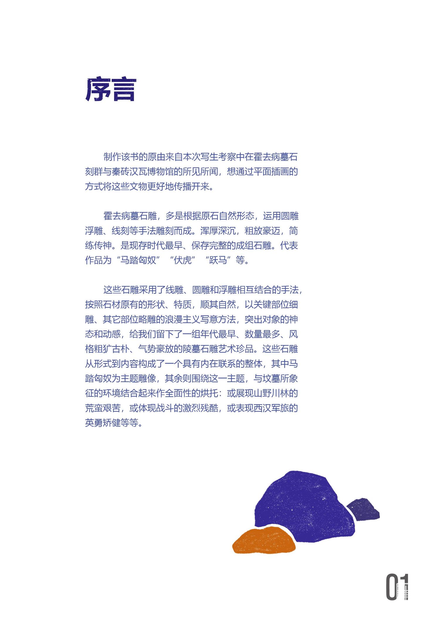 来自本次写生考察中在霍去病墓石刻群与秦砖汉瓦博物馆的所见所闻,想通过平面插画的方式将这些文物更好地传播开来,以一种温和的方法介绍古人们对造型的概括和提炼。霍去病墓石雕,多是根据原石自然形态,运用圆雕丶浮雕、线刻等手法雕刻而成。浑厚深沉粗放豪迈,简练传神。是现存时代最早、保存完整的成组石雕。