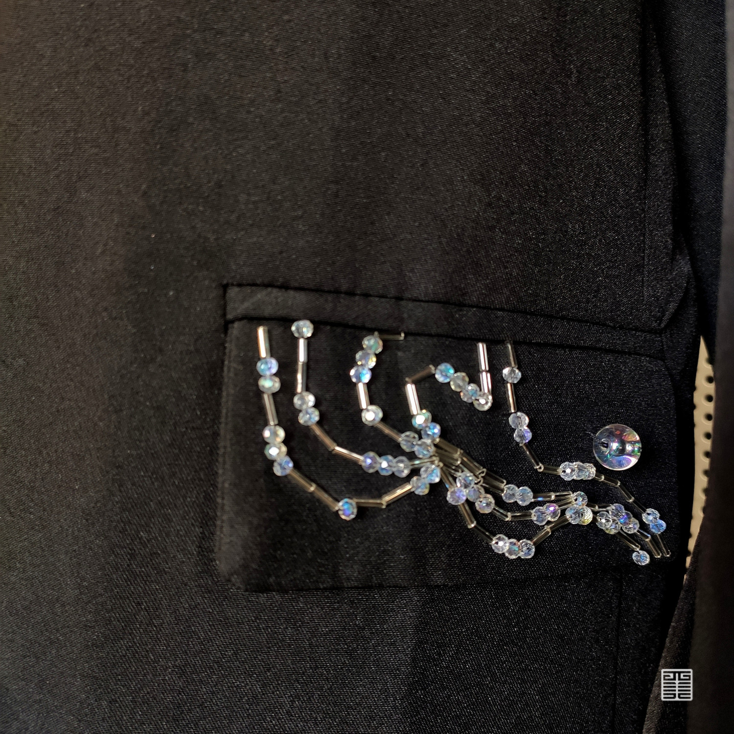 《期颐》指的是期颐之寿,服装上珠绣的图案纹样来自“关中民俗博物馆”中的寿石,寓意福寿安康,长寿的祝福。