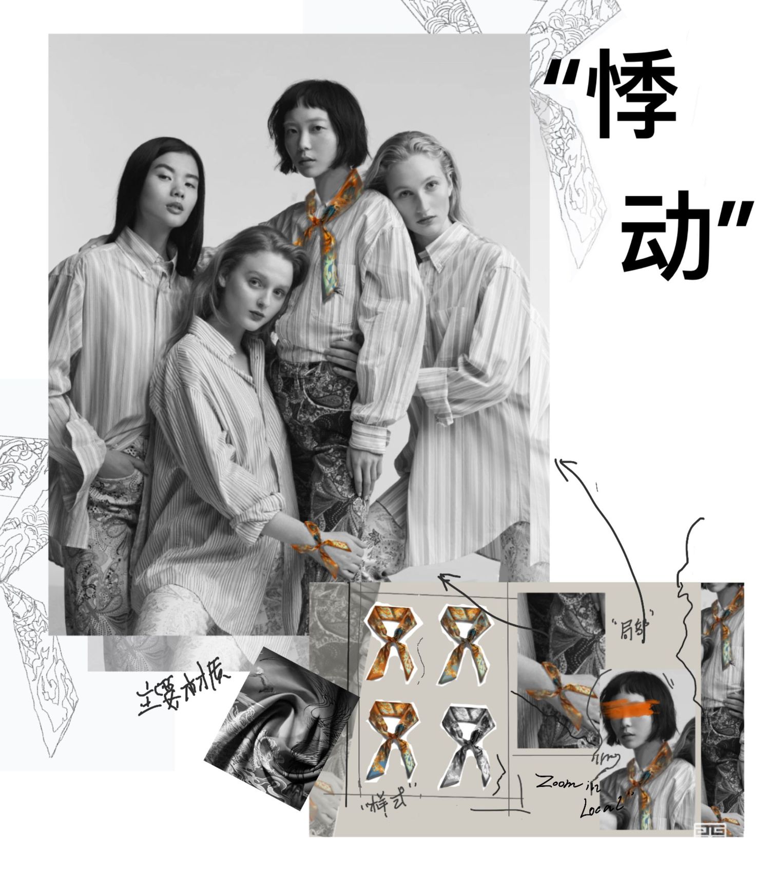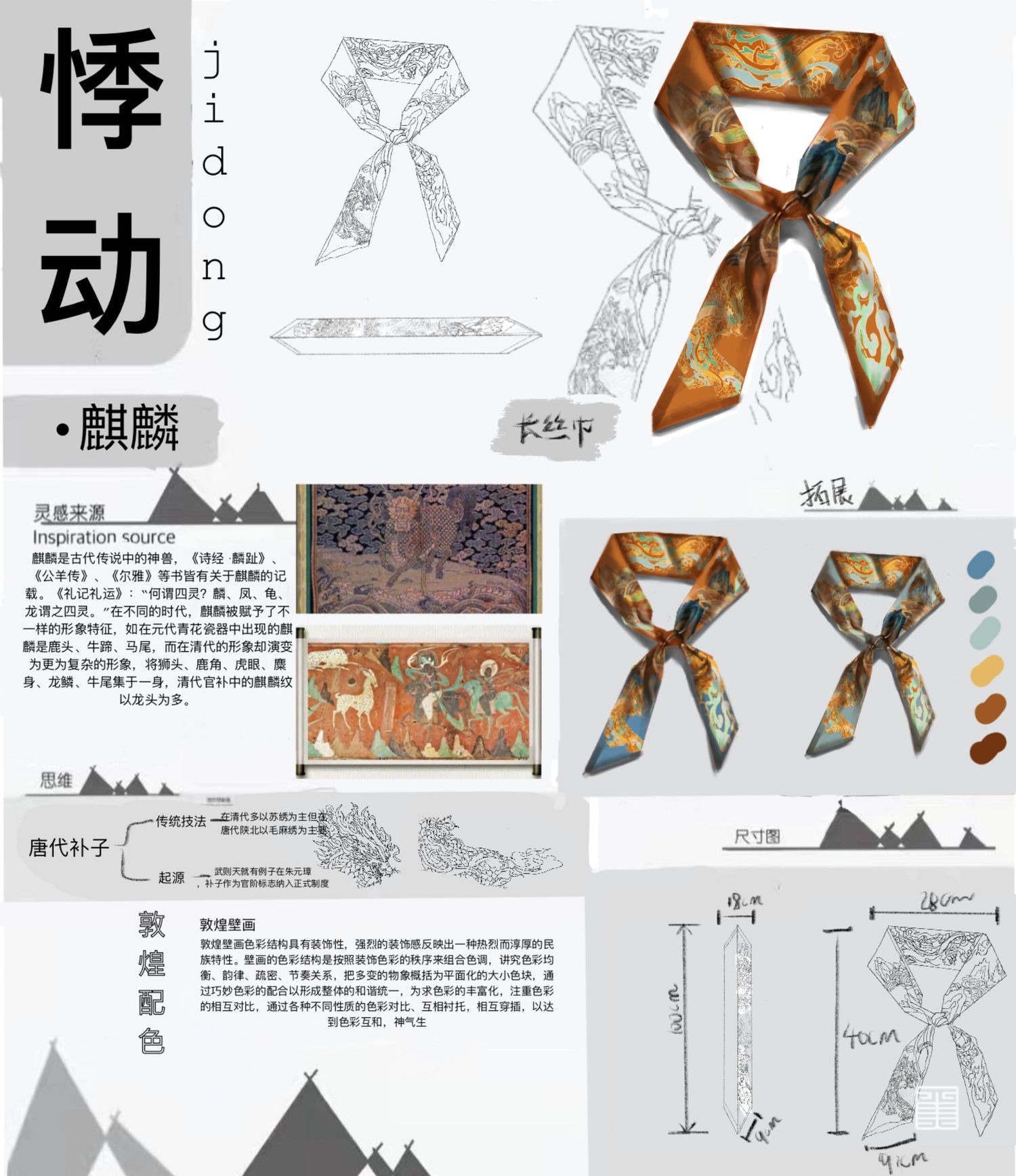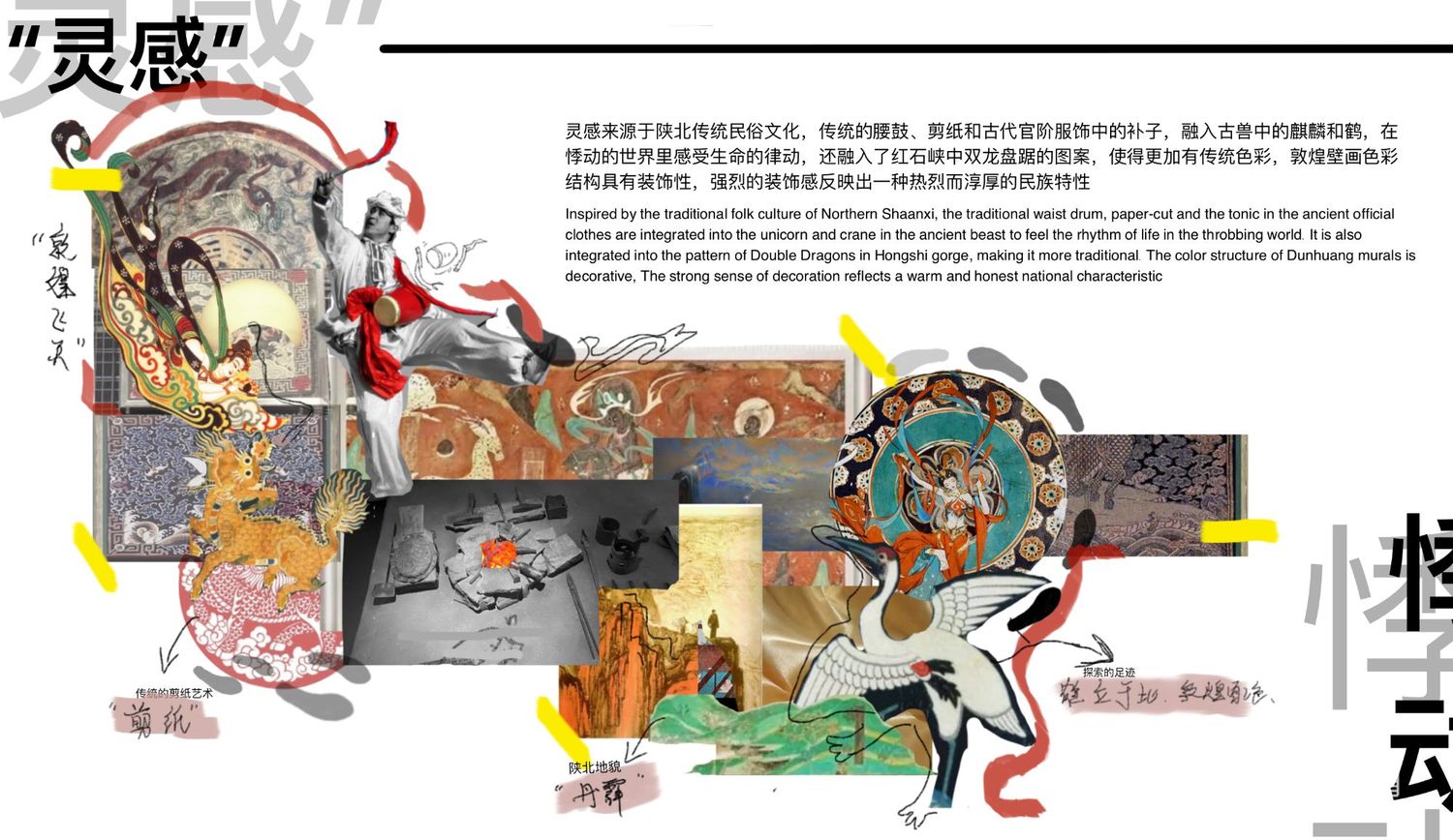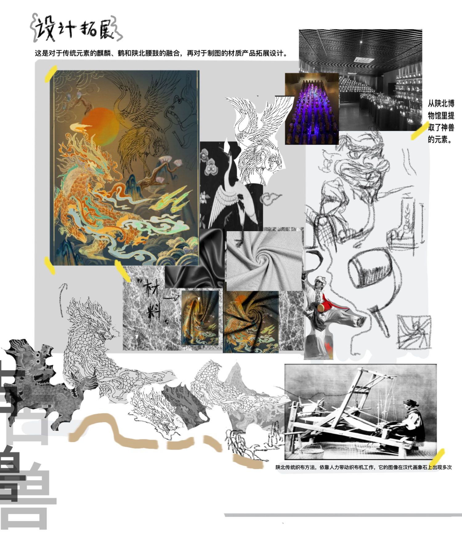 灵感来源于陕北传统民俗文化,、剪纸和古代官阶服饰中的补子,融入古兽中的麒麟和鹤,麒麟是古代传说中的神兽”在不同的时代,麒麟被赋予了不一样的形象特征,如在元代青花瓷器中出现的麒麟是鹿头、牛蹄、马尾,而在清代的形象却演变为更为复杂的形象,将狮头、鹿角、虎眼、麋身、龙鳞、牛尾集于一身,清代官补中的麒麟纹以龙头为多,仙鹤高雅圣洁且长寿,在古代是仙风道骨和长寿的象征,被赋予了忠贞清正、品德高尚的文化内涵。,在悸动的世界里感受生命的律动,还融入了红石峡中双龙盘踞的图案,使得更加有传统色彩,