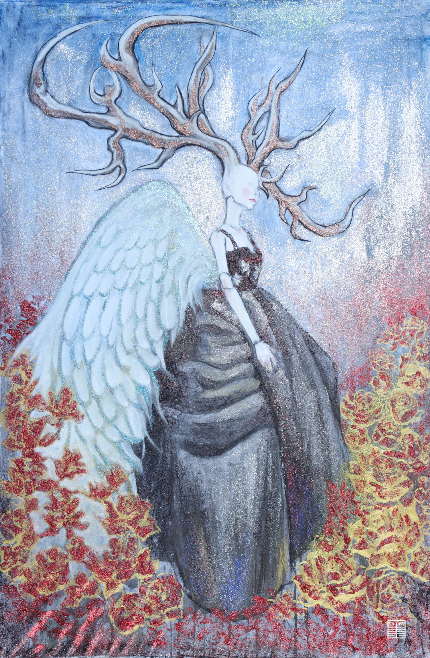 作品提现了当代女性融入自然的力量美,女子头顶长出象征雄性的鹿角,表现了反传统女性柔美的力量美,女性可以有纤细的外表但同样可以拥有刚强的内心。当今社会给了女子表现自己的机会展现自己的风采和魅力,张开自己的翅膀,与封建时期身不由己的女人们相比,我们的人生是那样绚烂多彩。