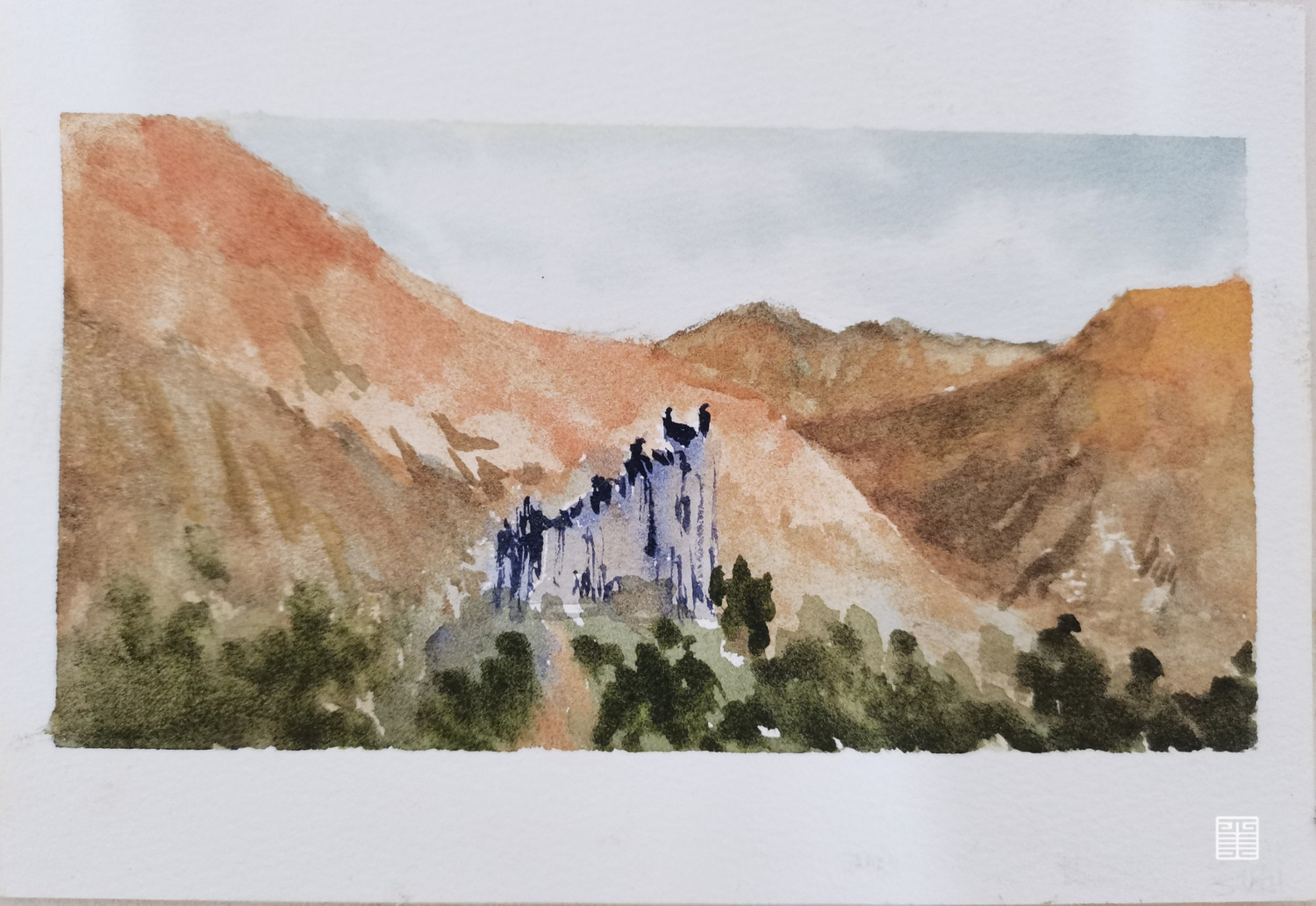丹霞地貌傍晚的山、树、老窑洞和一条弯弯的山路