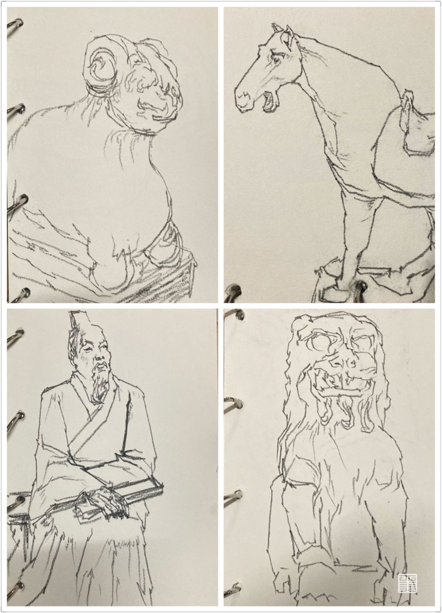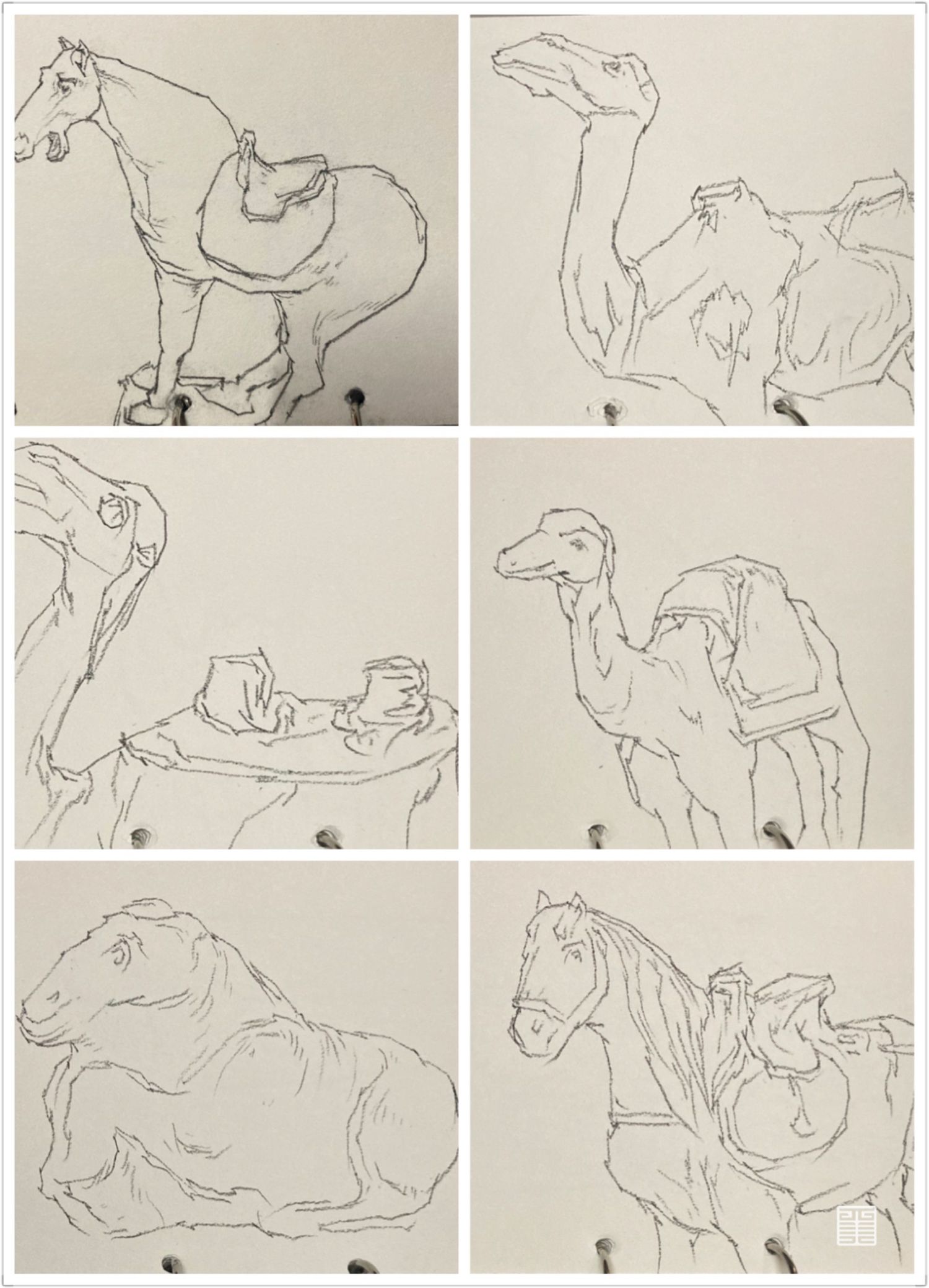 图1为根据考察所创作的文创作品,图2—4为考察报告,图5—6为考察期间部分速写。