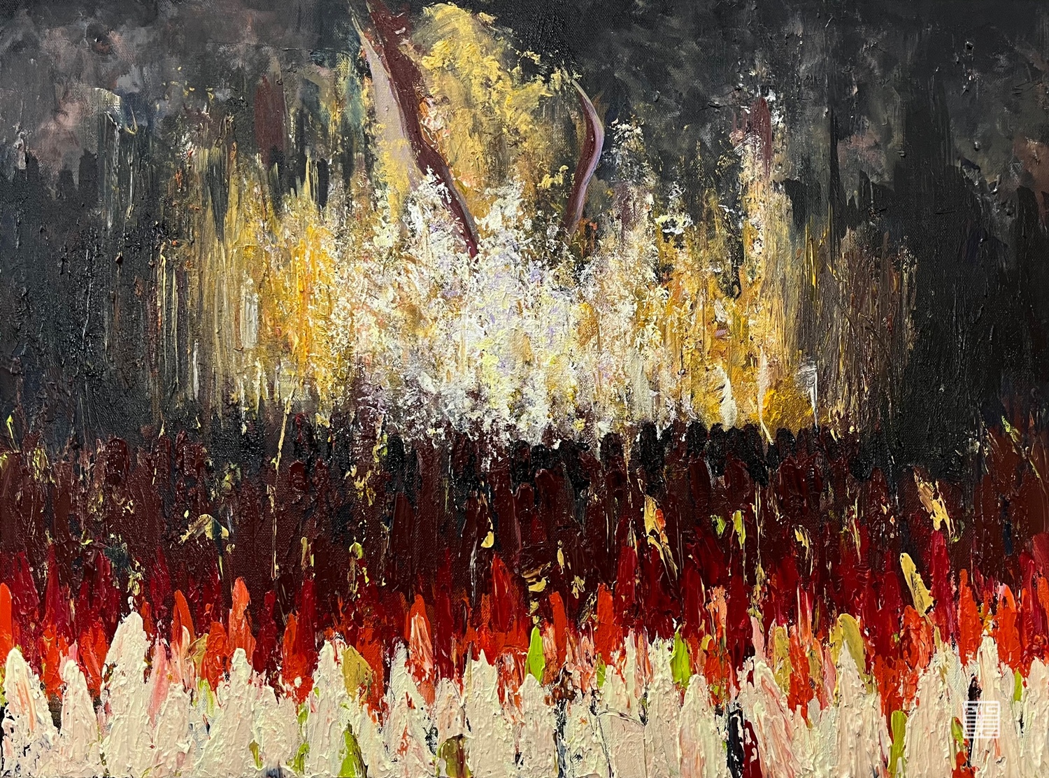 这幅作品的灵感来源于十四运开幕式点燃火炬的那一刻,美丽的焰火与众多的观众和演员形成的令人震撼和感动的绚丽的场景。说的是灯光和演员,舞台和观众,世界和人民的一种无形的关系,焰火是灯光是舞台是中国共产党是世界等等,它们有着不同的“观众”,它们的光芒散落出的星星点点,感染影响着无数,发出绚烂的色彩,为无数的事物人们带上“王冠”,最终散落在世界的各个角落。